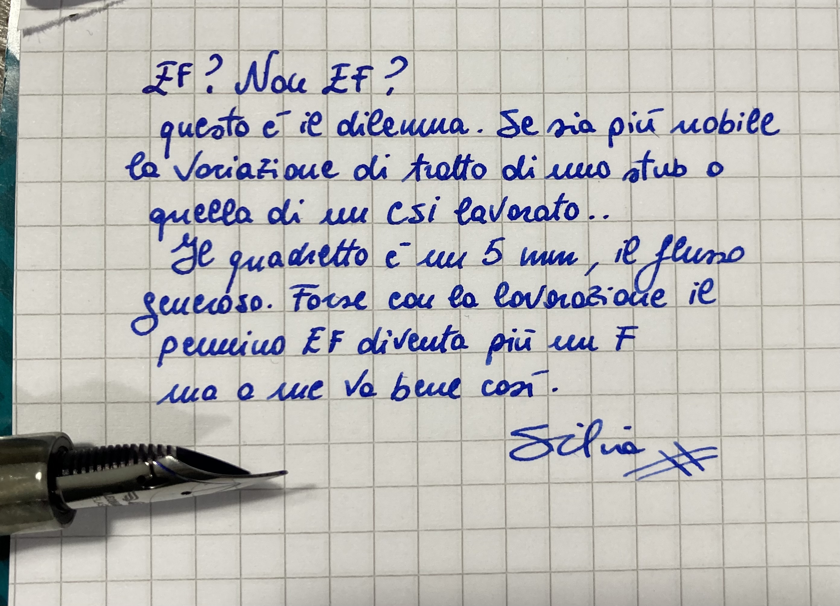 Ciao Simone, il CSI più "piccolo" che ho è tagliato da F, ma provo comunque a chiarire il tuo dubbio.piccardi ha scritto: ↑venerdì 9 febbraio 2024, 20:45 Io ho chiesto un chiarimento da chi li usa sui pennini CSI su base EF attuali, e gradirei si restasse in tema, visto poi che il fuori tema ha assunto toni sgradevoli (i relativi messaggi son stati rimossi e non ne saranno tollerati altri).