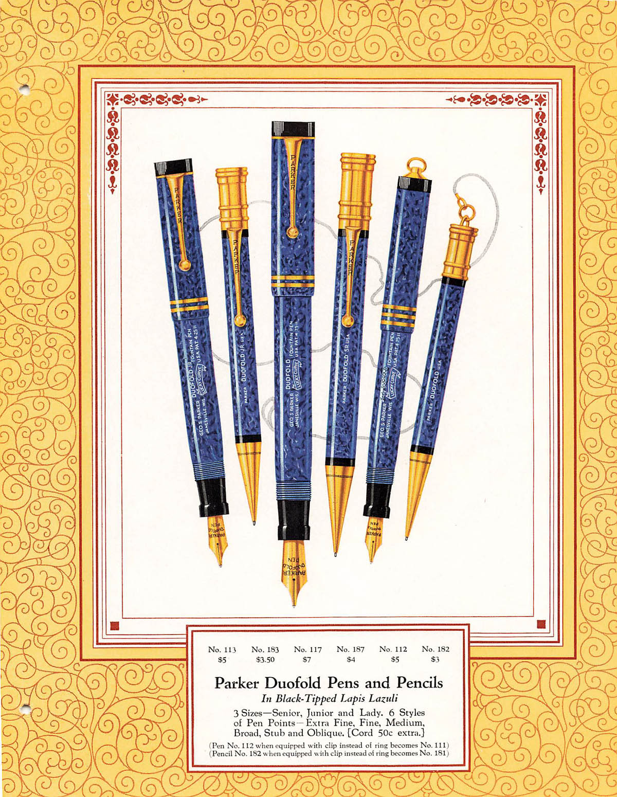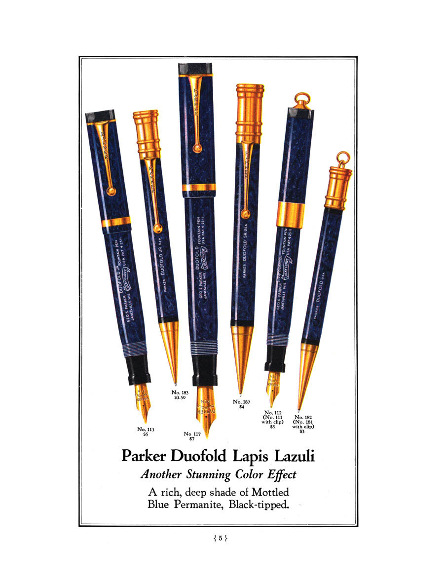 Nel blu delle Duofold (nome commerciale LAPIS LAZULI) la differenza è senza dubbio meglio visibile dal vivo: nella celluloide del 1927, ribattezzata "blue on blue", vi è solo un blu scuro (deep shade), quasi nero, con effetto "mottled" (ovvero "variegato, chiazzato, maculato") su un blu più chiaro. Questa versione è più rara e non particolarmente soggetta a viraggio.