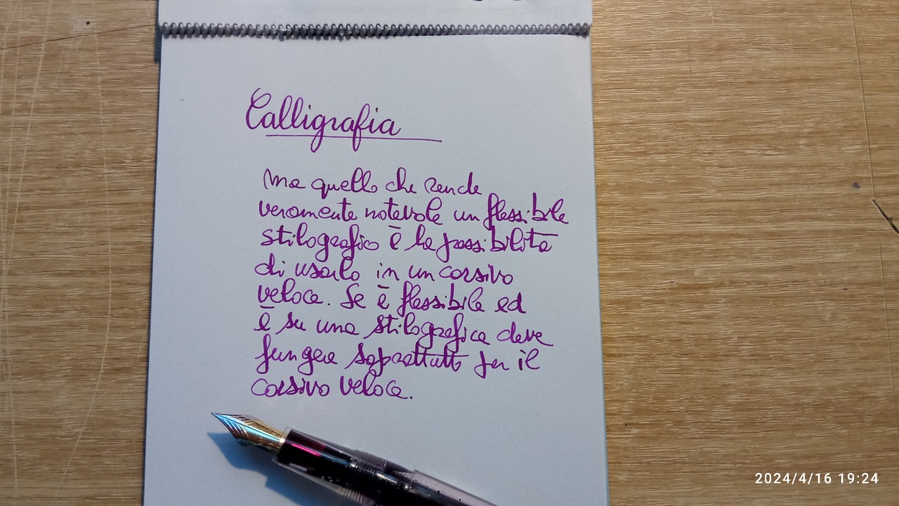 Condivido in pieno. Sul pennino Pilot FA ho letto e visto meraviglie.Koten90 ha scritto: ↑martedì 16 aprile 2024, 23:37 Più scorrevolezza significa necessariamente punta più rotonda che fa gli spigoli meno definiti e il tratto in luce meno fine. Per quanto riguarda il corsivo normale, è quello a cui arrivi potendo far correre la penna, un’evoluzione di quello “da bambino”. I fine-grosso che si vedono nel tuo esempio sono quasi inevitabili con la 912 FA senza fare pressione: la variazione di tratto viene naturalmente solo con il trascinamento della penna e scrivendo mediamente leggero