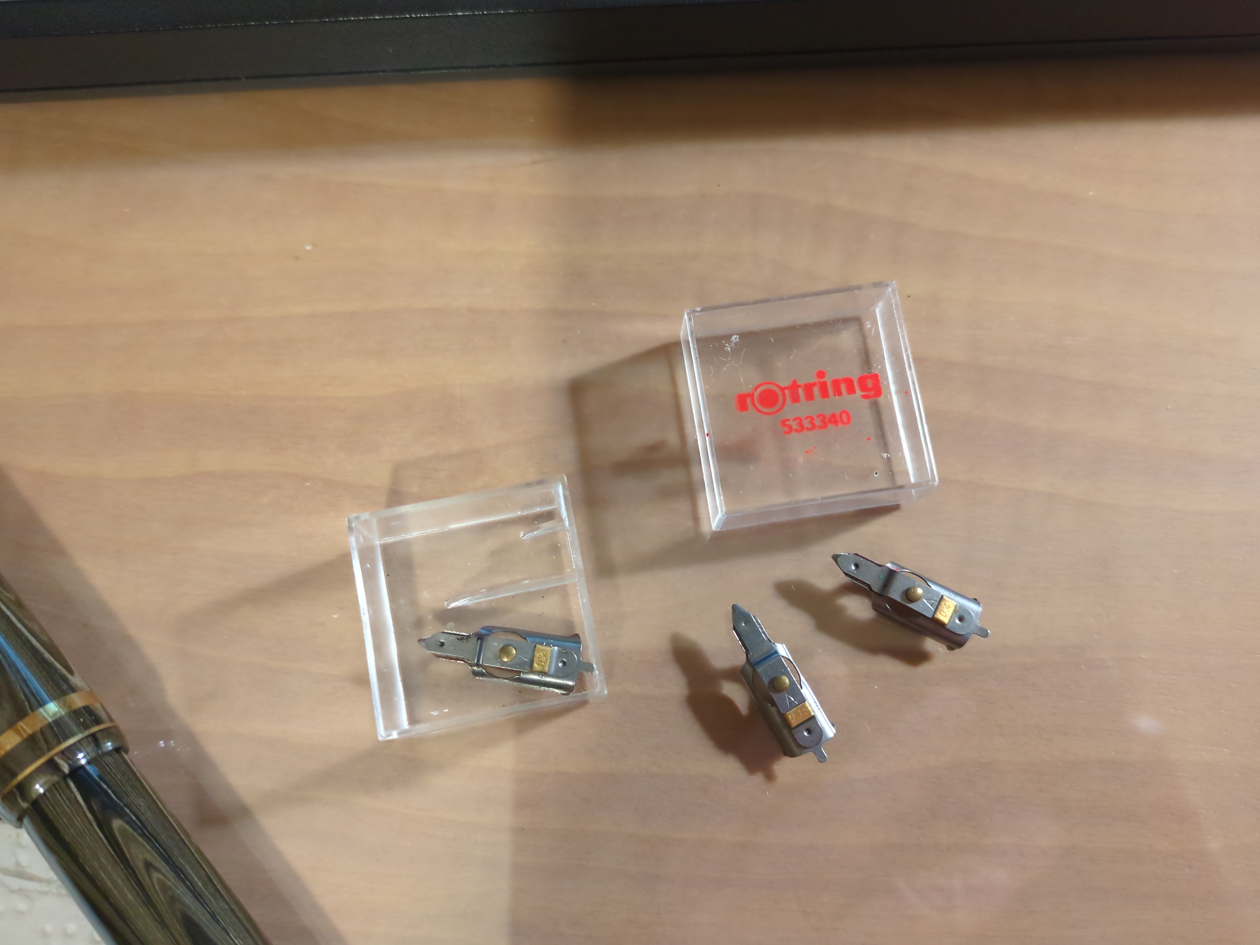 Nella foto si vedono anche una gomma (Rotring T70) per inchiostro di china su carta lucida e un "pappagallo" (sulla destra della scatolina rossa) ovvero un particolare supporto che consente di "montare" un rapidografo su un compasso.
