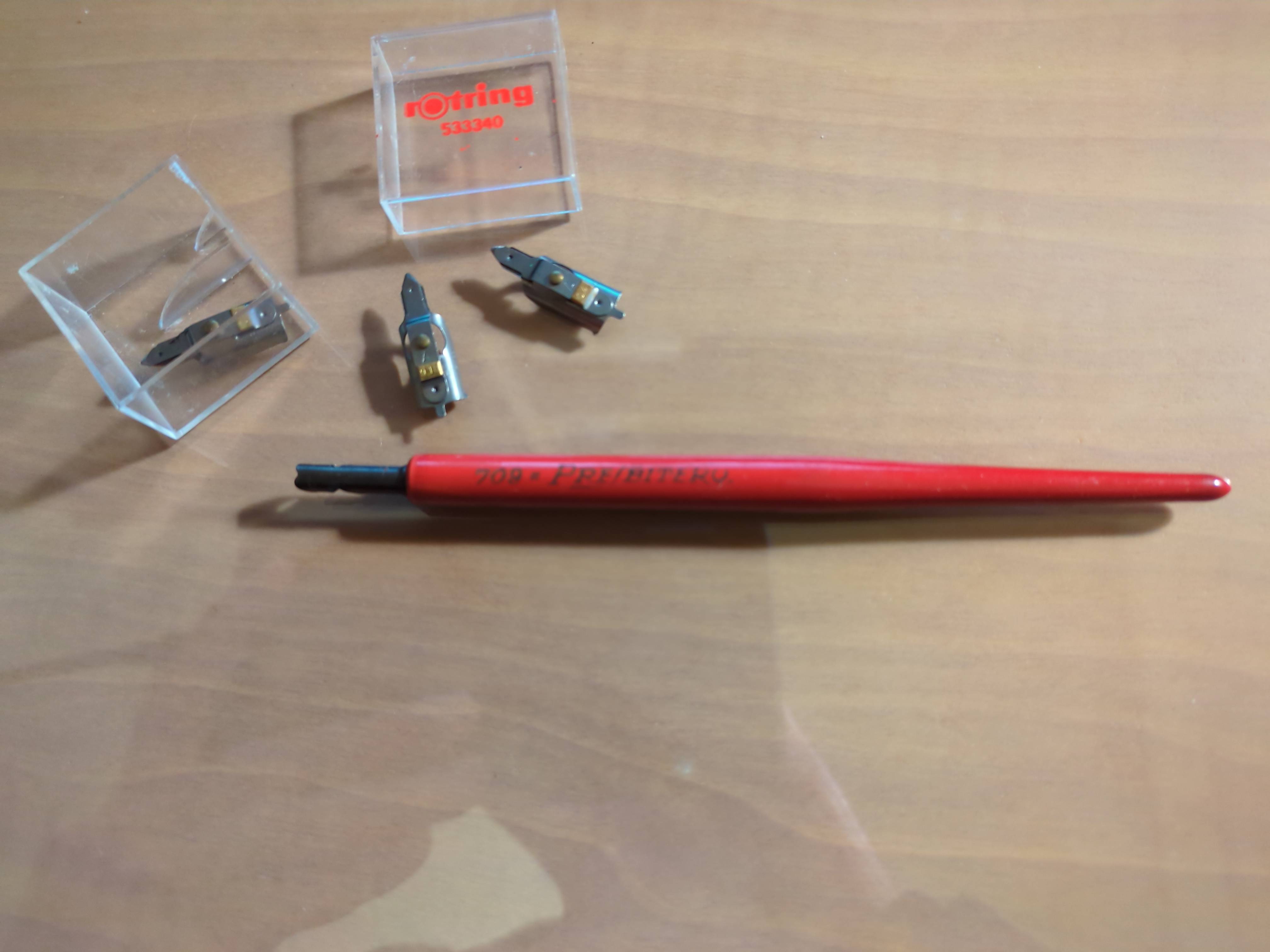 Nella foto si vedono anche una gomma (Rotring T20) per inchiostro di china su carta lucida e un "pappagallo" (sulla destra della scatolina rossa) ovvero un particolare supporto che consente di "montare" un rapidografo su un compasso.