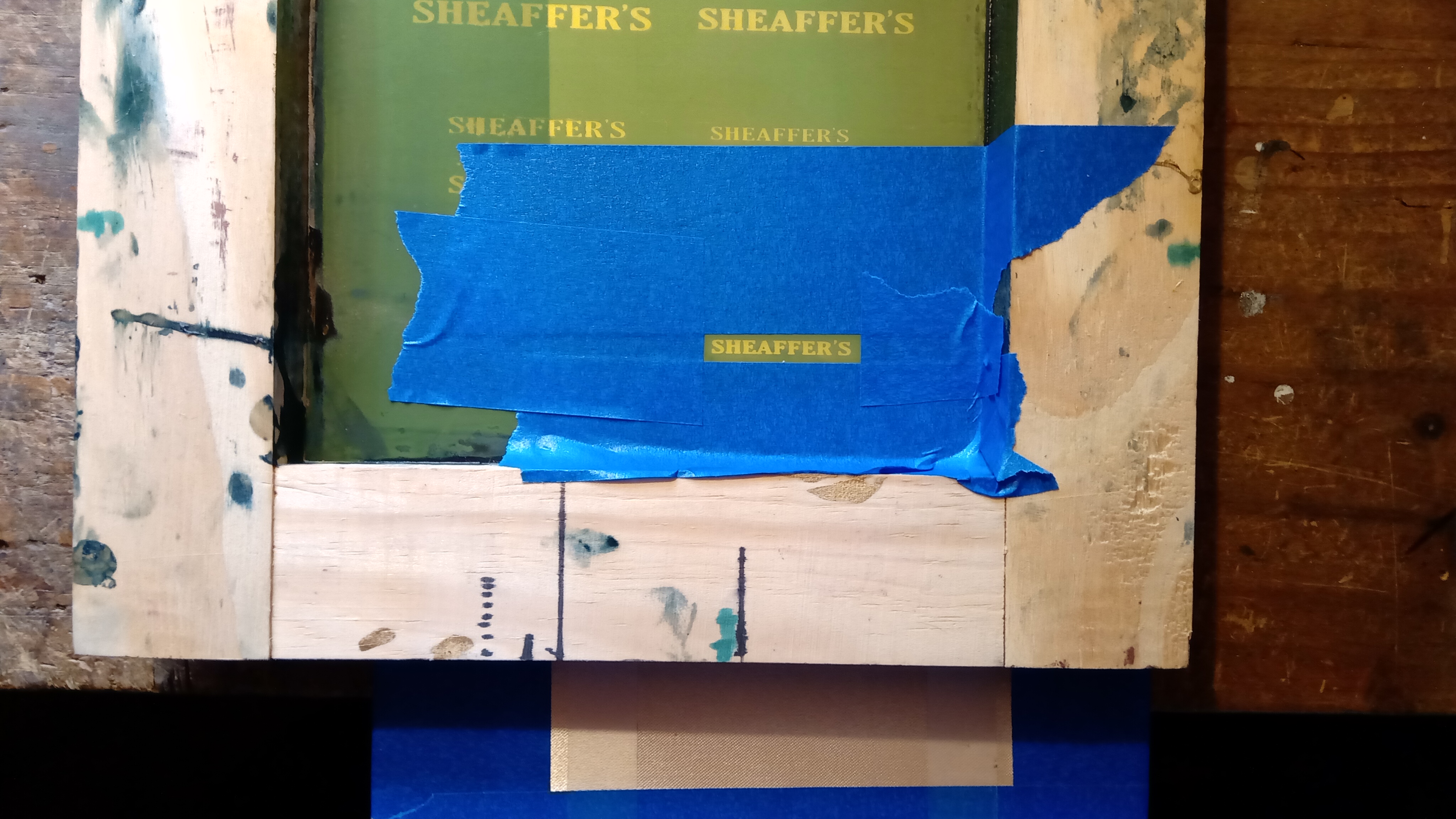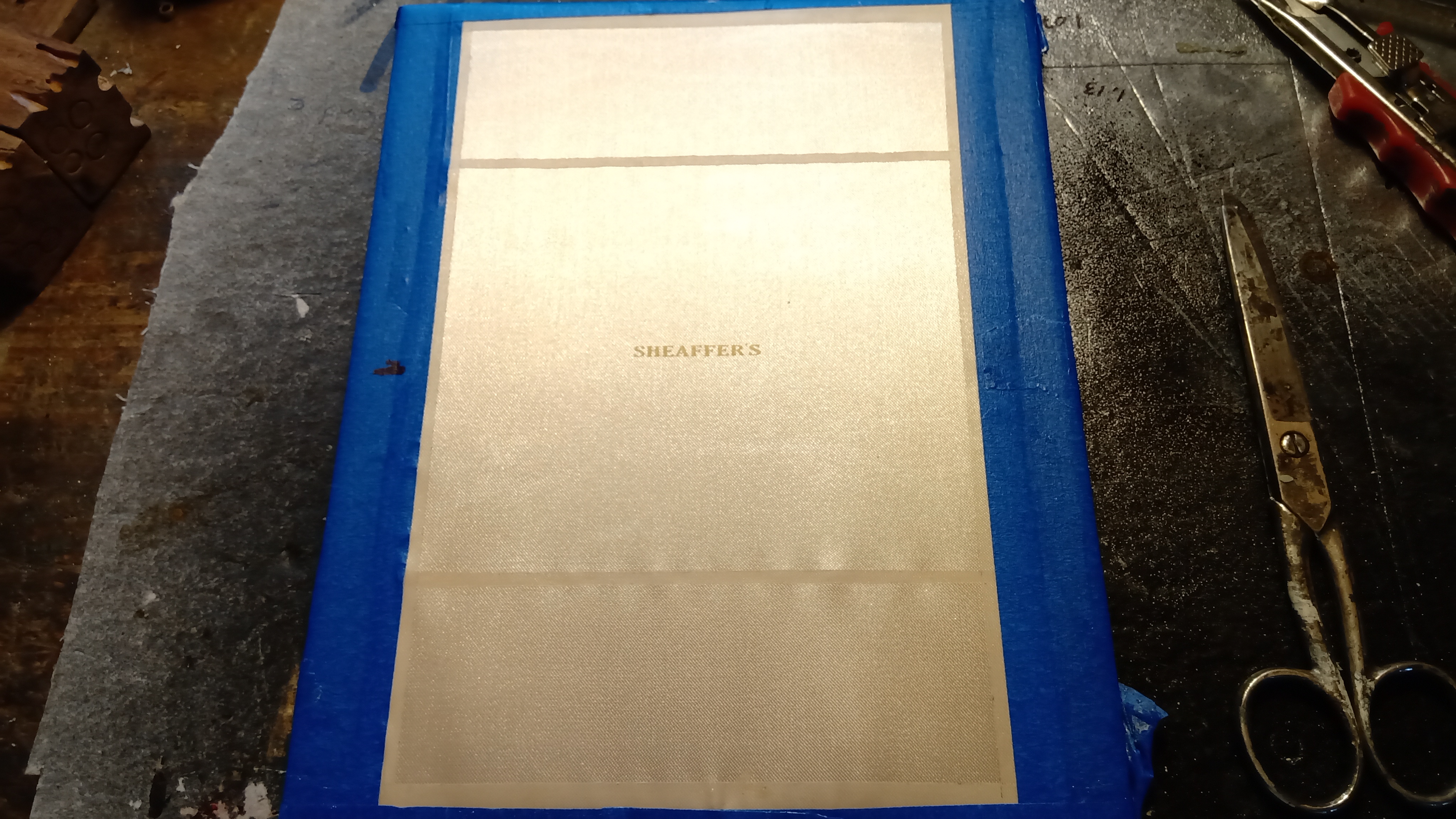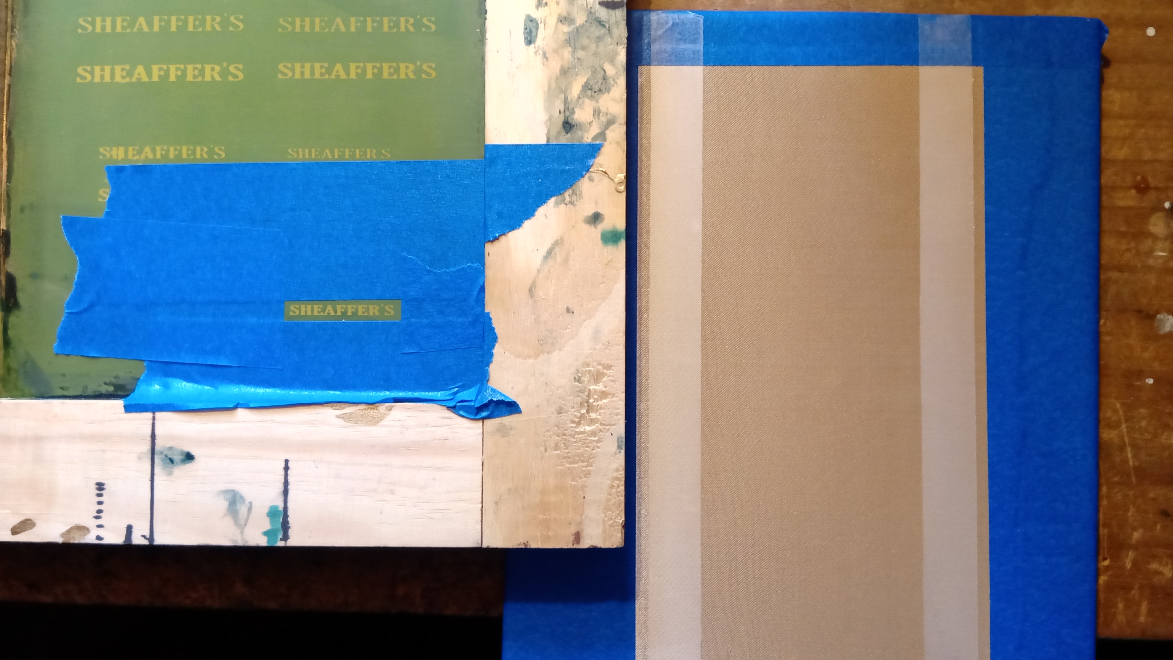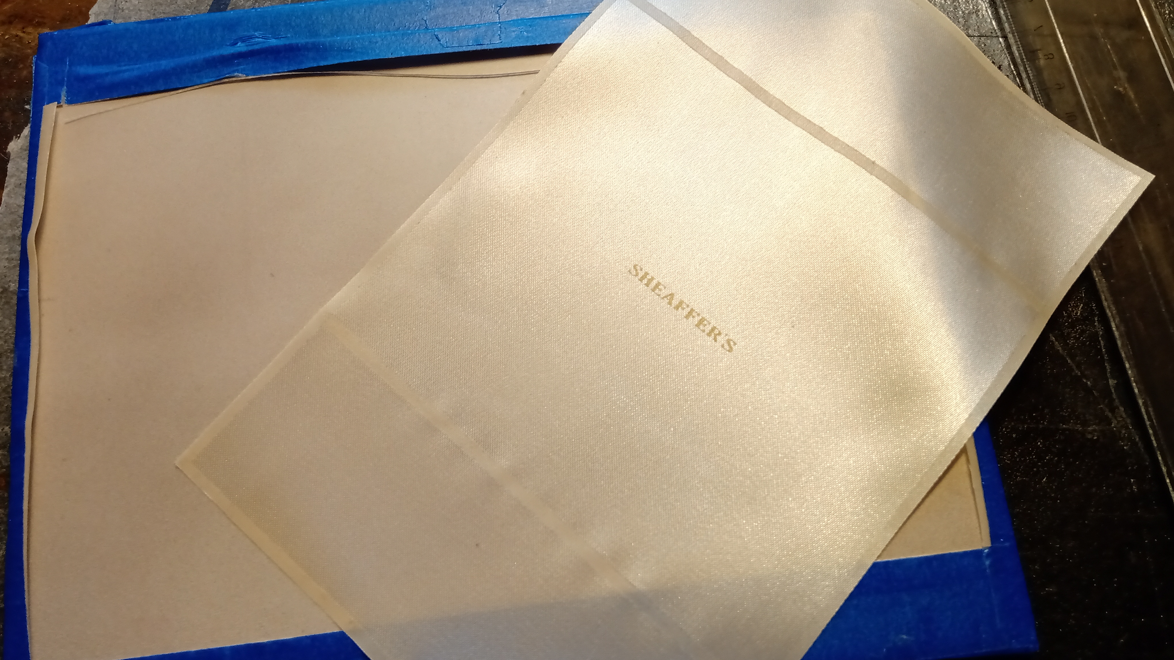 Para ello imprimimos con tinta vinílica bronce y con el método serigráfico, la tela de raso que usaremos y que ha sido previamente tensada en una superficie plana...