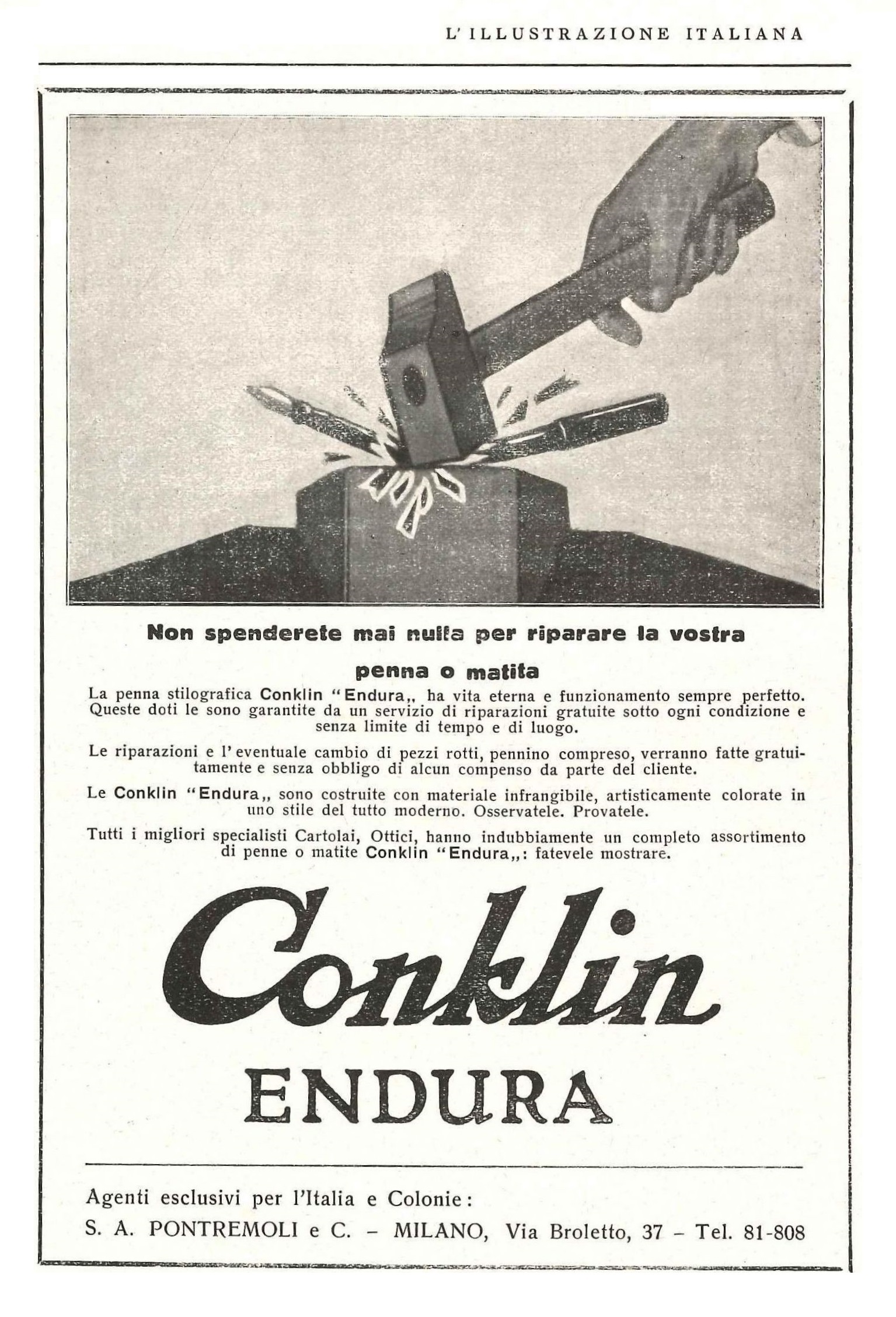 CONKLIN - Endura - 1930-03-09. L'Illustrazione Italiana - Anno LVII - N.10, pag.378. Sempre esilaranti gli strapazzamenti ai quali vengono sottoposte le mitiche stilografiche Endura dai sadici pubblicitari assoldati dalla Conklin...