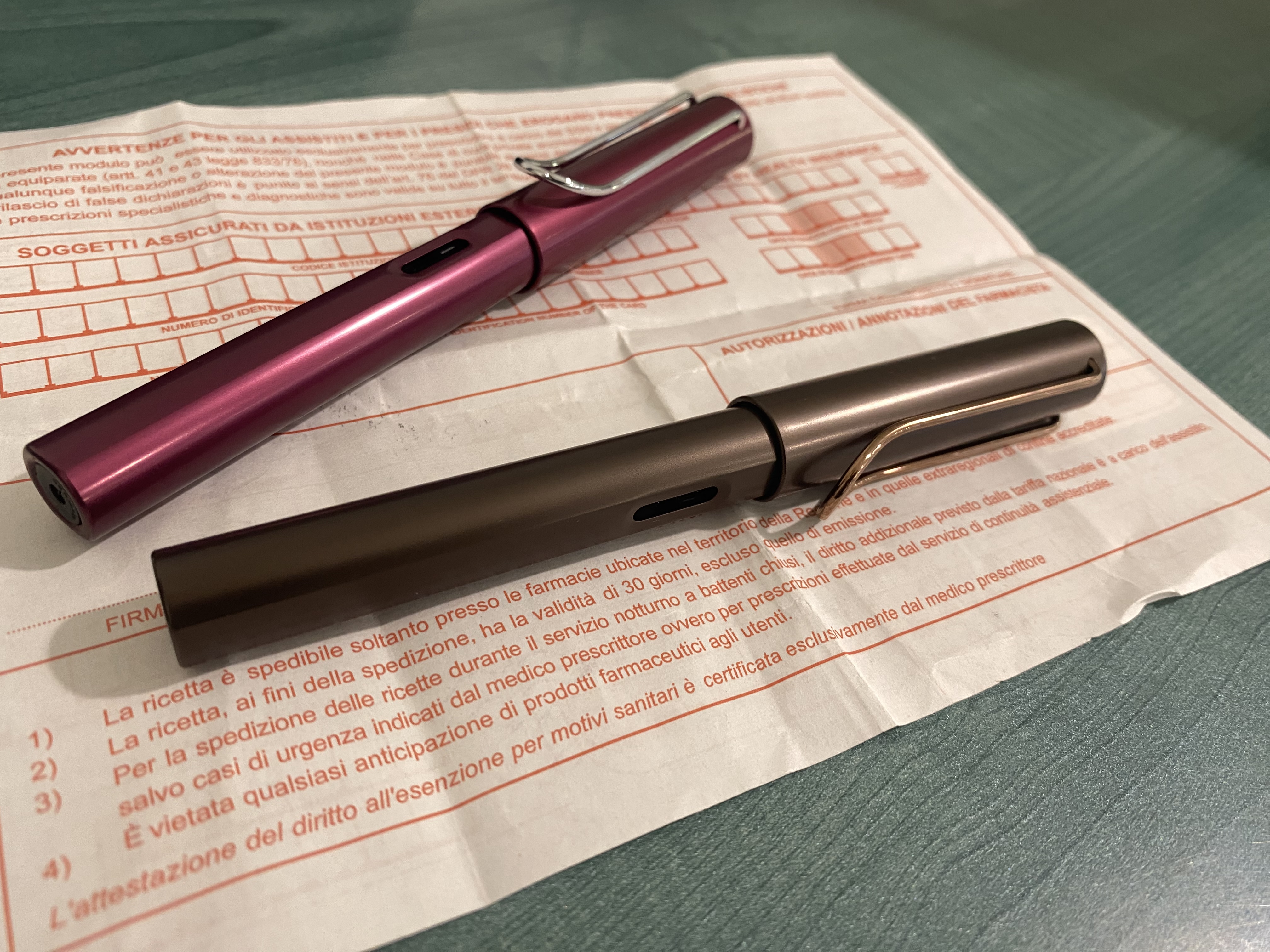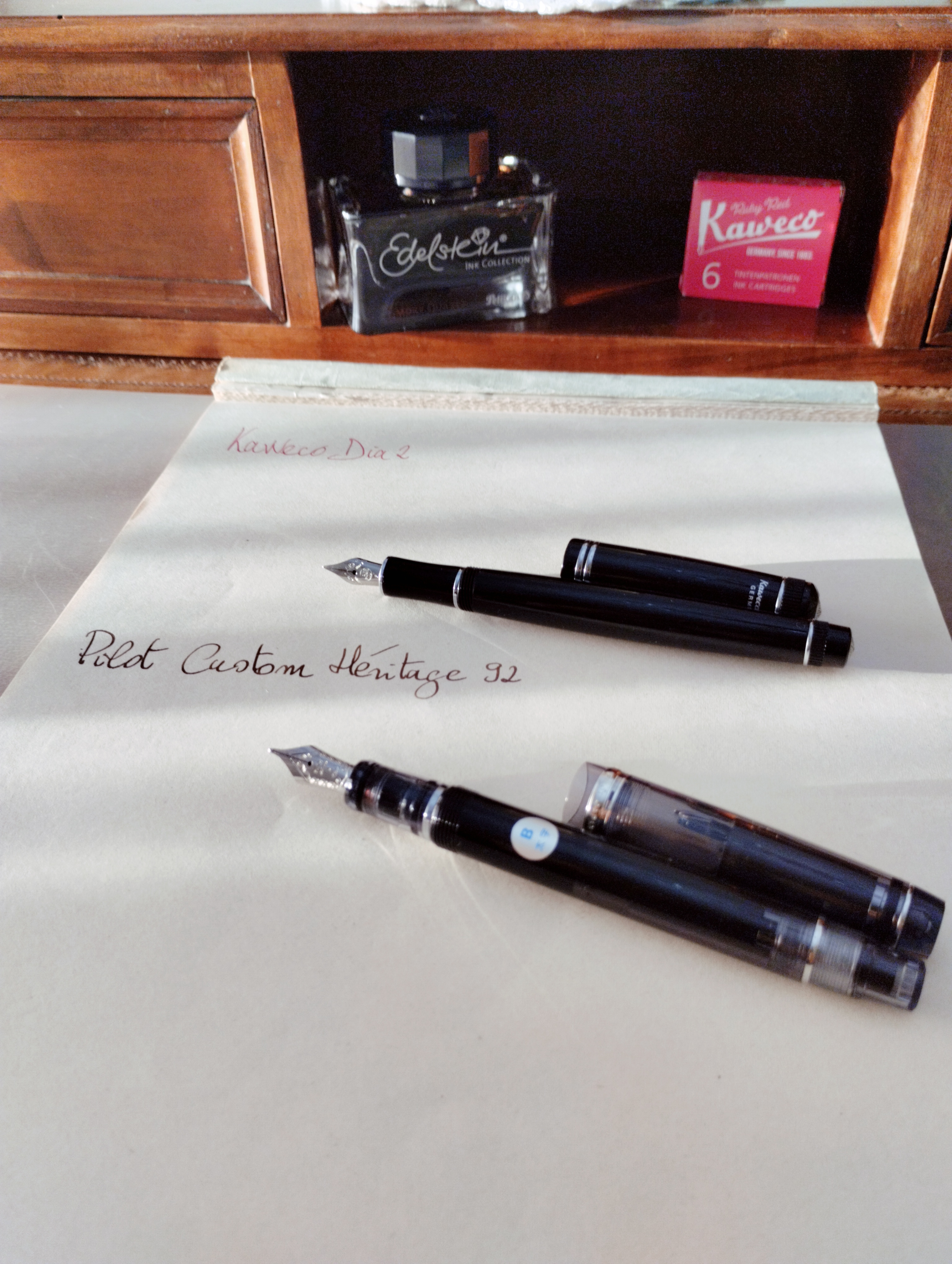 ecco le due penne che adopero in questo momento: una Pilot Custum Héritage 92 (pennino B) caricata con lo Smoky quartz della Pelikan e una Kaweco Dia2 (pennino F) caricata con una cartuccia di Kaweco Ruby red.