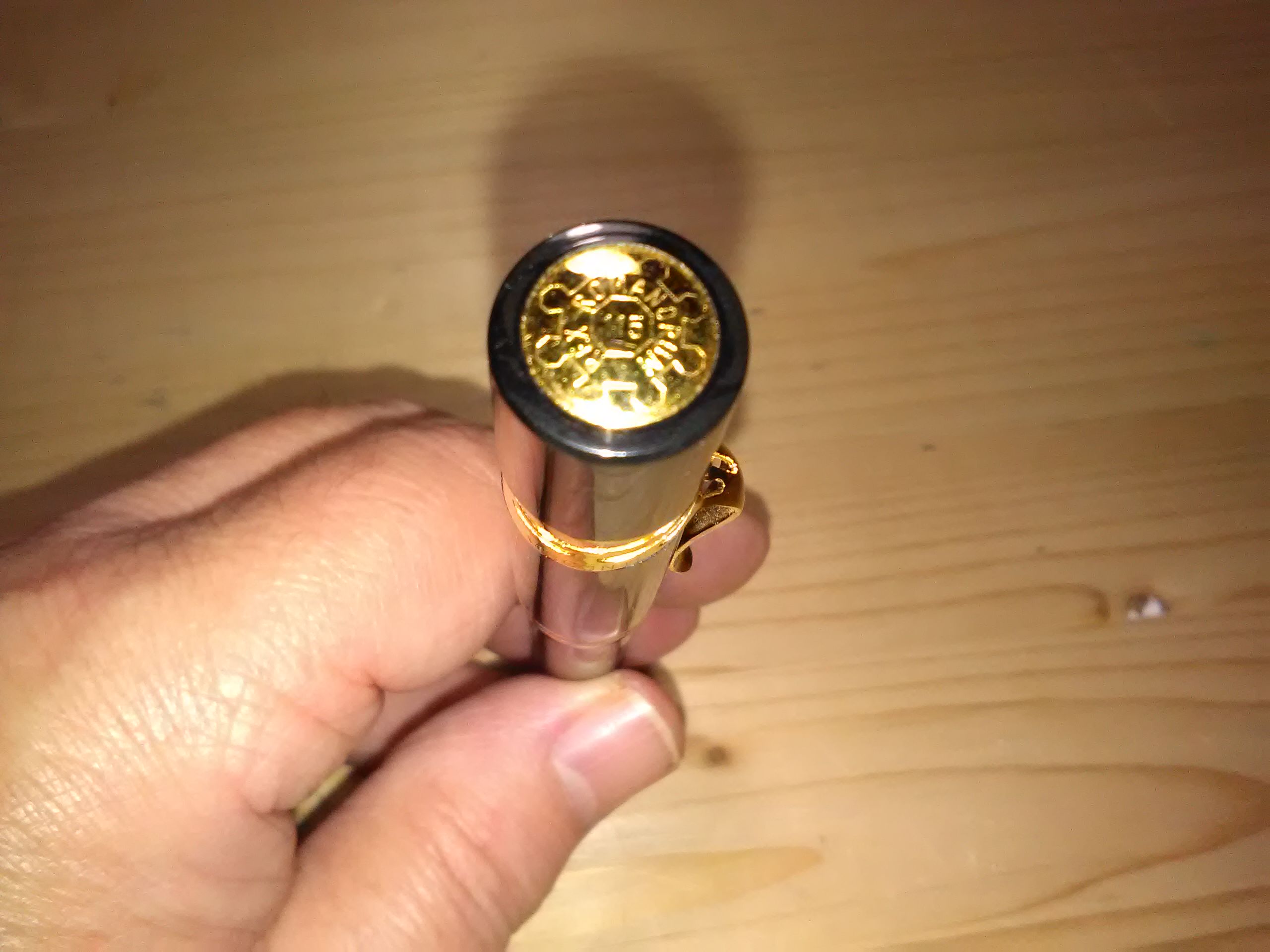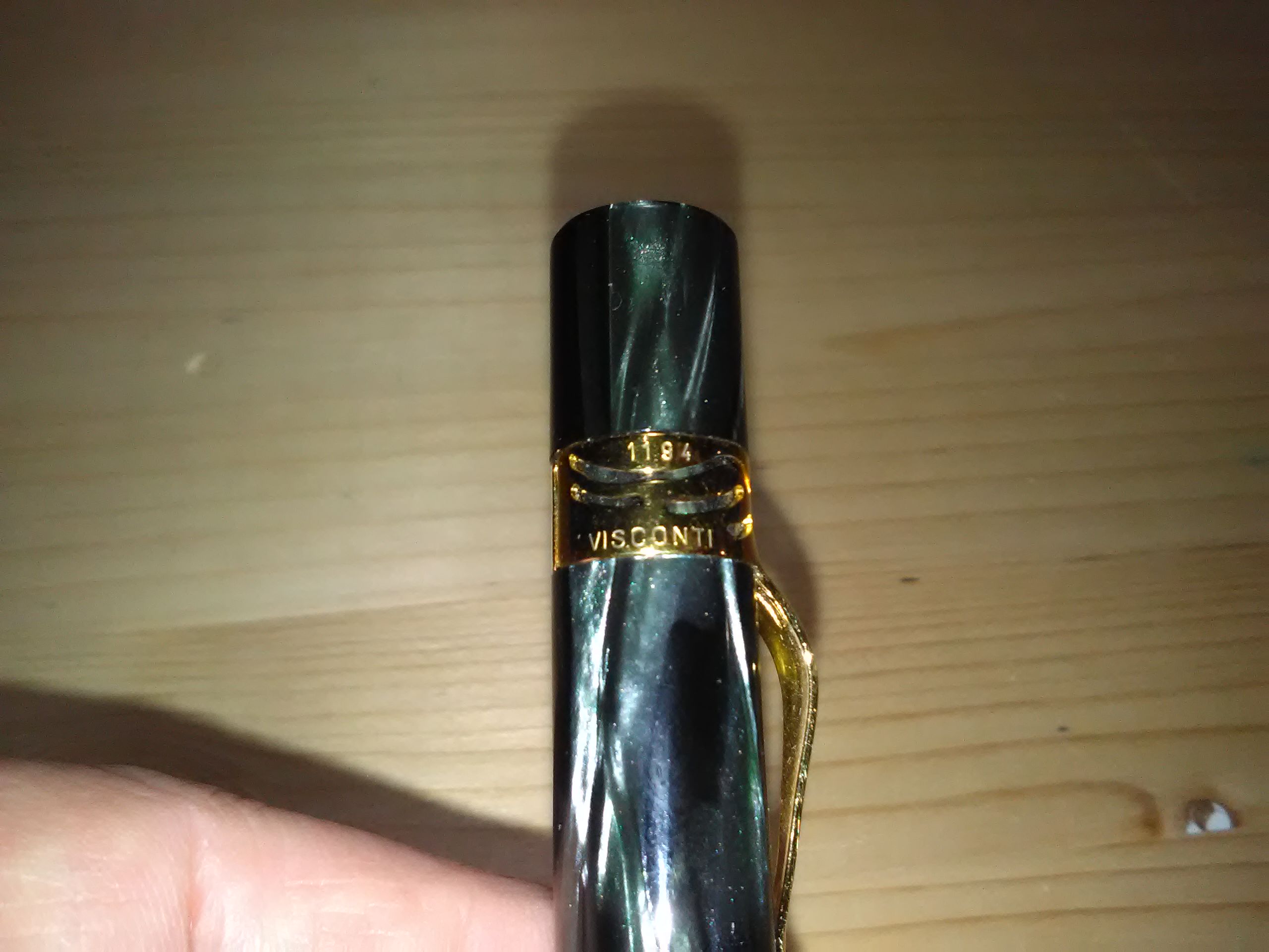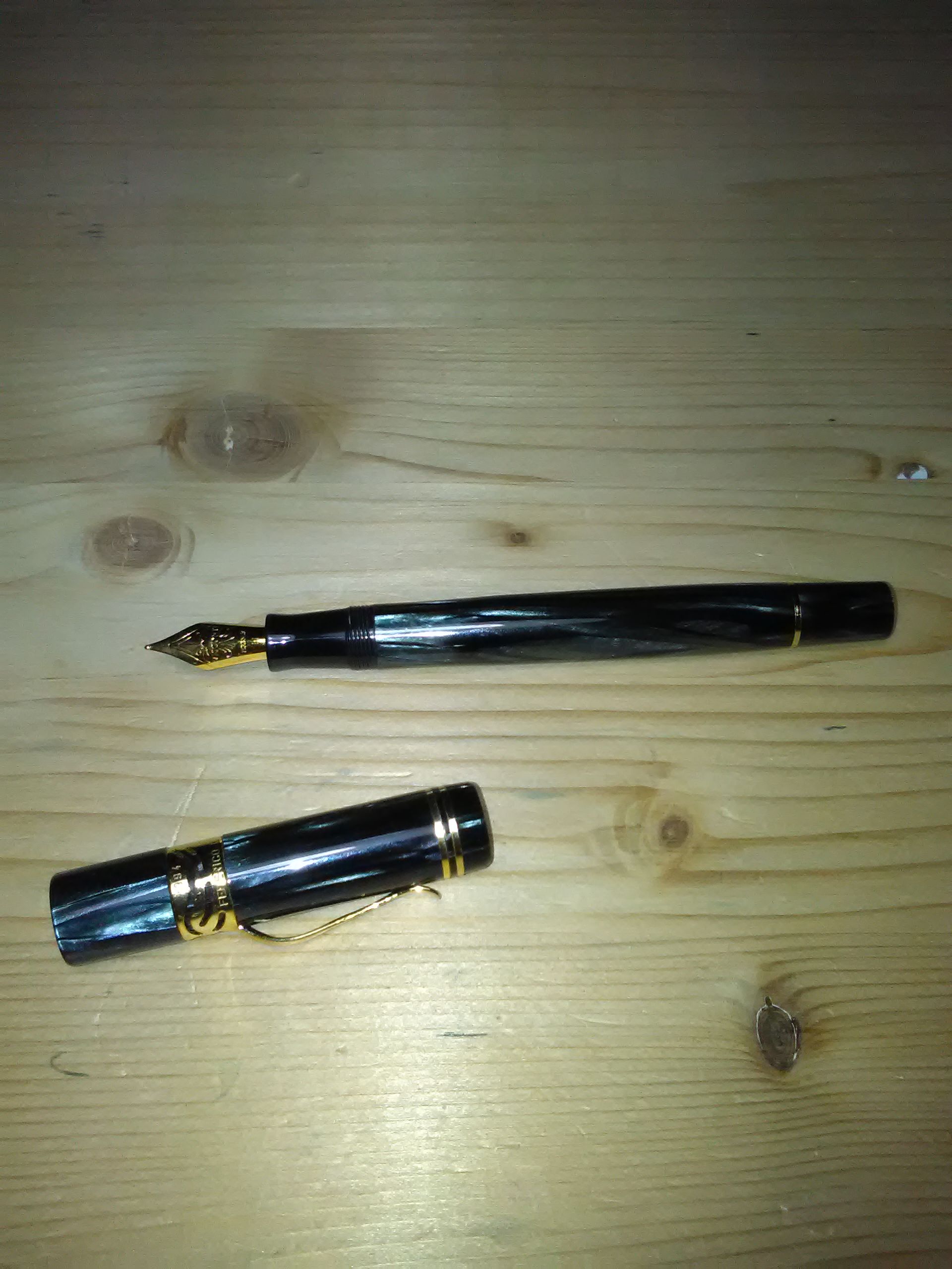 Corpo in celluloide striata grigio verde anche se dalle foto non sembra, pennino in acciaio dorato M molto scorrevole forse anche troppo, caricamento a stantuffo, caricata oggi per la prima volta con il Pelikan Edelstein Sapphire. Il modello base è la Rag Time.