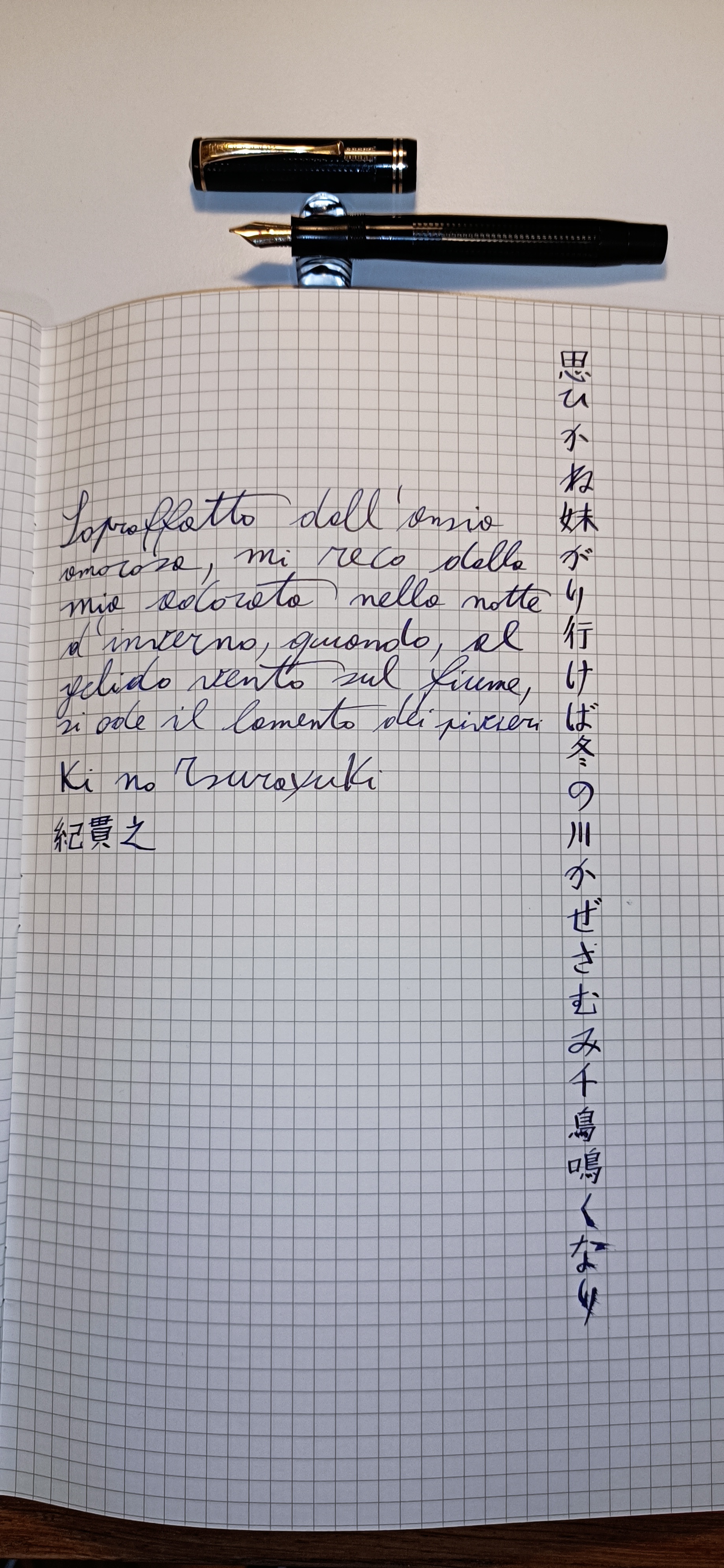 Riporto qualche riga (come al solito un waka con traduzione in italiano :) ) scritta con l'ultimo acquisto nel mondo vintage: Steadler Tradition con pennino 14k molto flessibile, tra quelli che ho provato è forse quello che più mi ricorda la sensazione di un pennello. La punta è leggermente stub. Comunque trovo che abbia un bellissimo "carattere".