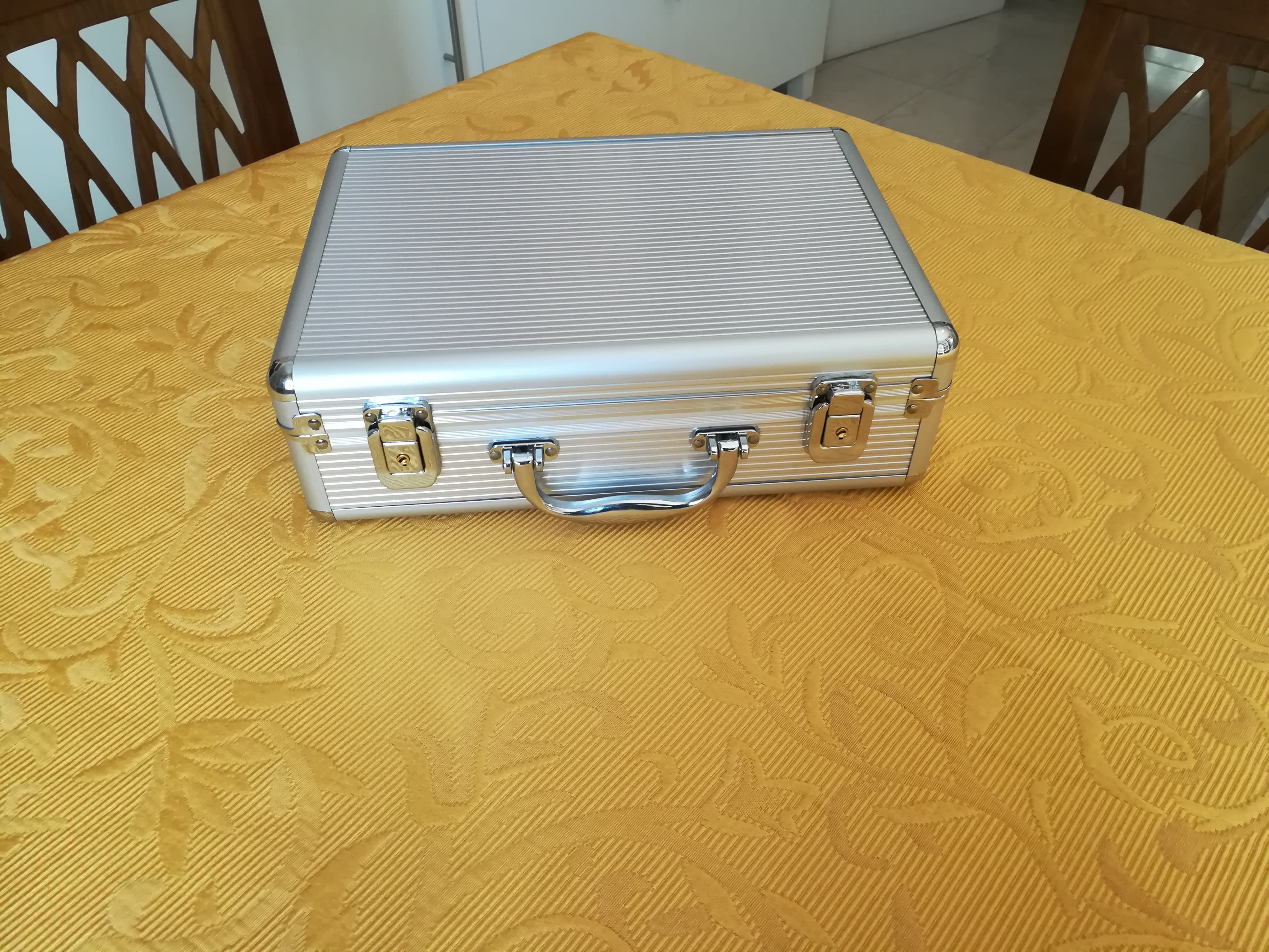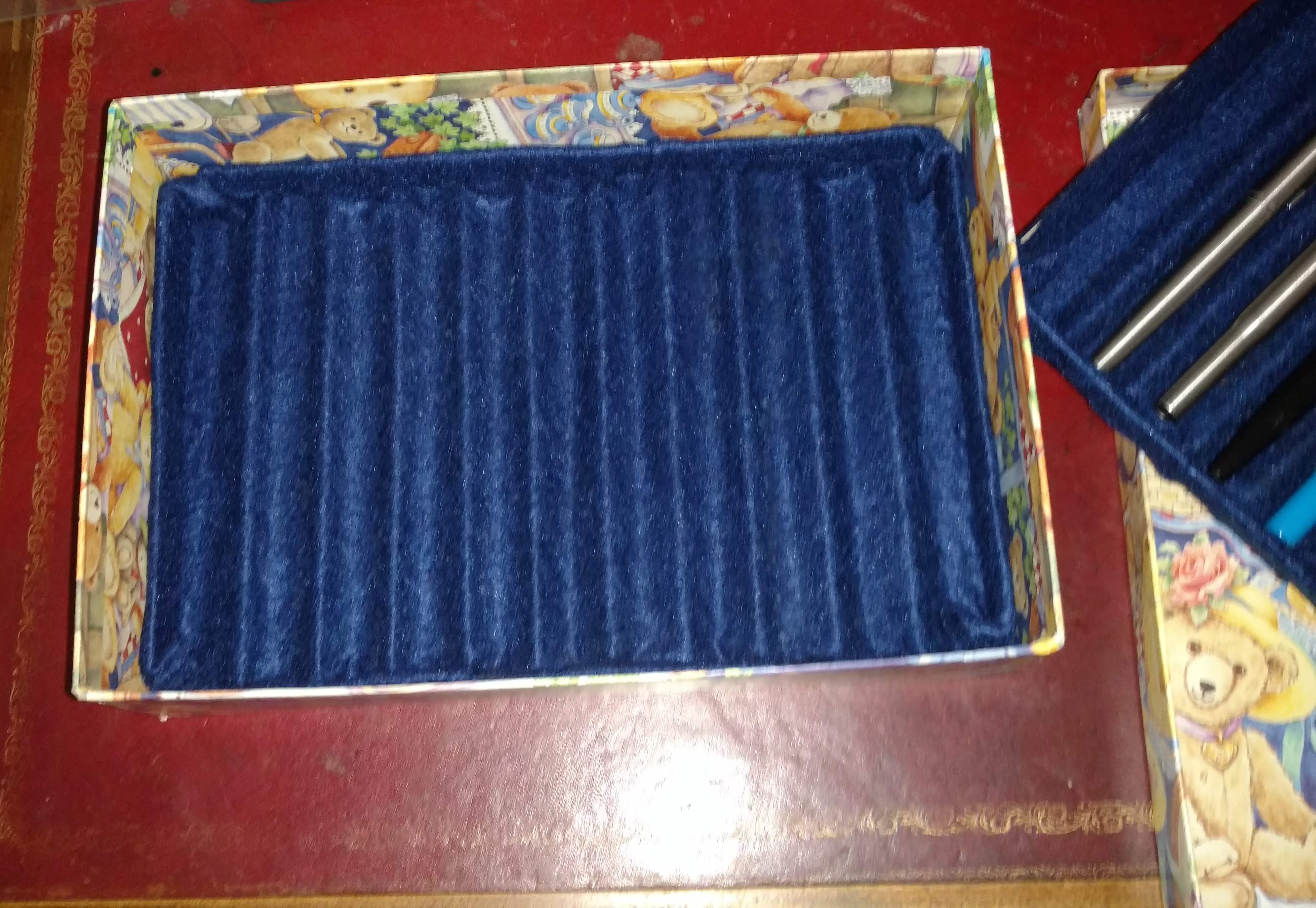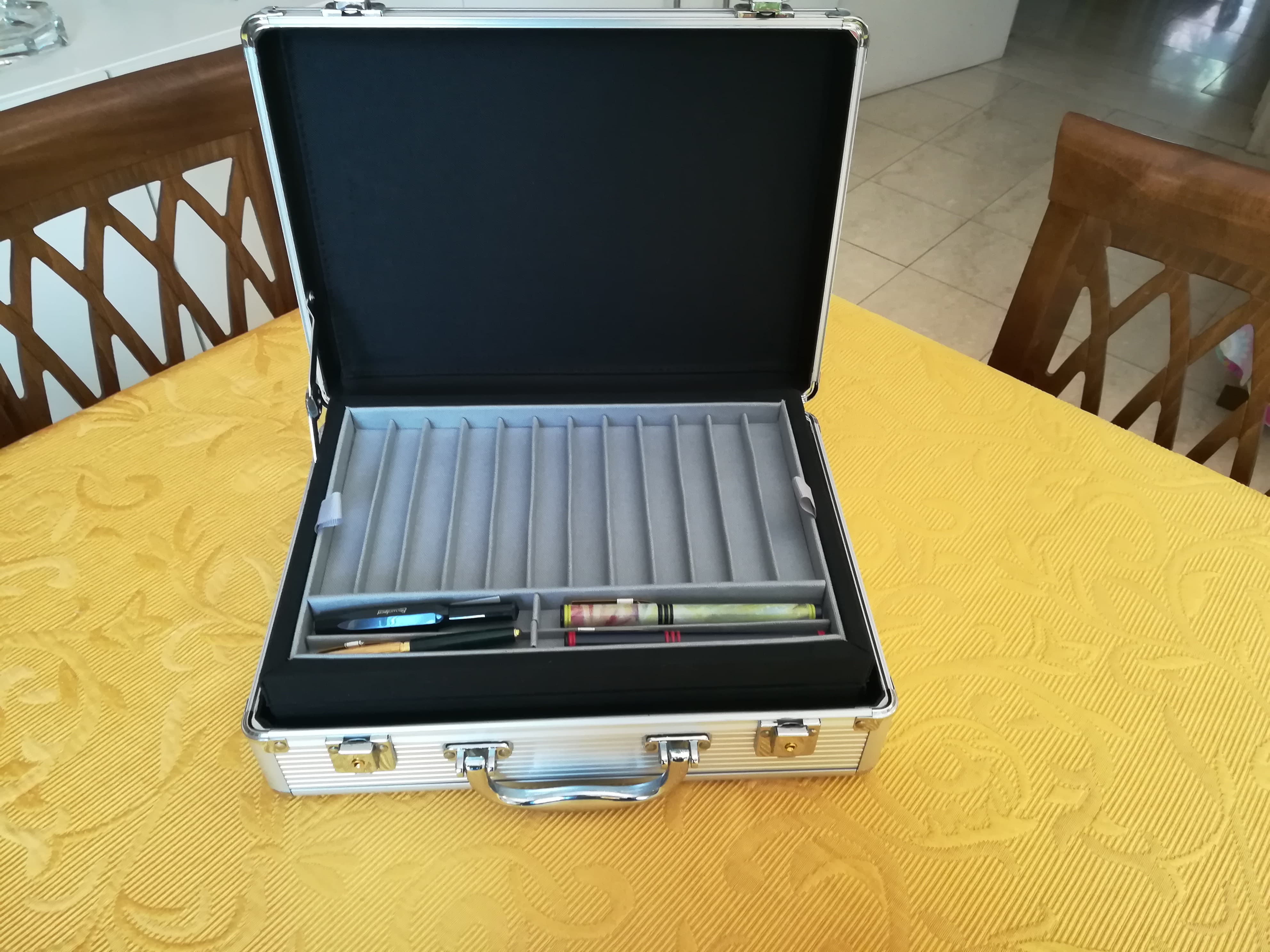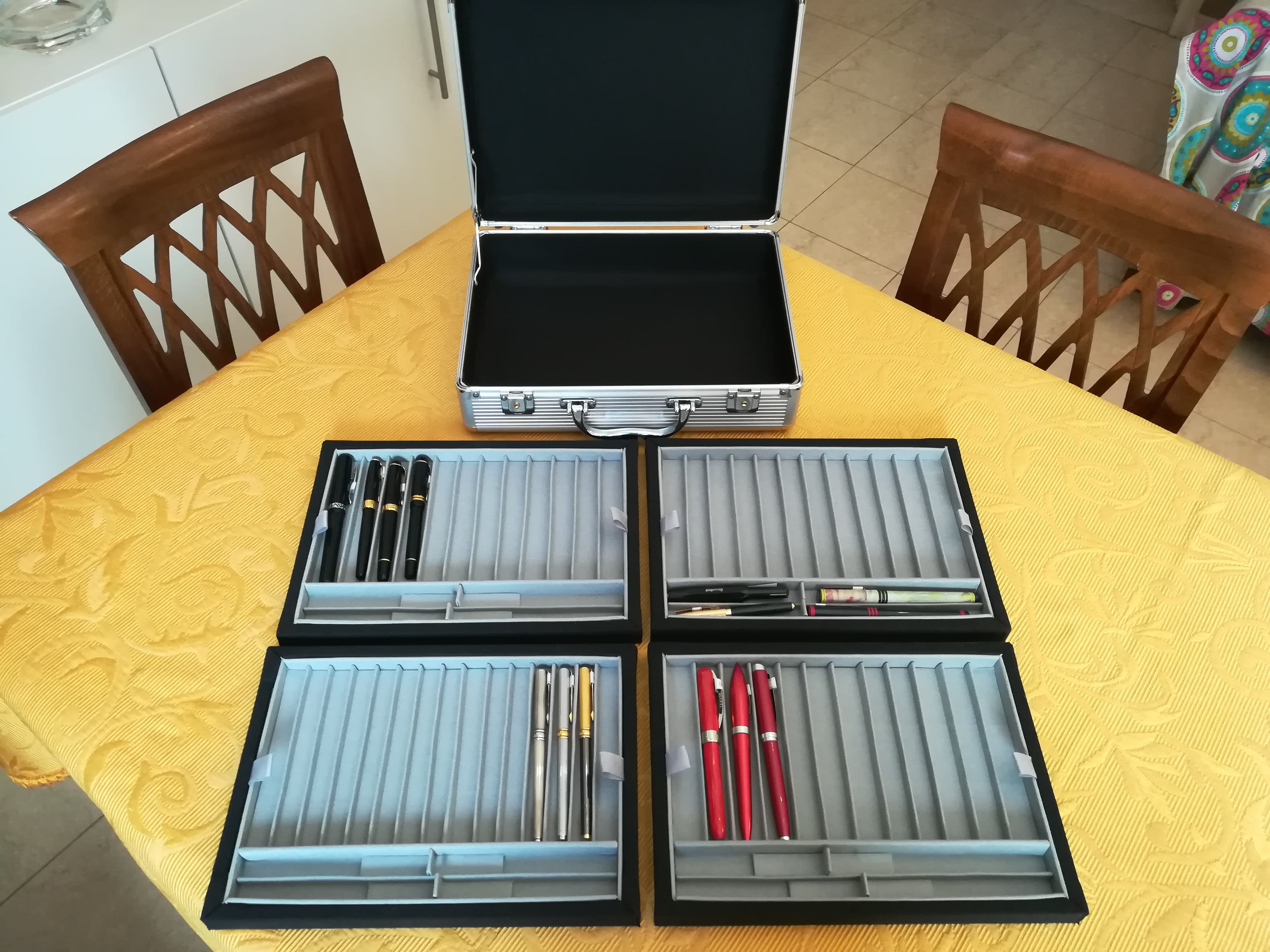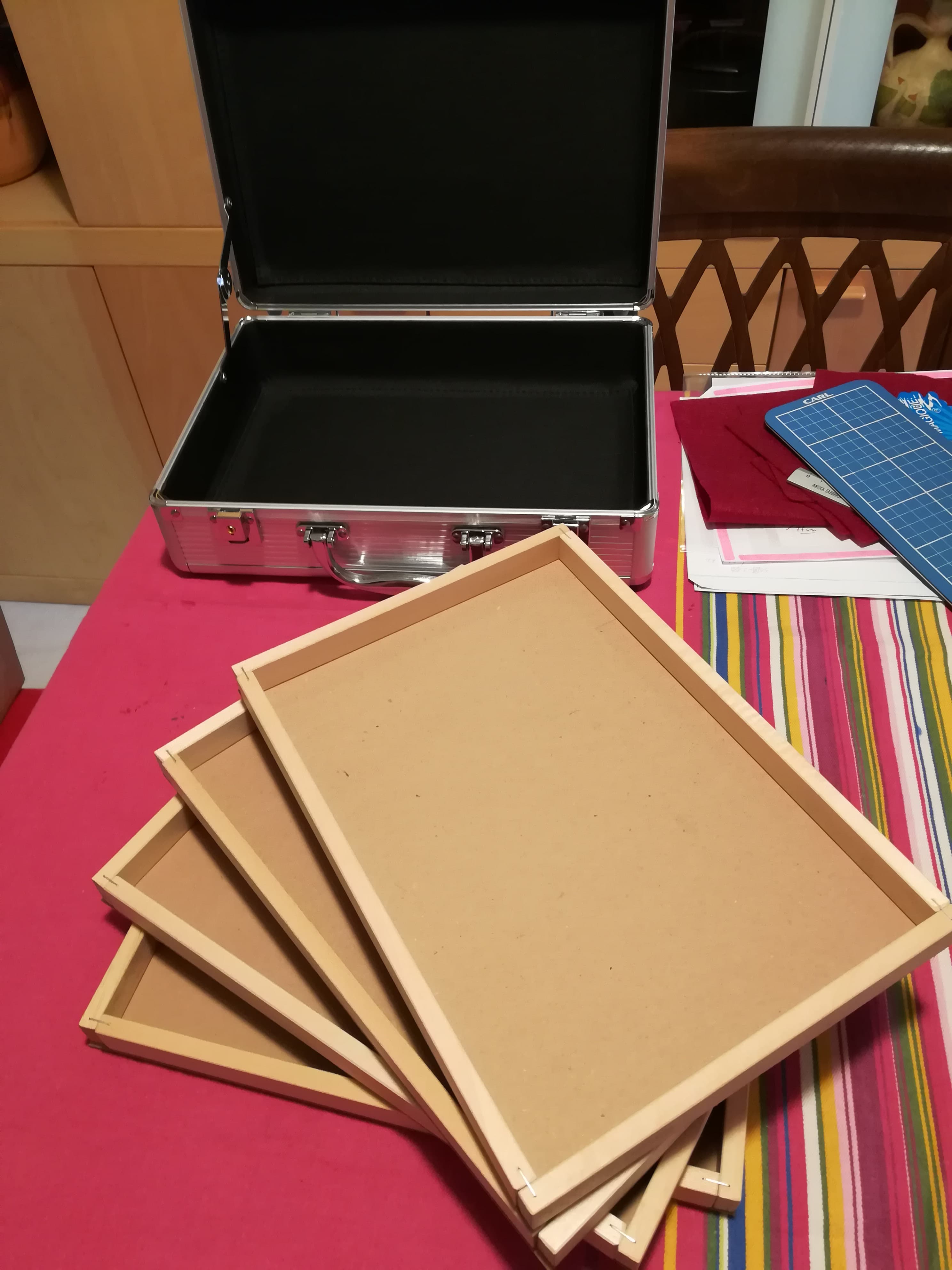 Alla fine ho optato per una valigetta in alluminio, che ho dotato di quattro vassoi assemblati in cartone e listelli di legno, foderati in stoffa.