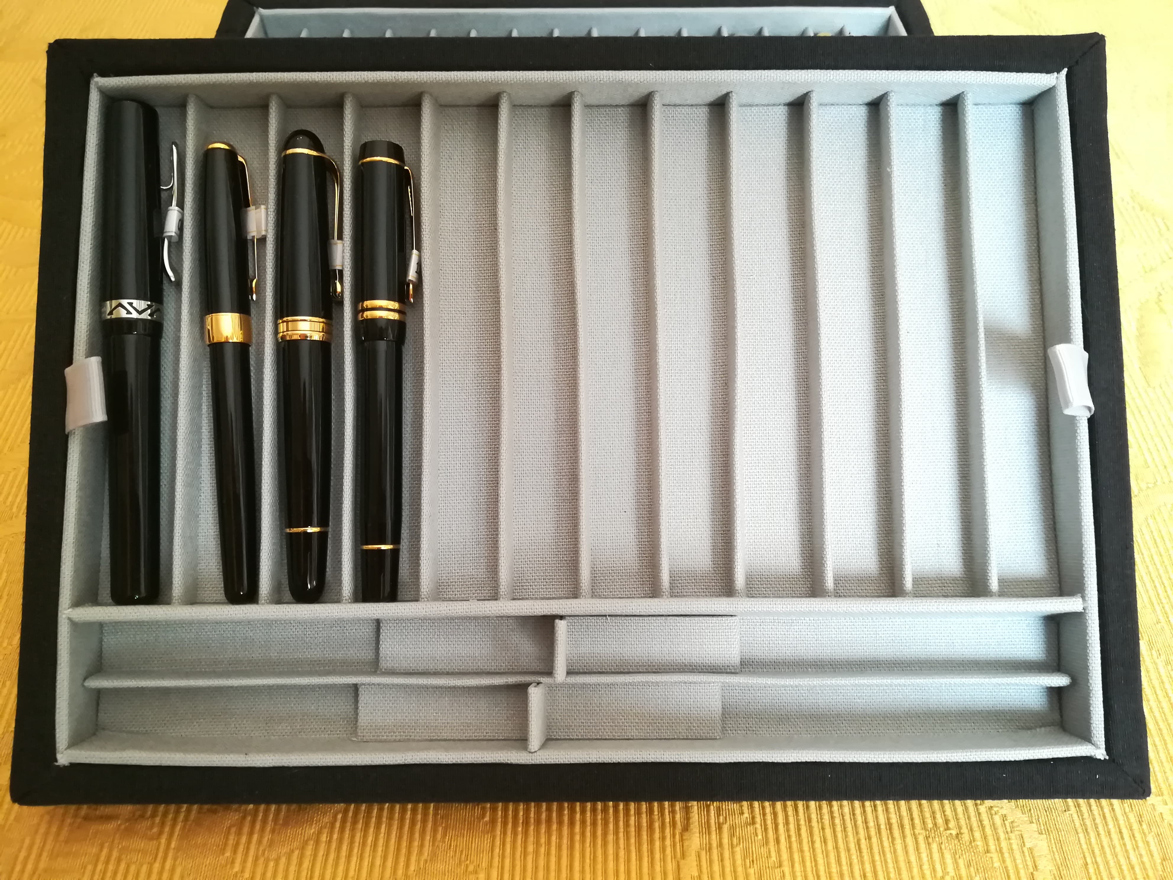 Doterei ogni ripiano di due o tre vassoietti per le penne, e l'effetto che ne risulterebbe a scatola aperta non dovrebbe essere malaccio.