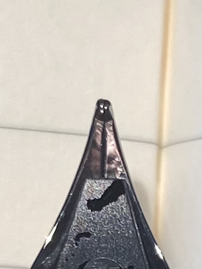 Sì vede dalla foto che il pennino non ha un taglio dritto, ma sbieco e questo dà problemi di salto di tratto