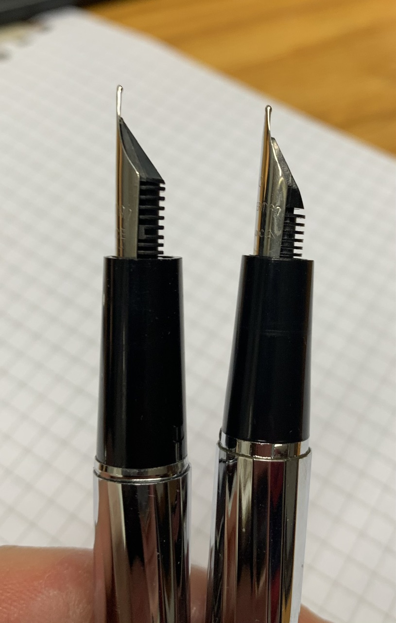 Rispetto al 18k della 555/F è difficile fare un confronto alla pari: questo pennino è all'incirca della stessa lunghezza, ma più "aperto" lateralmente, forse per questo risulta un poco meno rigido.