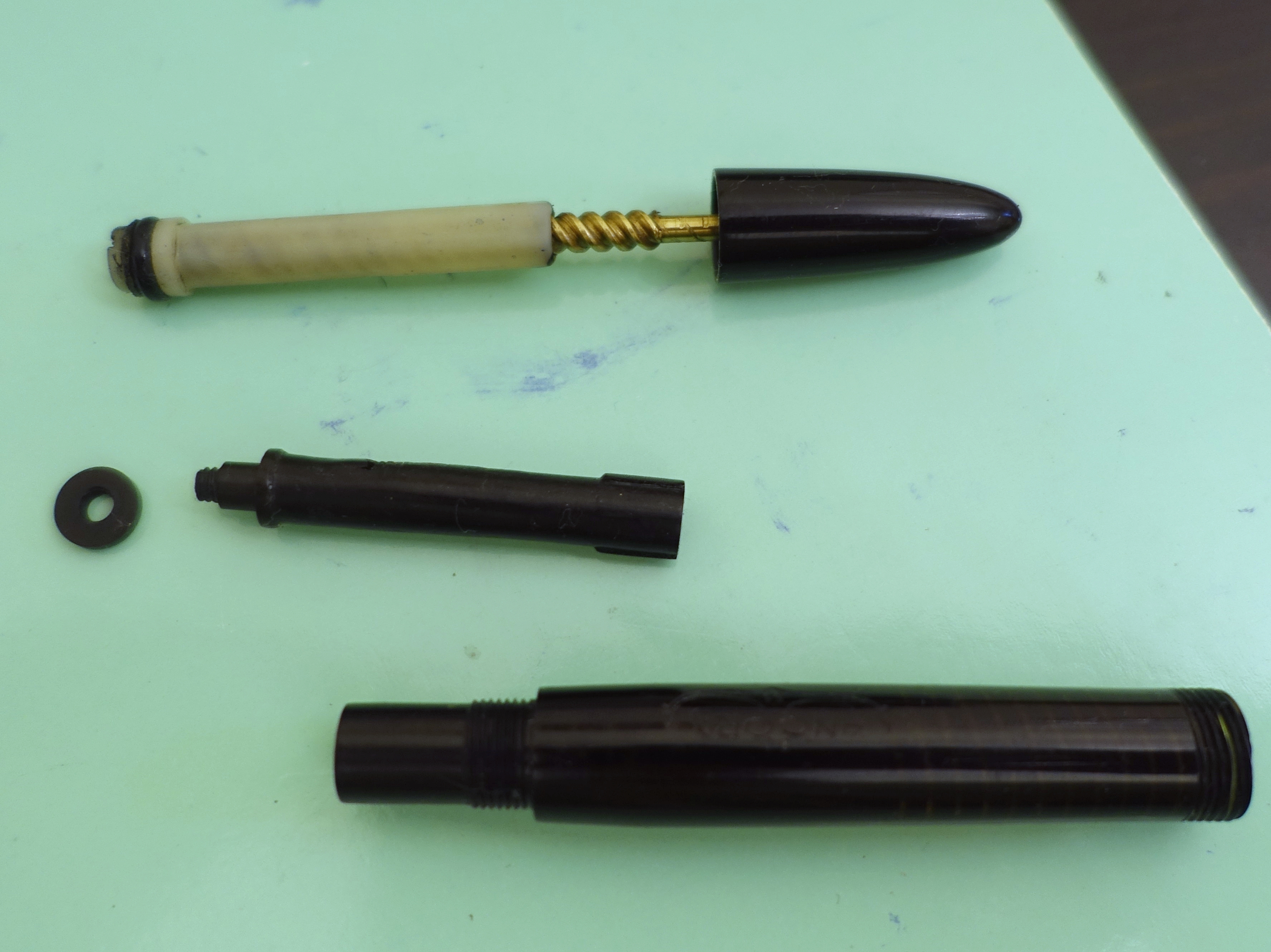 Scrivo ancora il mio parere, ho trovato il vecchio stantuffo ho smontato la mia 51 e ho provato a far passare lo stantuffo dalla parte superiore senza riuscirci, la parte della ghiera e guarnizione ha un diametro maggiore, la parte con le scanalature dove scorre lo stantuffo ha un diametro minore, e non può passare. Bisogna solo stabilire se la tua penna e la mia "Lady" hanno le identiche misure.