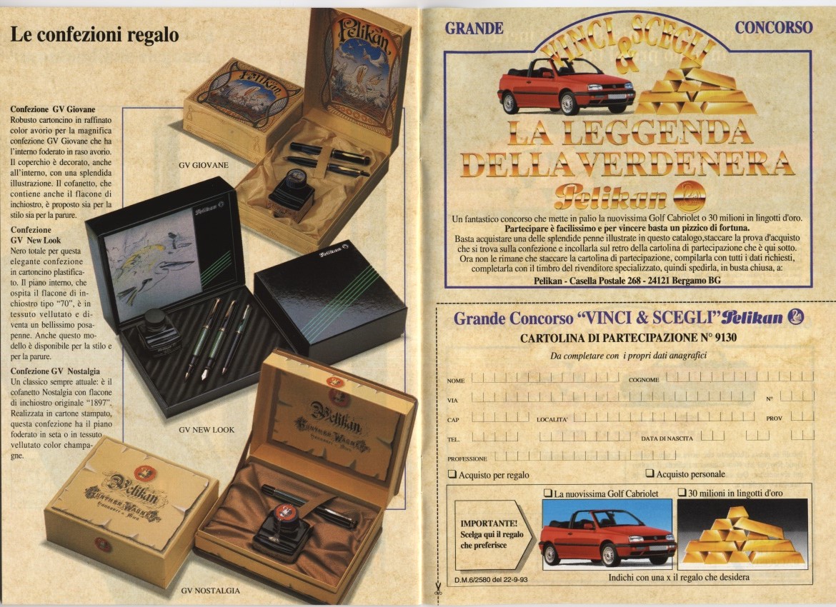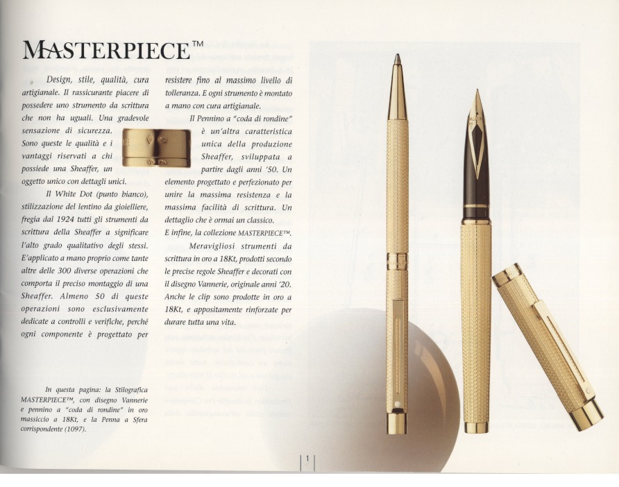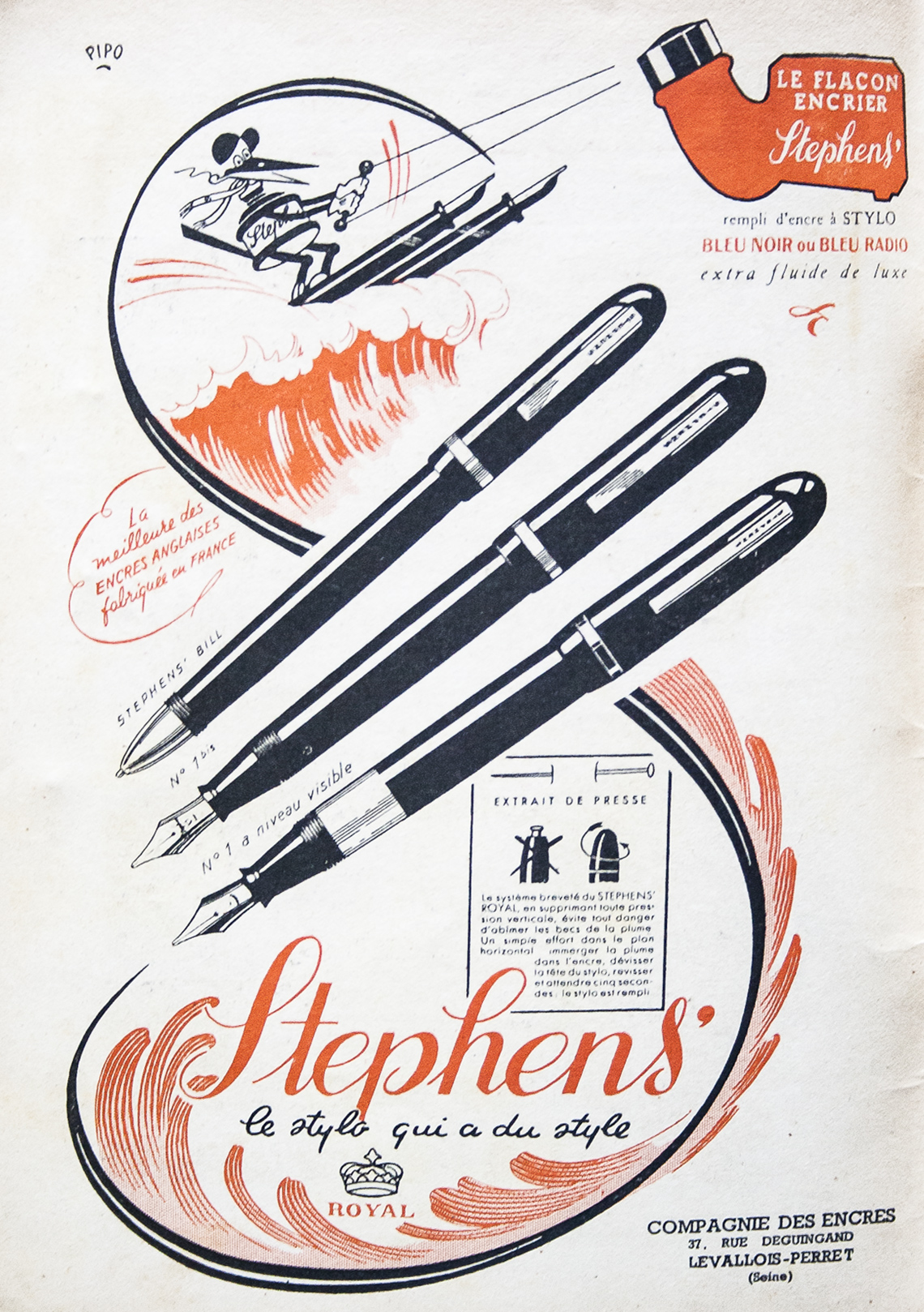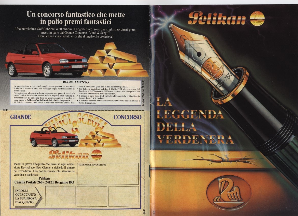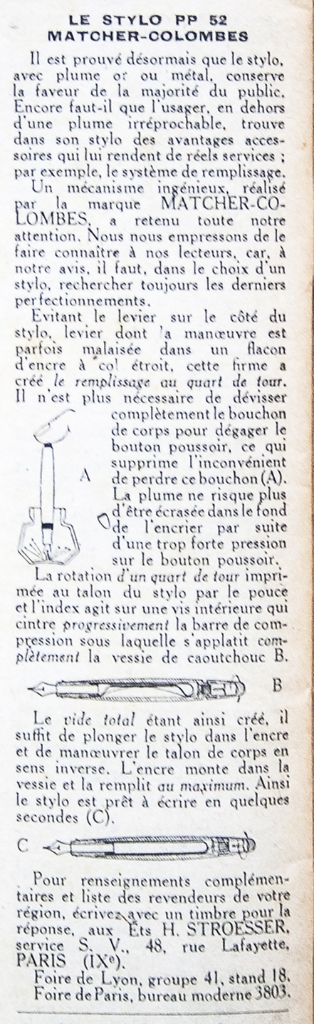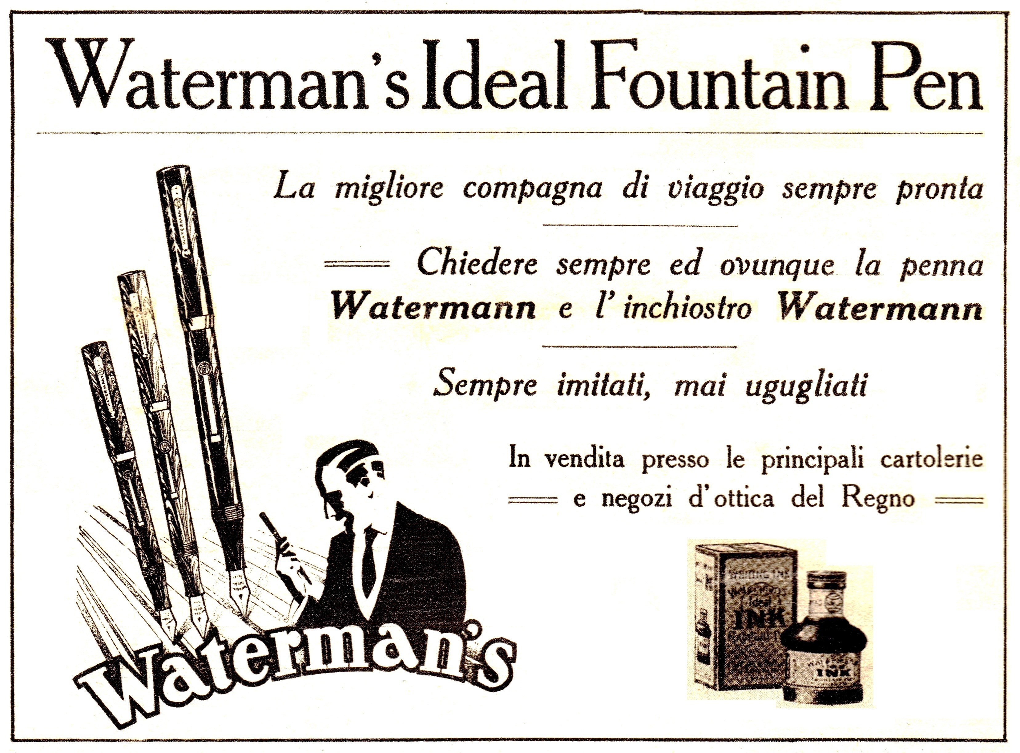 Le penne contenute nell'inserzione sono WATERMAN a levetta (5x) in ebanite fiammata: direi che ci troviamo di fronte ad un raro caso in cui Waterman pubblicizza (alcune del)le diverse misure disponibili di un modello mostrandole tutte insieme, ed ad un caso più unico che raro in cui manca il riferimento al Concessionario ufficiale italiano (all'epoca il Cav. Drisaldi)...