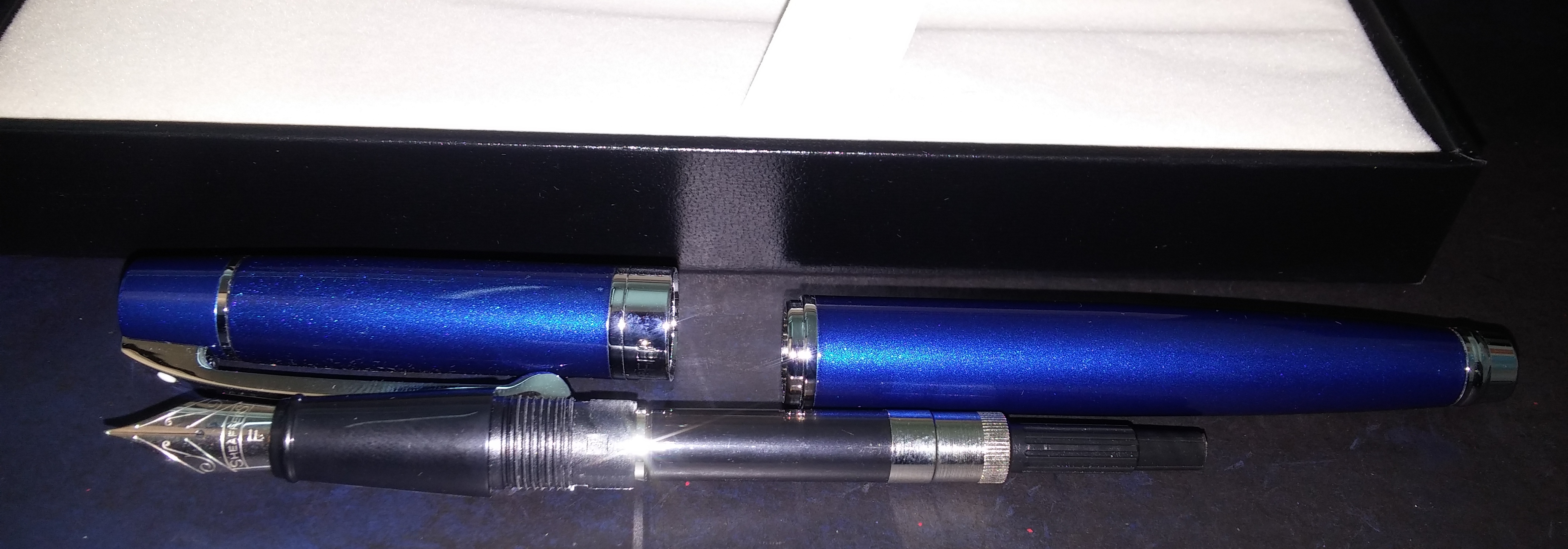 , comunque bella penna scrive molto bene, la mia ha un pennino fine e scrive come un fine giapponese, unico difetto è un po pesante e su lunghe sessioni stanca un pochino. Ottimo acquisto