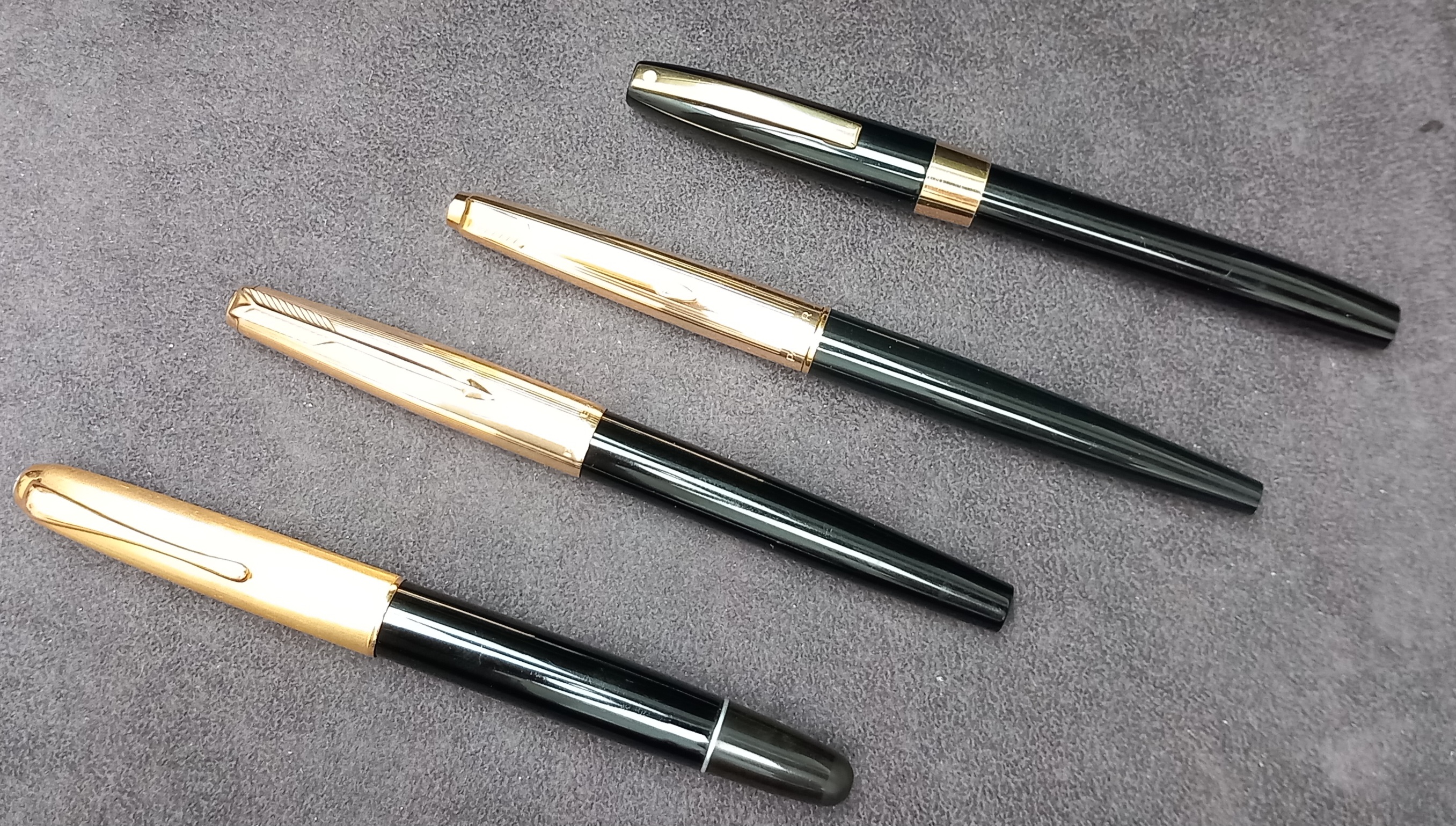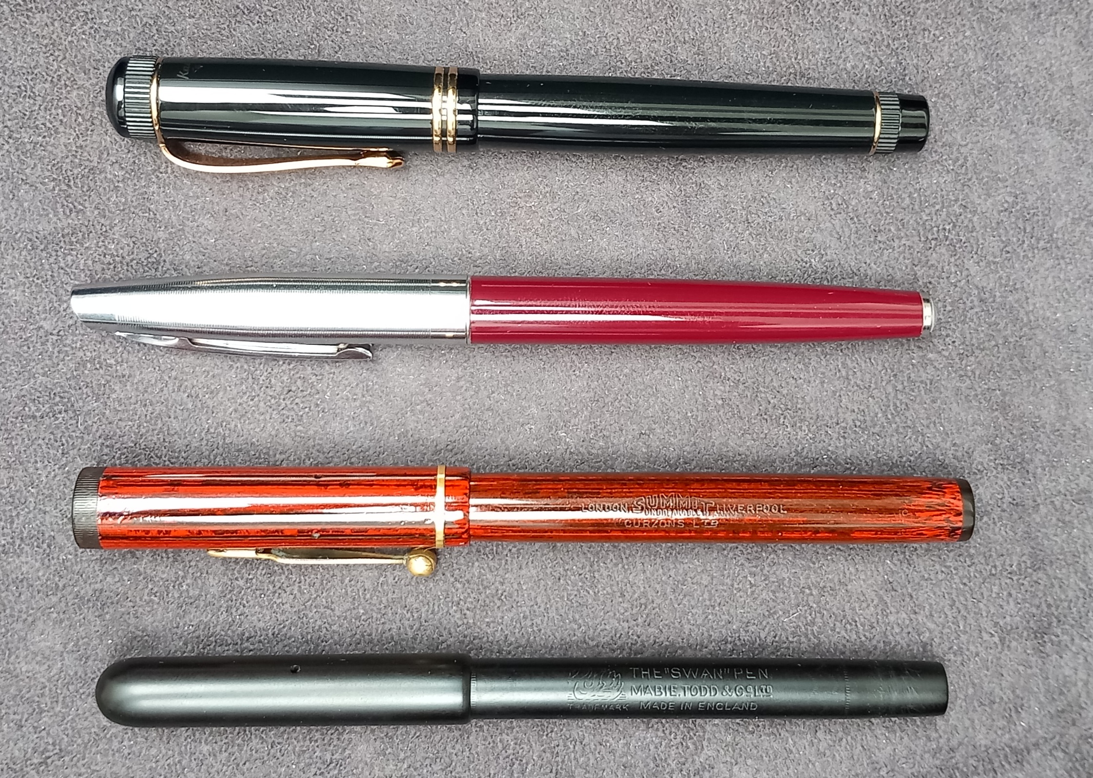 Ventaglio storico. Dal basso: Swan 1500 (1915), Summit H. 65 (1937), Universal (anni 60) e Kaweco Dia 2 (2021).