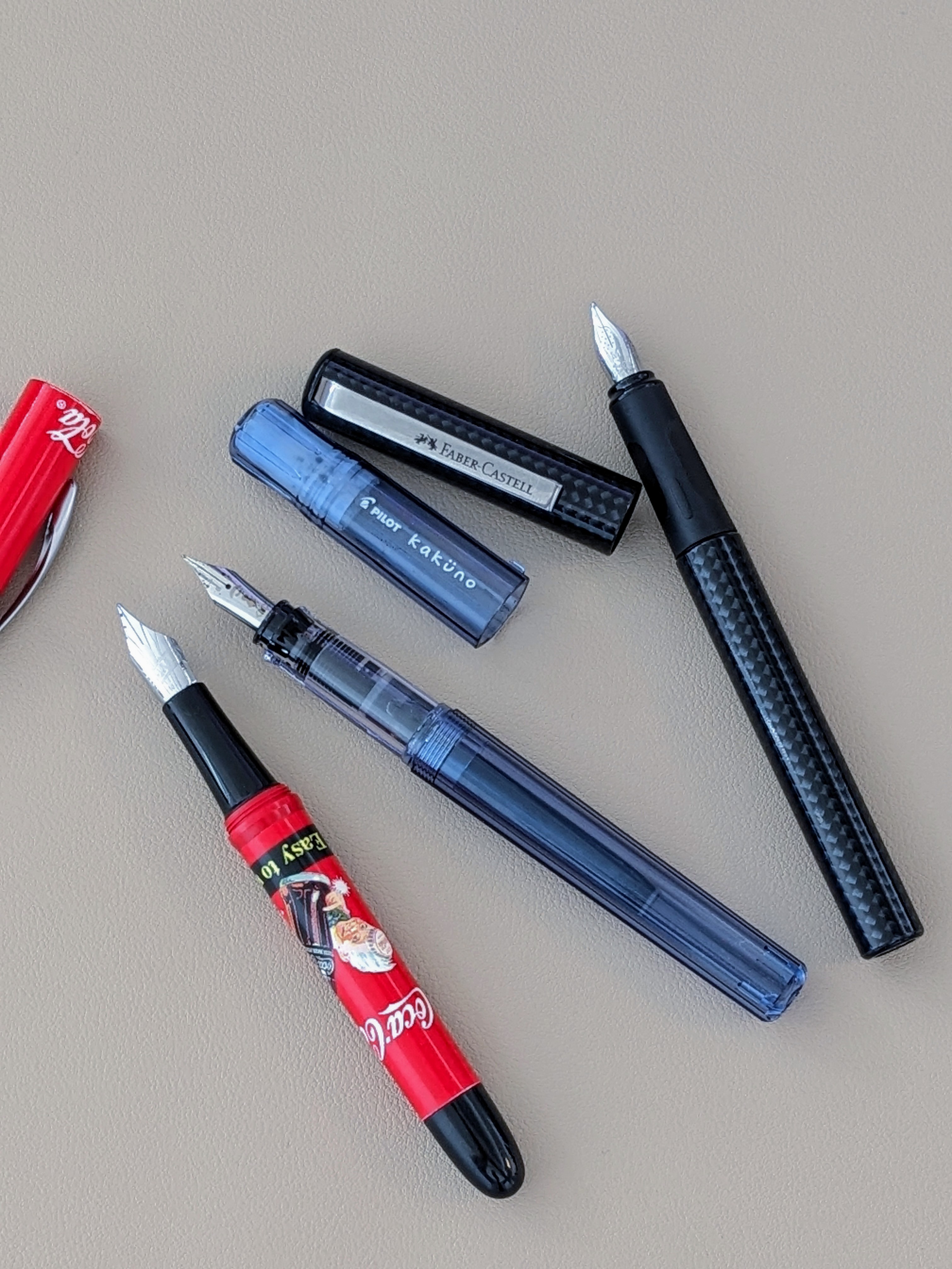 Un'umile Faber-Castell ShulFüller con la sua brava cartuccia Faber-Castell royal bleu (cancellabile); una più affilata e precisa Pilot Kaküno con la cartuccia di semplice inchiostro nero (ma indelebile!) e… (sorpresa!) una old but reliable Stypen Coca Cola del 1997 "armata" con cartuccia Pelikan 4001 blu (altrettanto cancellabile). Ecco: le "tre Grazie" sopra descritte e sotto raffigurate formano parte del "corredo" della mia altrimenti spoglia scrivania!
