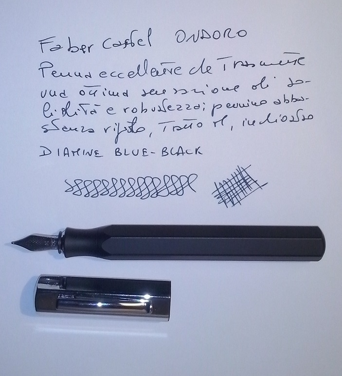 Ero un pò dubbioso riguardo la forma del fusto e lo stacco di colore del fusto col cappuccio ma ci si fa subito l' abitudine. La Ondoro trasmette una bella sensazione di robustezza e sta benissimo nella mano contrariamente a quanto potrebbe sembrare, data la forma esagonale; la scrittura è eccellente, morbida e senza false partenze.