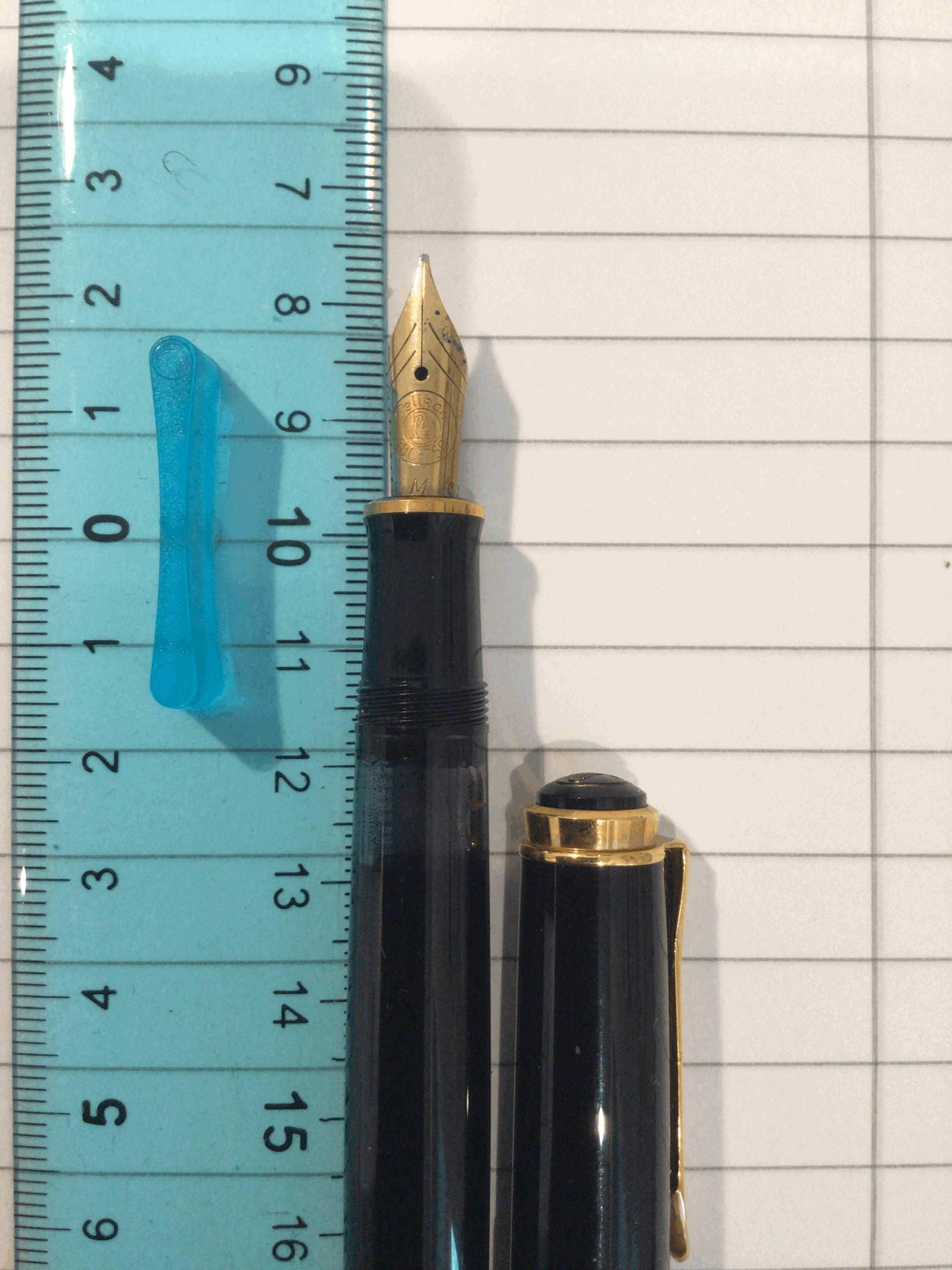 La penna in questione sembra essere stata prodotta nella Germania Ovest come si vede nella scritta sull'anello dorato del cappuccio. Il pennino è in oro 18k monotono anche se alcun zone sembrano più scure. La misura e il peso rientrano tra quelli dichiarati dalla Pelikan per le M600 old style. Rimane il grande dubbio del perché sul cappuccio ci sia scritto 14k F mentre in realtà è un 18k M. Sul libretto della garanzia non c'è scritto nulla riguardo al modello ma c'è una voce in cui si presentano i pennini disponibili per una eventuale sostituzione entro le 4 settimane dall'acquisto. Nessuno di questi pennini è in oro 18k ma sono tutti segnati come 14c-585.