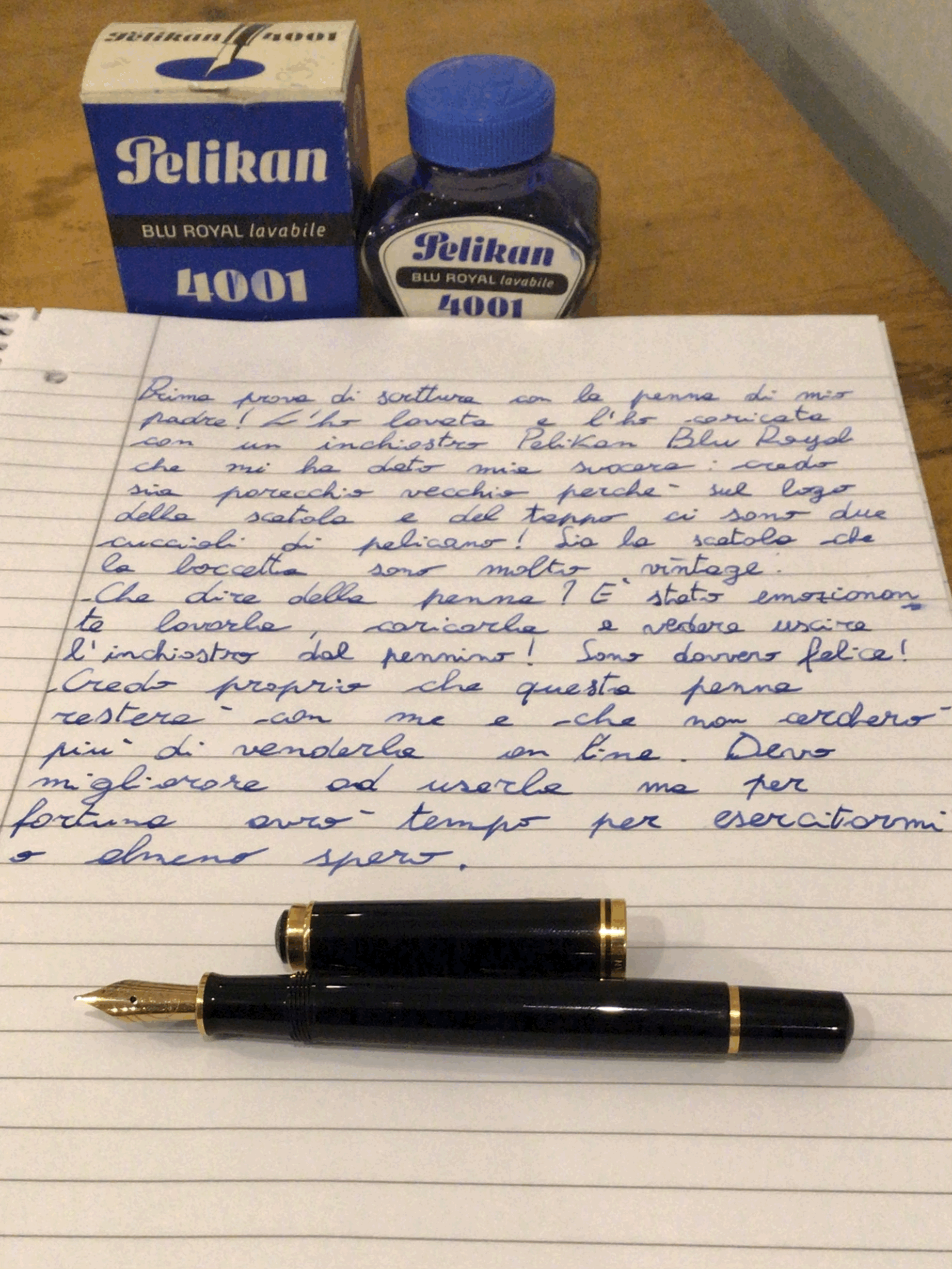 Come potete vedere dalle foto la penna necessita di una pulitura. Guarderò sul sito fountainpen.it per cercare consigli ma se qualcuno avesse qualche dritta su come pulirla ne sarei grato. Non vedo l'ora di provarla! Mia suocera ha in casa una confezione di inchiostro Pelikan Blu Royal lavabile 4001 (forse un po' datato) e vorrei provarlo. Scadono gli inchiostri?