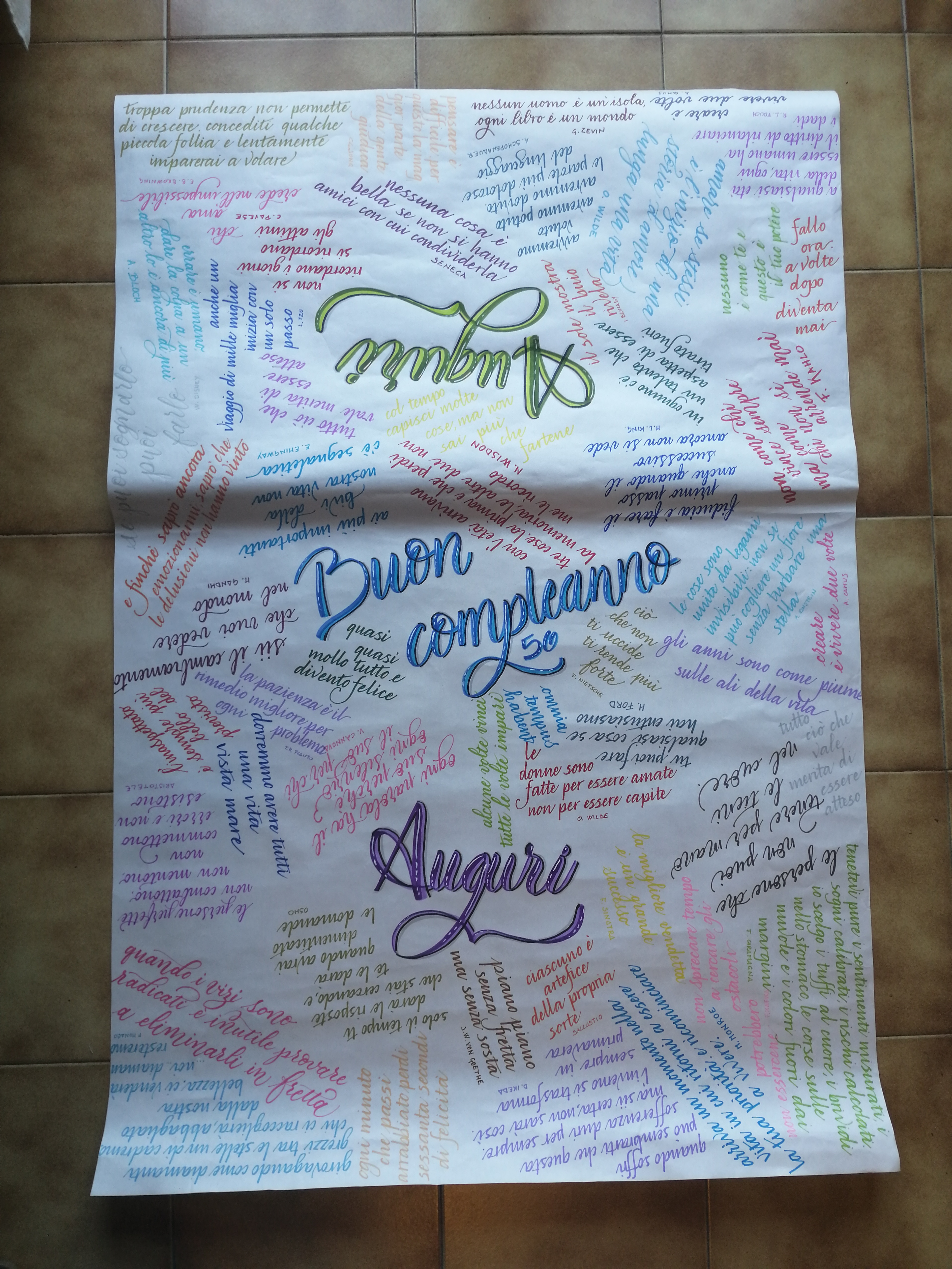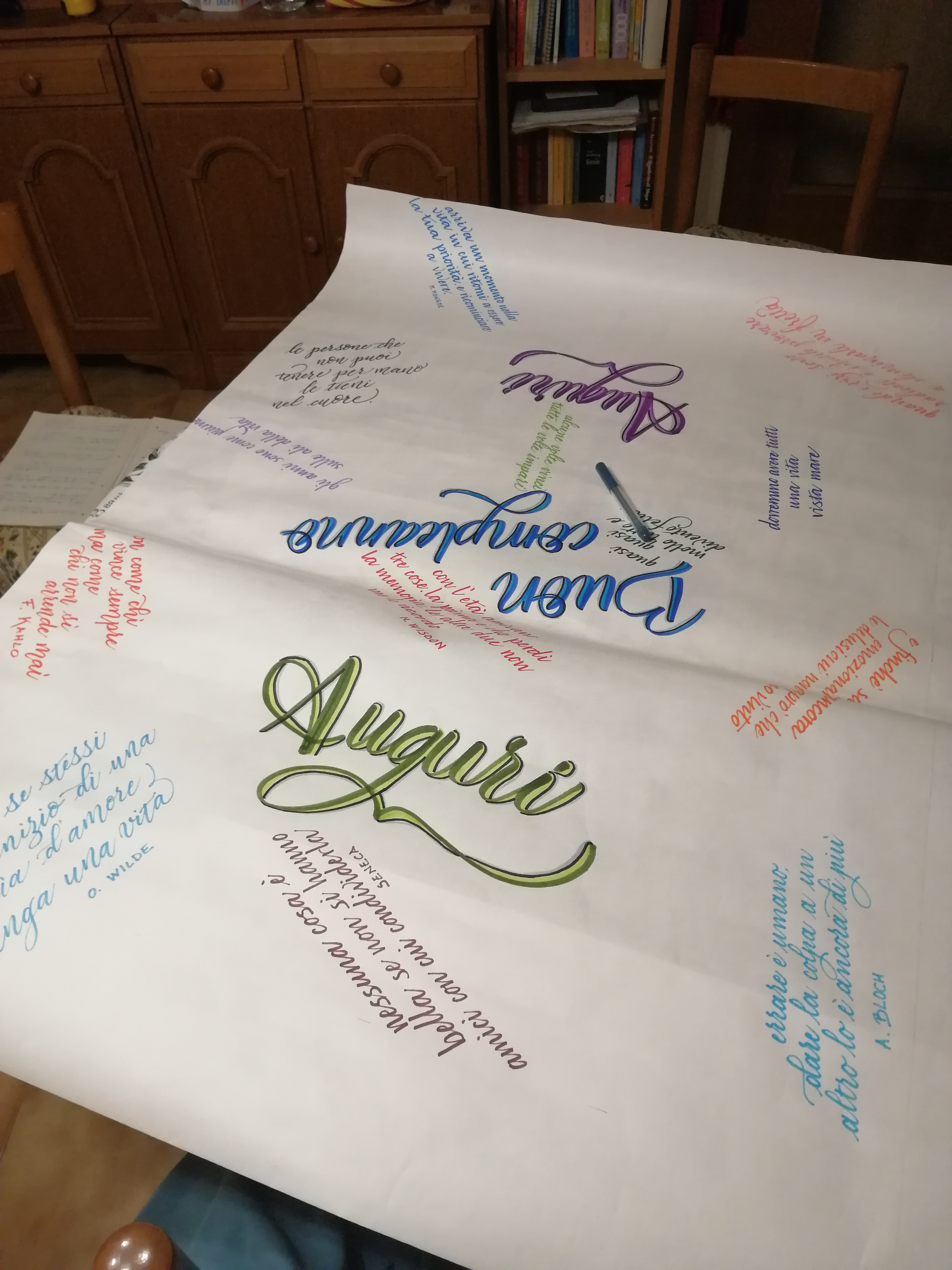Bellissimo! Per i 18 anni di mia figlia feci una cosa simile ma assai meno artistica (solo scritte buffe). Lei però la carta l’ha strappata!Dory ha scritto: ↑mercoledì 8 settembre 2021, 11:54 La carta da pacchi di un regalo di compleanno. La scatola é grande così ho pensato che, invece di prendere qualcosa di pronto, decorare un foglio di carta da imballaggio fosse una buona idea (mi sono fissata con la carta da pacchi-biglietto auguri) . Sto usando semplici pennarelli dell'IKEA e ho tre giorni di tempo.
