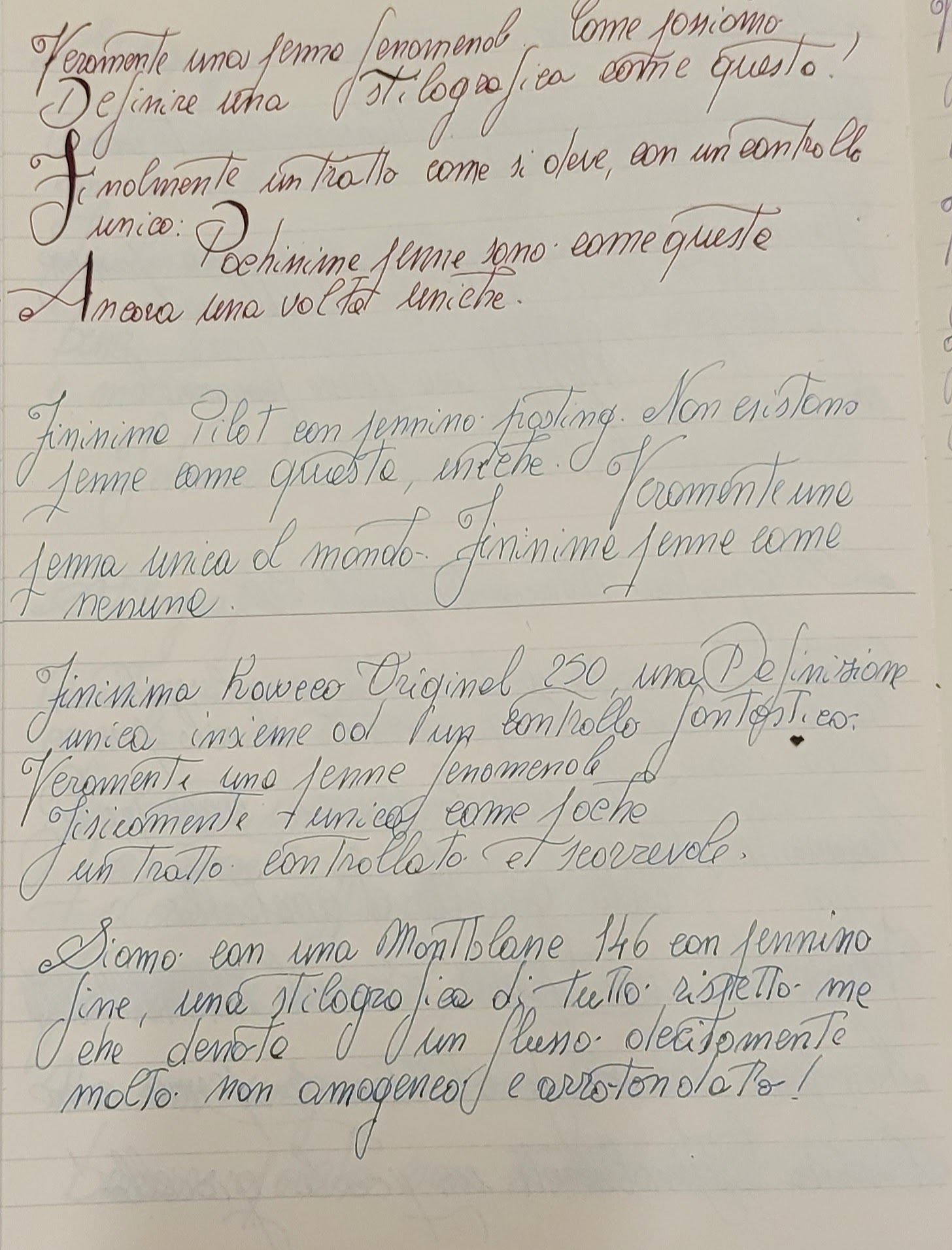 linusmax ha scritto: mercoledì 19 ottobre 2022, 17:05 La MB mostrava un tratto dimosogeneo (variazioni di sfumature), una calligrafia impastata (tipica di una penna burrosa), difatti io la uso quando compilo l'agenda o quando intendo scrivere moltissimo e senza stancarmi, non di certo per la qualità dello scritto perchè c'è di meglio. La Justus invece mostrava la stessa definizione di scrittura della Kaweco ma una differente precisione con spaziature irregolari e un flusso espressivo.