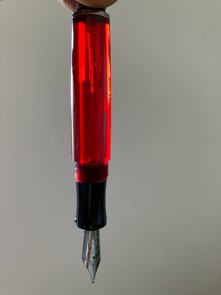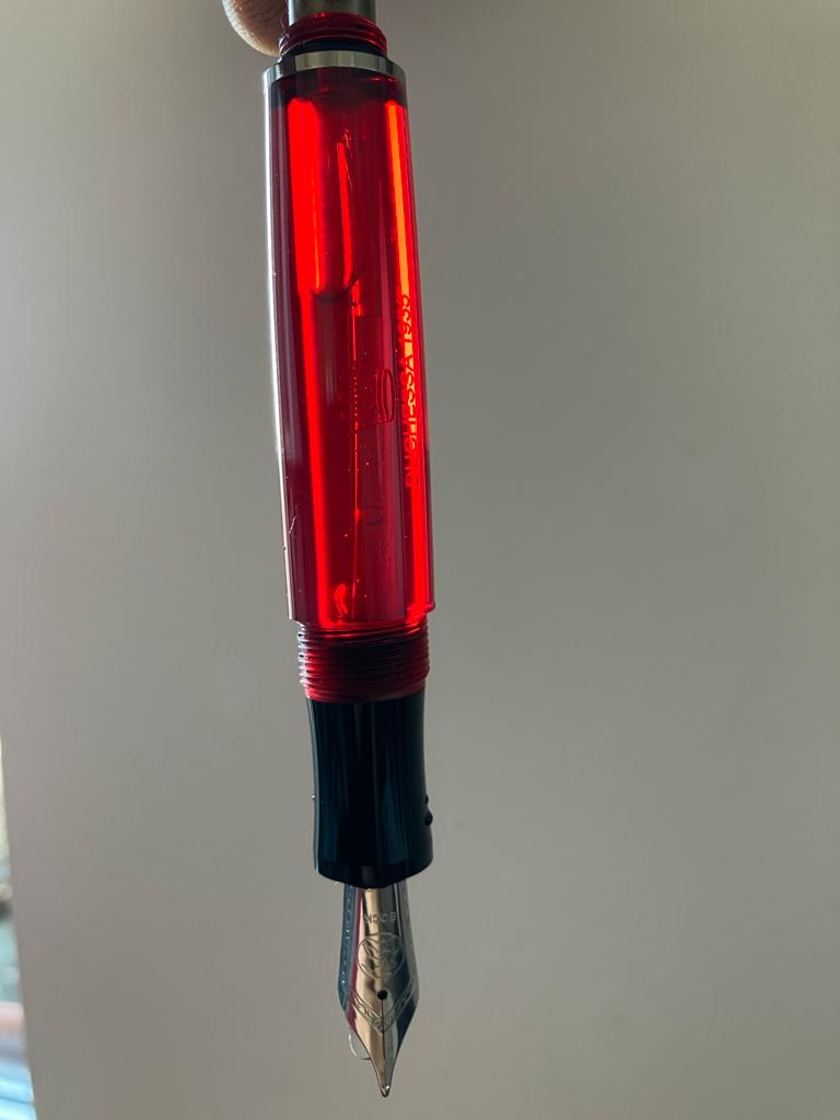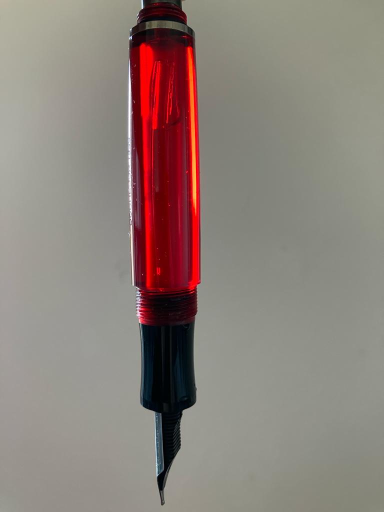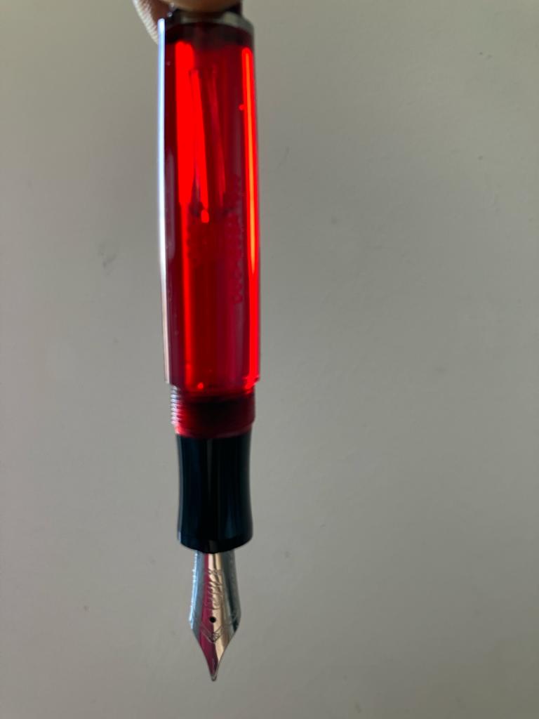 Questo è probabilmente il caricamento massimo in questa conformazione (vuotato il contenuto e raccolto con una siringa si misura 0,8 ml), mi sento di dire, perlomeno a quelli che sono già passati alla sostituzione del collare, alimentatore e pennino, che piuttosto che usarla in eyedropper questa modifica non complessa (tubicino in silicone diametro interno 2mm sul peduncolo del collare facilmente reperibile, e forellino da 1mm nel fondo del collare) permette il funzionamento e riempimento a sfiatatoio come previsto, salvo la possibilità di riempire completamente la penna (ma almeno per due terzi).