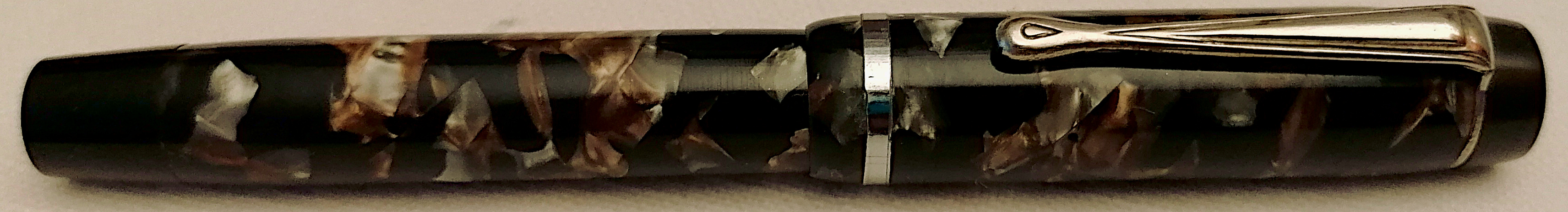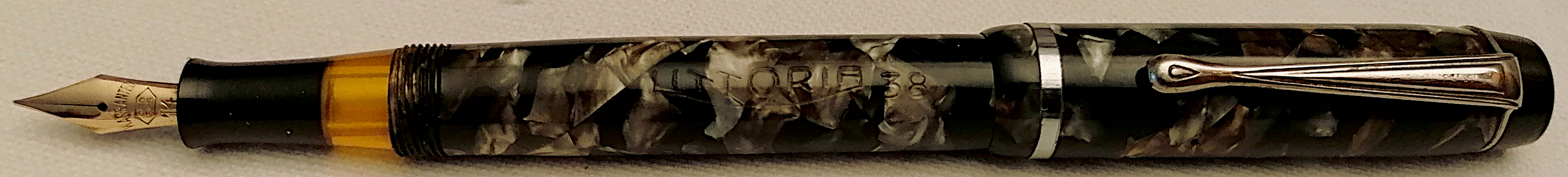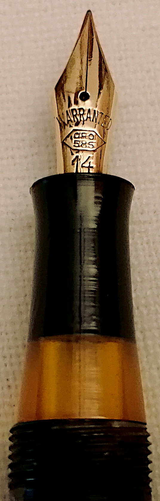 Il mio modello è identico a quello inglese, solo la celluloide ha un colore diverso, con la finestrella semi trasparente color giallo/ambra ed il medesimo pennino con l'iscrizione "Warrented ORO 585 14" inciso su tre righe.