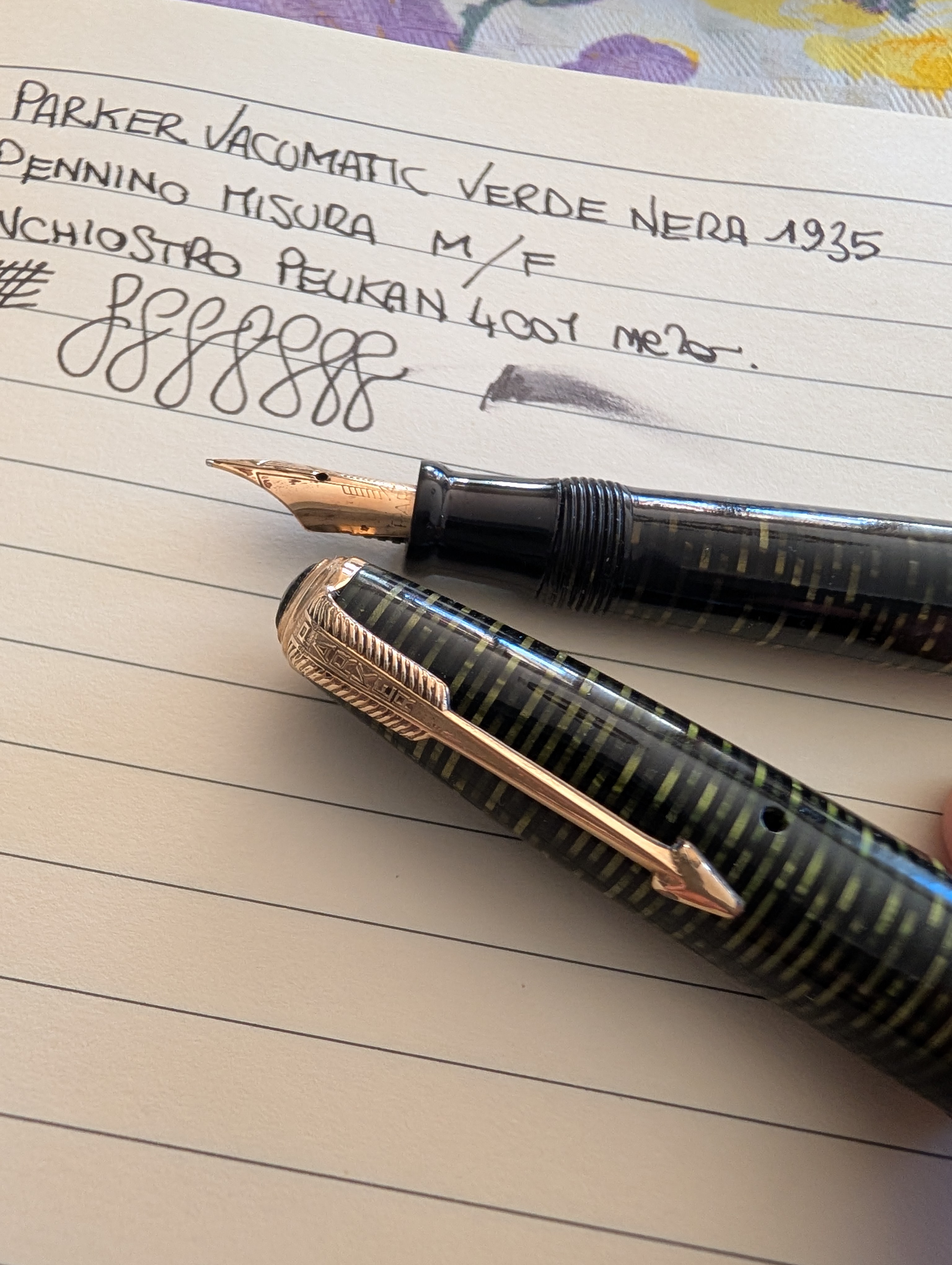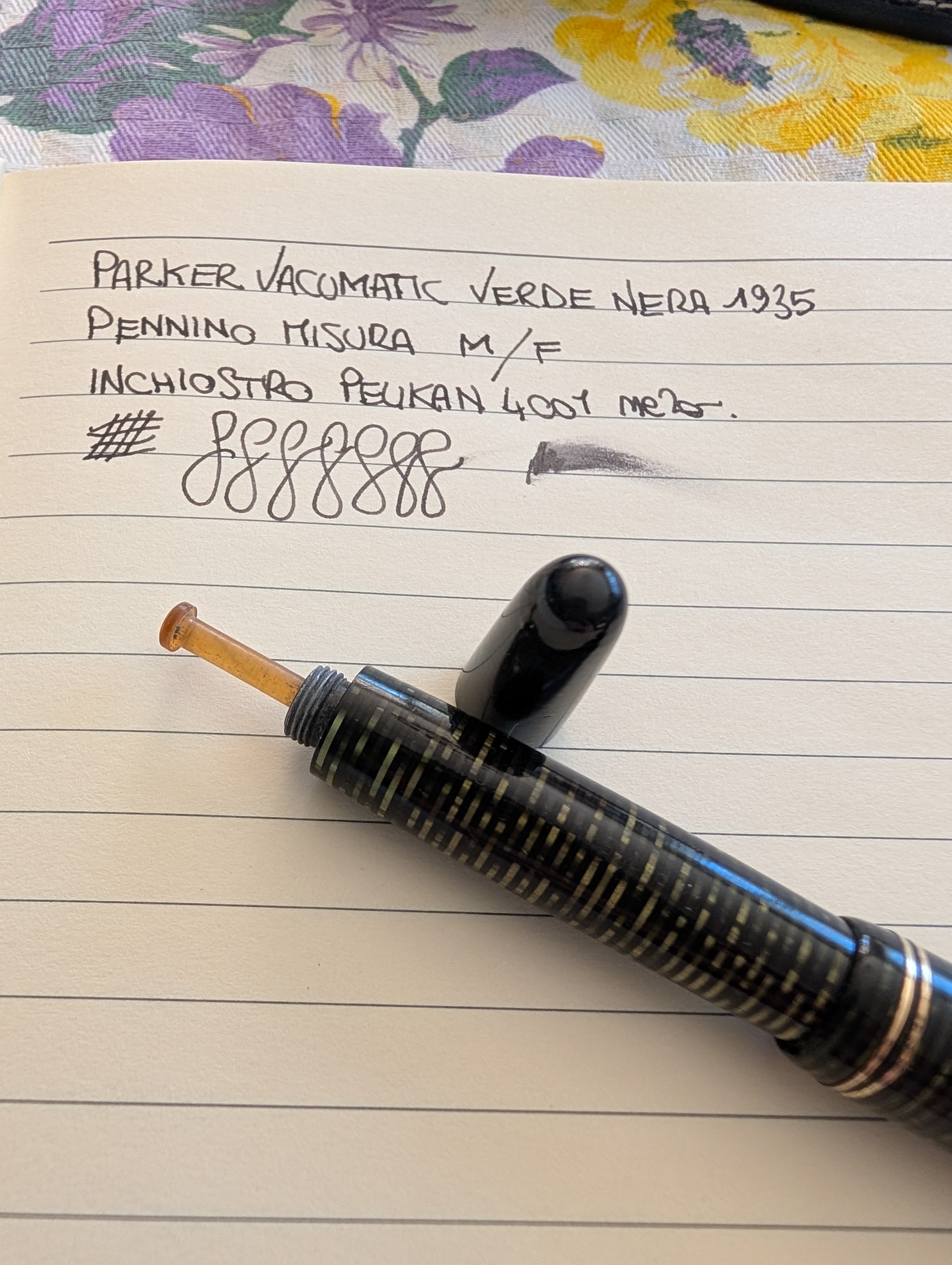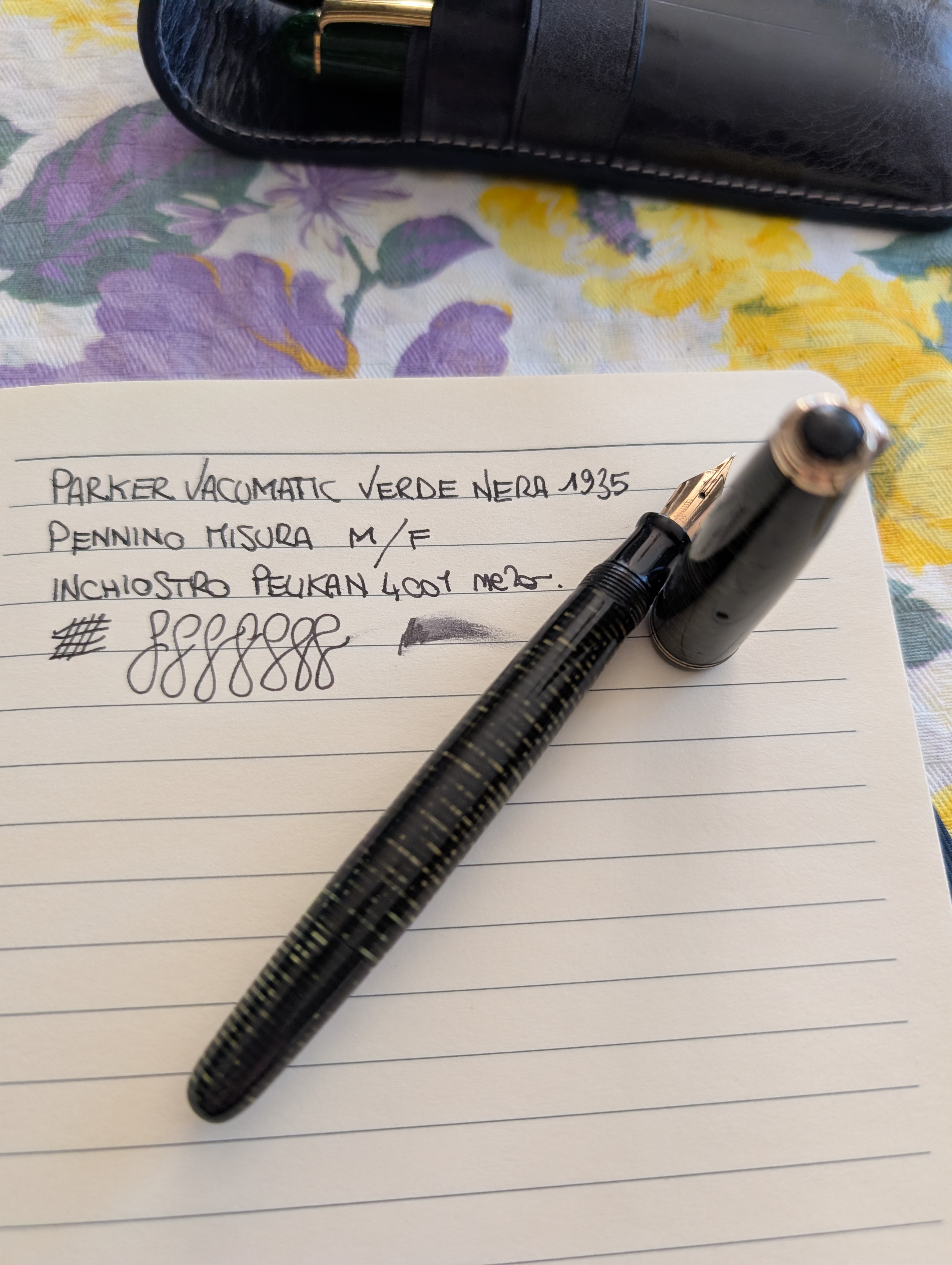 Buona giornata a tutti ! Mi ributto anche io nella mischia con questa Vacumatic arrivata ieri pomeriggio. L'anno di questo specifico modello dovrebbe essere il 1935 trovata su noto sito e sono riuscito a prenderla ad un prezzo davvero ottimo, per quello che l'ho pagata mi aspettavo qualche sorpresa e invece sono stato fortunato che tutto va bene, almeno in apparenza. Il sistema di caricamento è ancora perfettamente funzionante. Il pennino ha un tratto che definirei tra il medio e il fine. Il fusto della penna però non mi permette di vedere la carica d'inchiostro e questo potrebbe essere dovuto a residui di precedenti cariche nel corso degli anni credo.