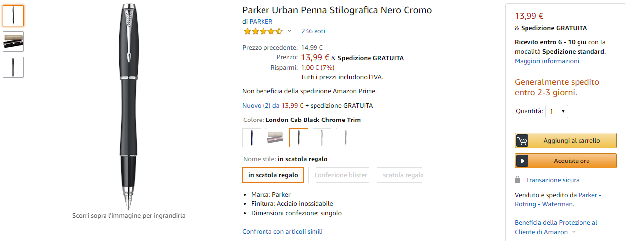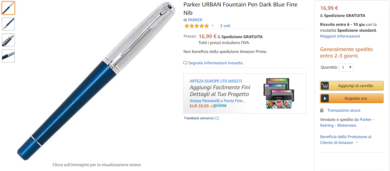 ti confermo (ne ho già acquistate 3 + una in arrivo) che quelle che ho ricevuto io sono arrivate con allegata fattura Newell (Proprietaria di Parker e Waterman)Lamy ha scritto: ↑lunedì 25 maggio 2020, 9:53 Ero dubbioso sulla legittimità di quelle Parker quindi ho chiamato la Newell e mi hanno confermato che sono loro che vendono le Parker a poco. Hanno sede principale ad Atlanta e due distaccamenti in Europa: uno a Milano e uno a Ginevra da cui spediscono le penne di cui sopra.