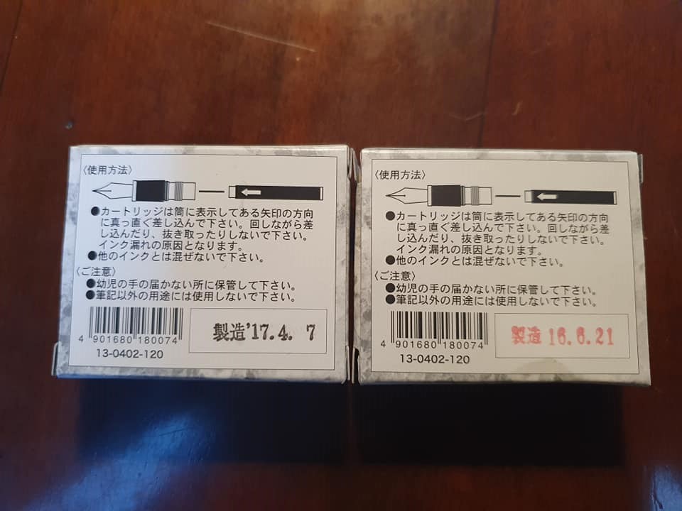Come potete vedere anche l'inchiostro in cartuccia Sailor riporta quella che sembrerebbe la data di scadenza, ma non conoscendo il giapponese non posso giurarci. La confezione con scadenza 16.6.21 non mi ha dato alcun problema, mentre l'altra con scadenza '17.4.7 non mi ha convinto affatto; con quest'ultima la mia Sapporo presenta problemi di scarso flusso e il pennino scrive a tratti.