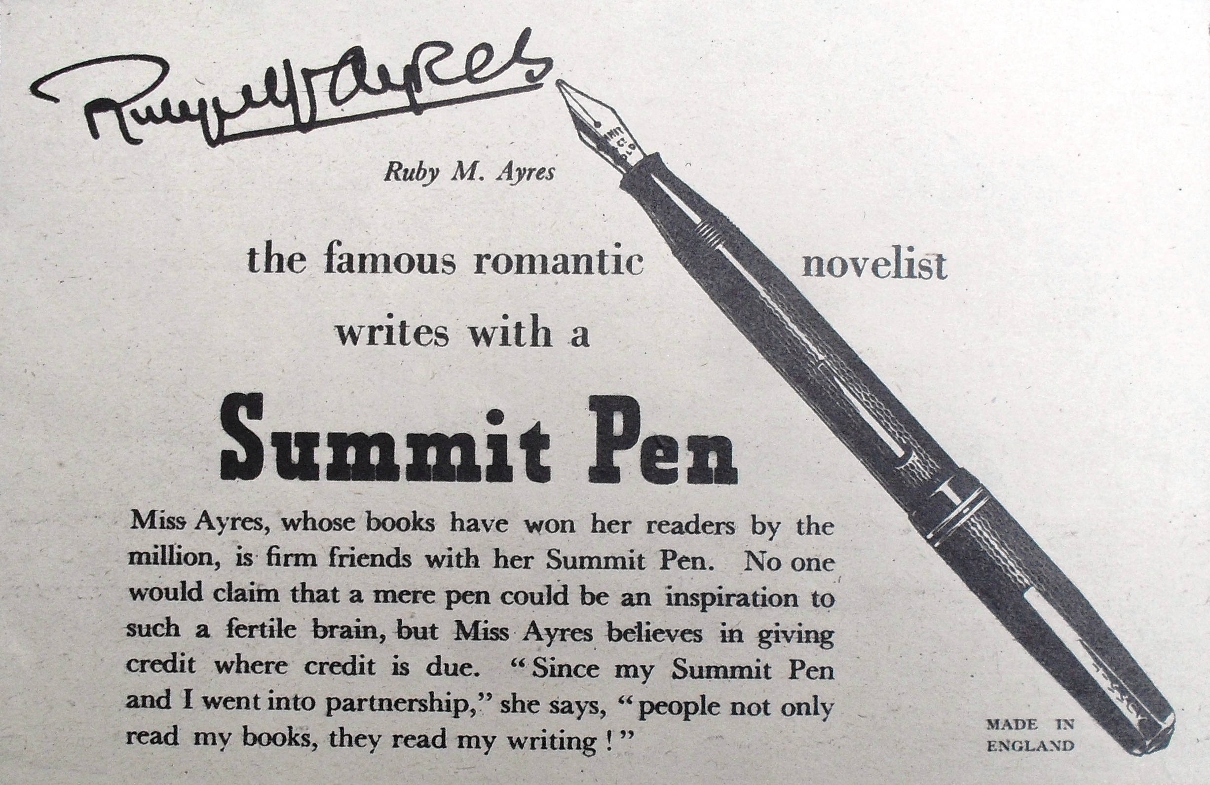 Il secondo reperto pone l’accento sull’utilizzo della S. 175 mk2 da parte di Ruby M. Ayres, popolare scrittrice di romanzi rosa, che affermava: “Da quando io e la mia Summit siamo diventati partners, il pubblico non legge solo i miei libri, ma la mia scrittura”, intendendo in questo modo suggerire una preferenza per questa stilografica rispetto alla macchina da scrivere.