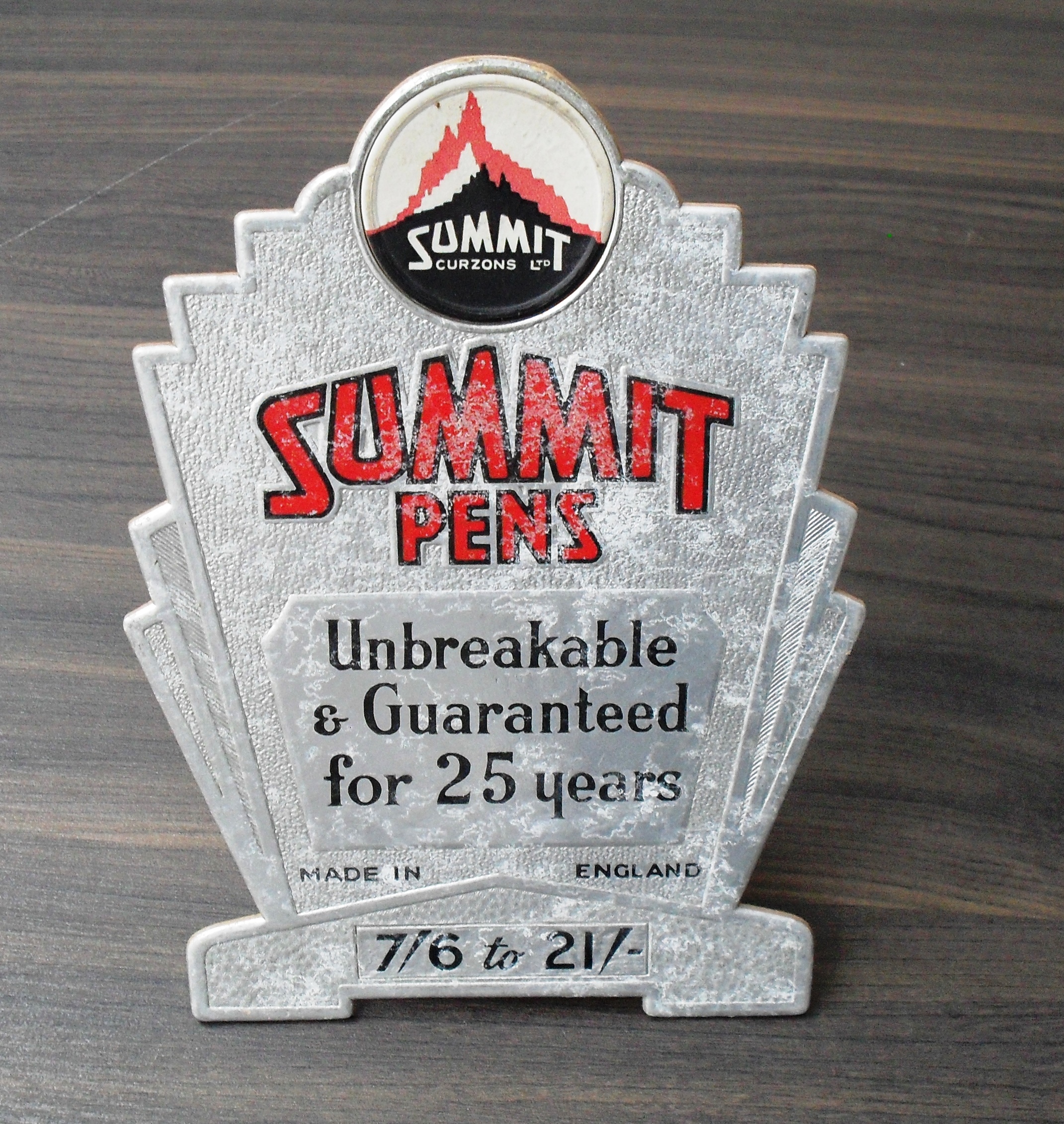 Lo stand a ventaglio (144 x 197 mm) non pubblicizzava un modello in particolare, ma tutta la gamma in celluloide, introdotta nel 1930, garantita per 25 anni e con un listino prezzi che andava dai 7 scellini e 6 pence ai 21 scellini.