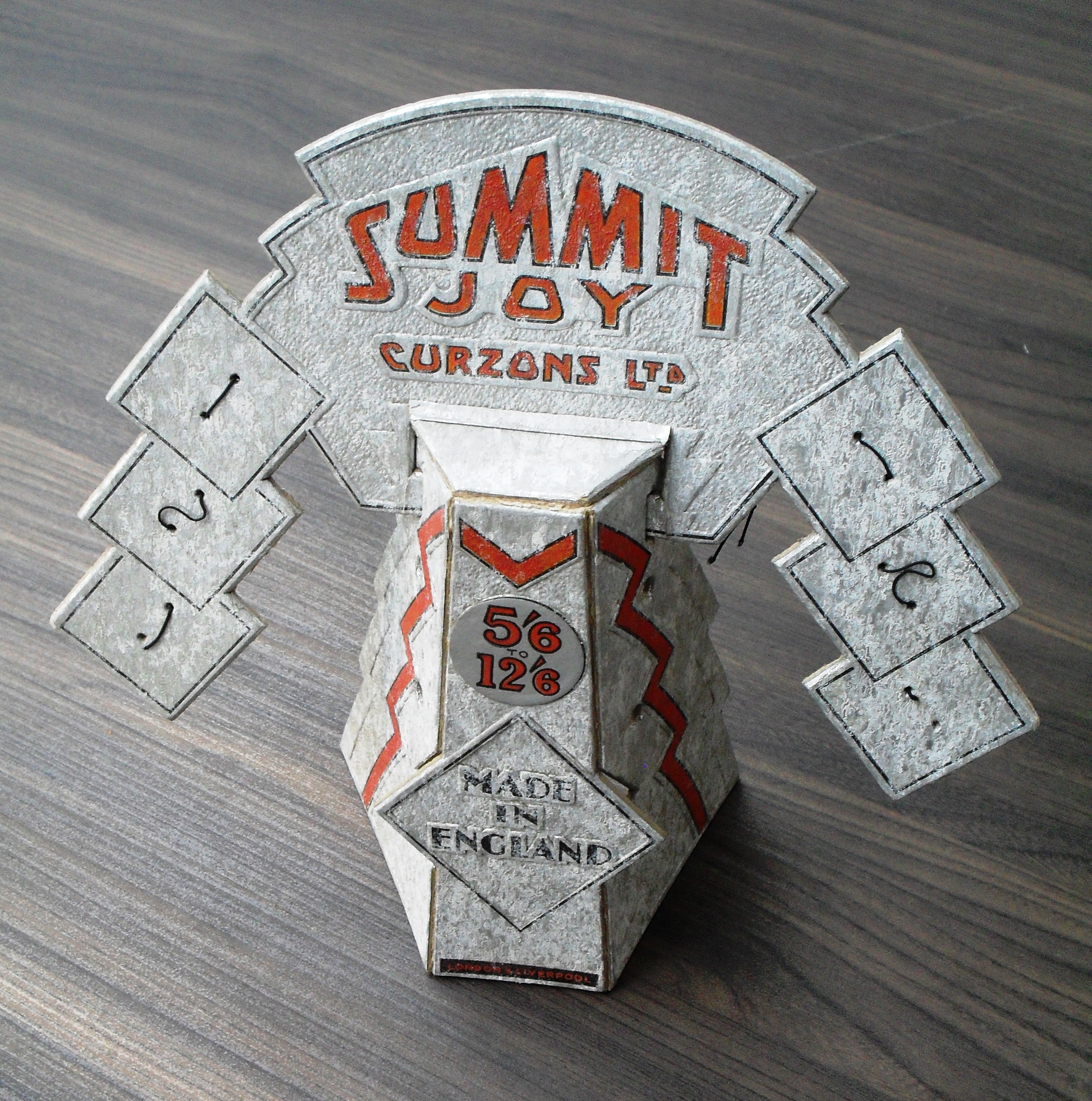 Lo stand di dimensioni maggiori (267 x 255 mm), che porta ancora quasi tutti gli elastici destinati a sostenere le penne, è invece dedicato al modello “Joy”, una stilografica di dimensioni contenute che si distinse anche per le sue colorazioni originali e brillanti. Davvero tipicamente art deco il carattere scelto per la scritta “Made in England” e significativa la menzione delle due città di Londra e Liverpool: nella prima il gruppo aveva stabilito il suo quartiere generale commerciale (nella prestigiosa “Audrey House”), nella seconda si trovavano gli stabilimenti produttivi.