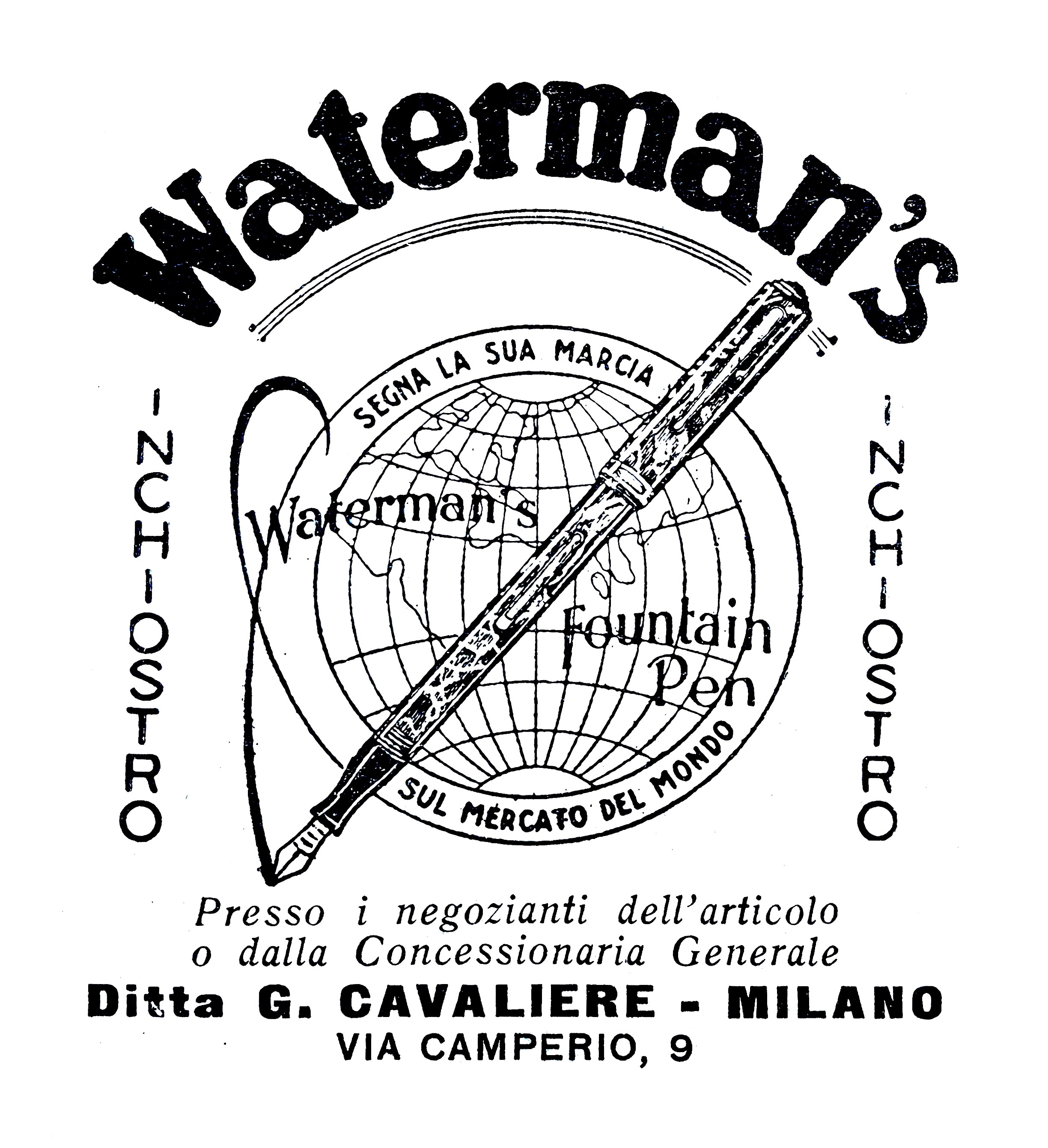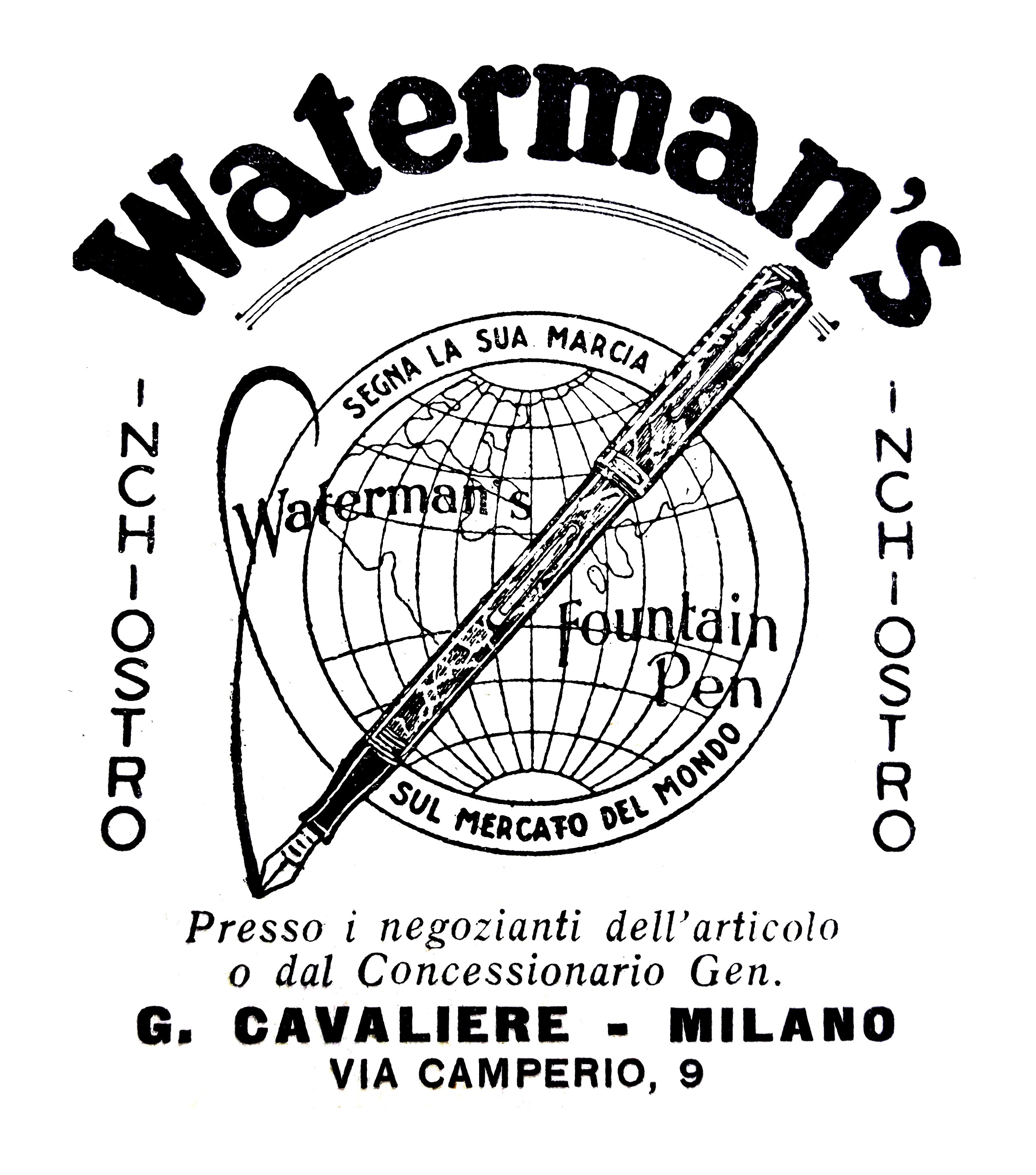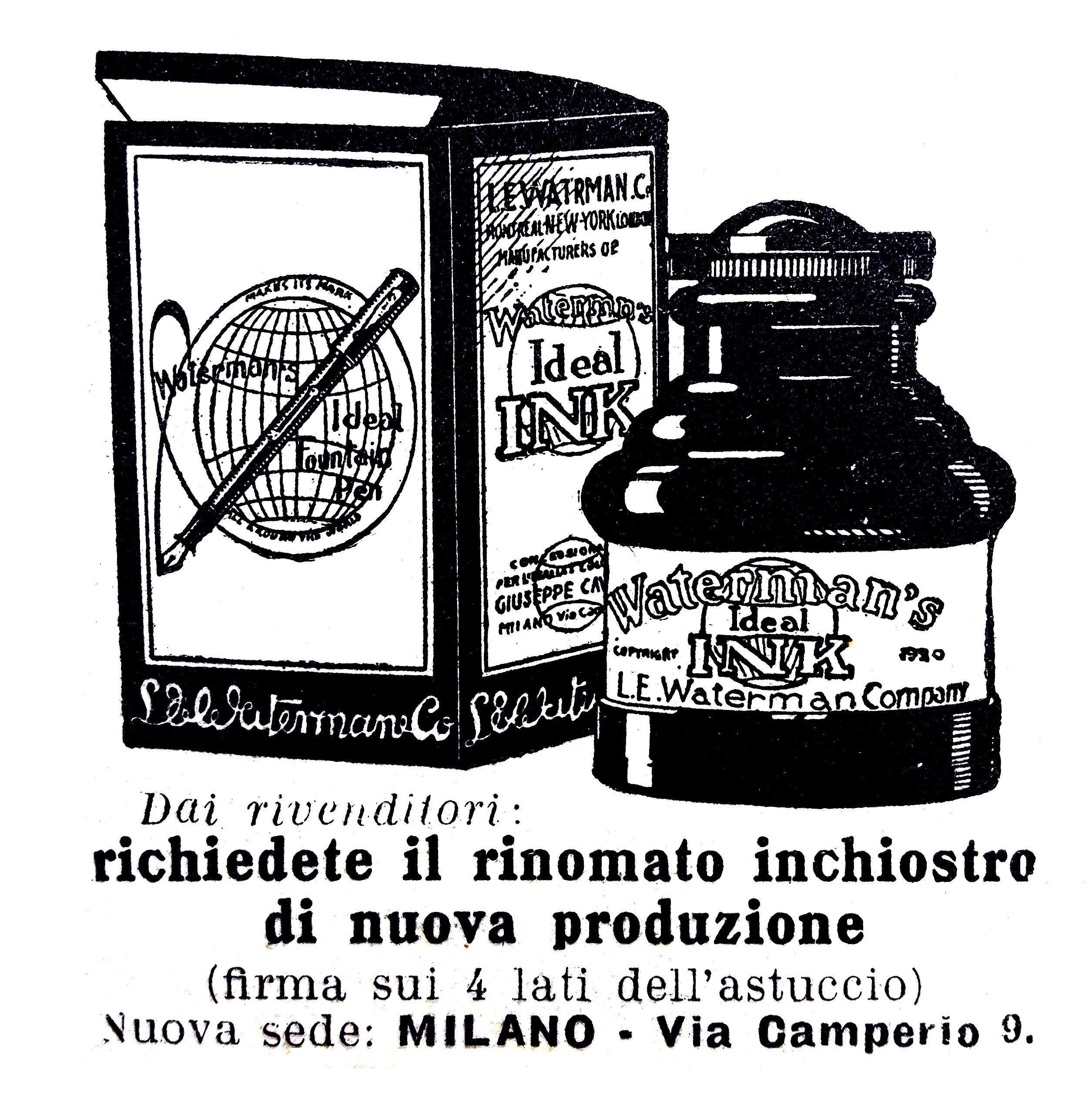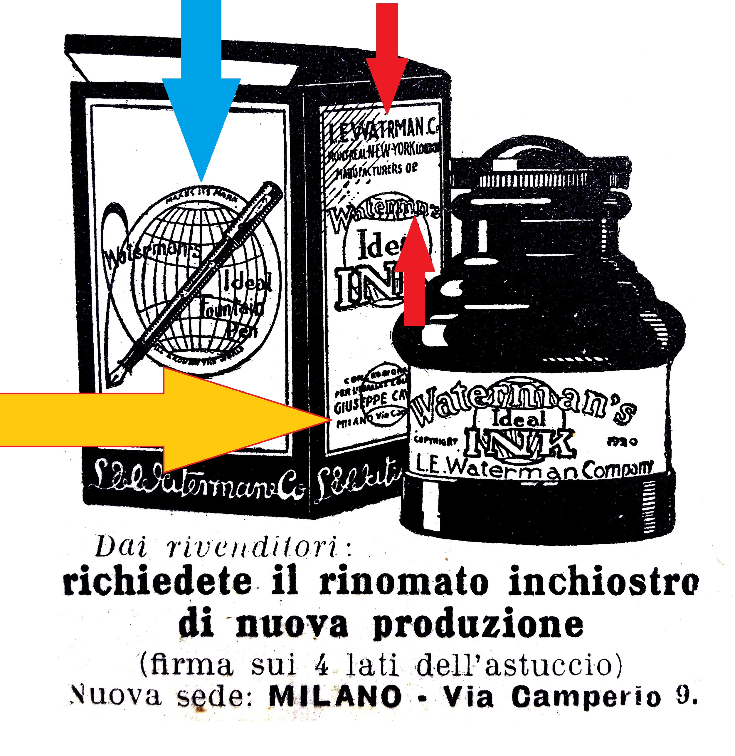 La prima è di un inchiostro, WATERMAN Ideal INK, che veniva prodotto qui in Italia, su licenza della Waterman di New York dal Concessionario per l’Italia e Colonie, Giuseppe Cavaliere: