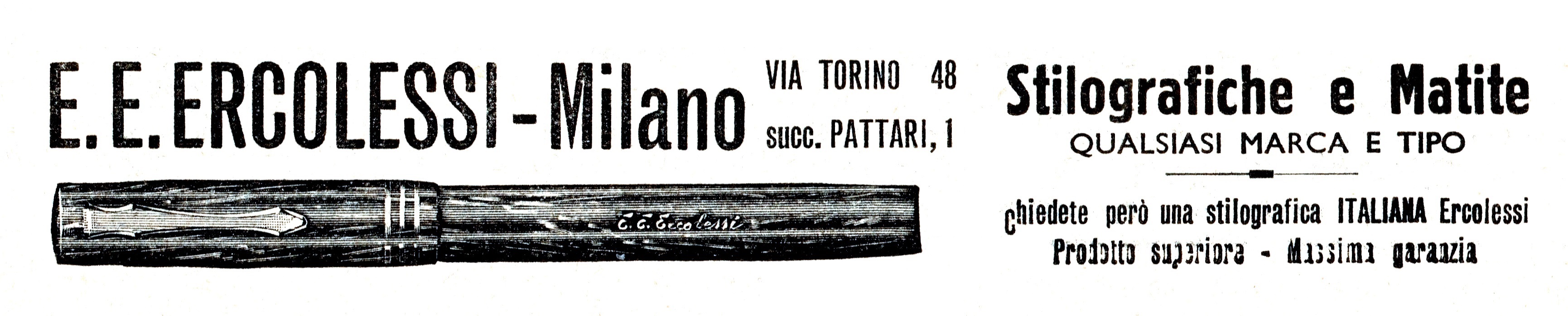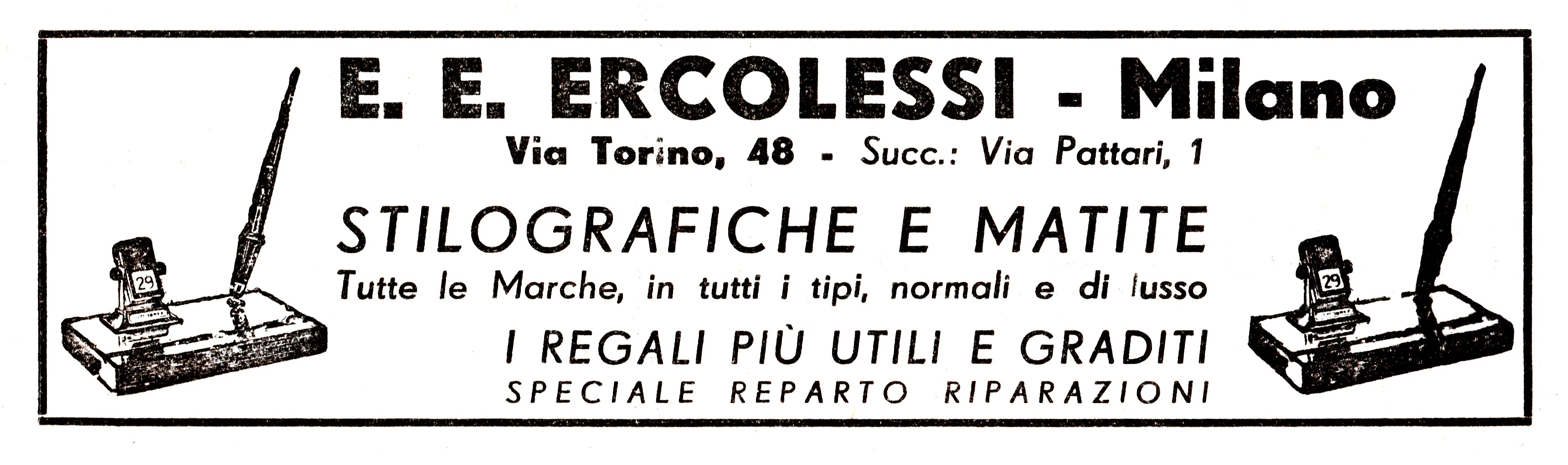 Ma nell’imminenza del Natale Ercolessi rinuncia bellamente a spezzare una lancia in favore delle penne italiche (quello era l’andazzo del periodo, e sui giornali tutti, bene o male, si adeguavano), e presenta uno stiloforo con calendario che se non è americano è comunque ben copiato (ancora una volta), perché a Natale i venditori di stilografiche hanno sempre fatto gli affari migliori e il ricarico sulle penne d’importazione poteva essere giustificato in mille modi e fatto digerire meno malvolentieri alla clientela più abbiente, che in centro a Milano non mancava comunque…