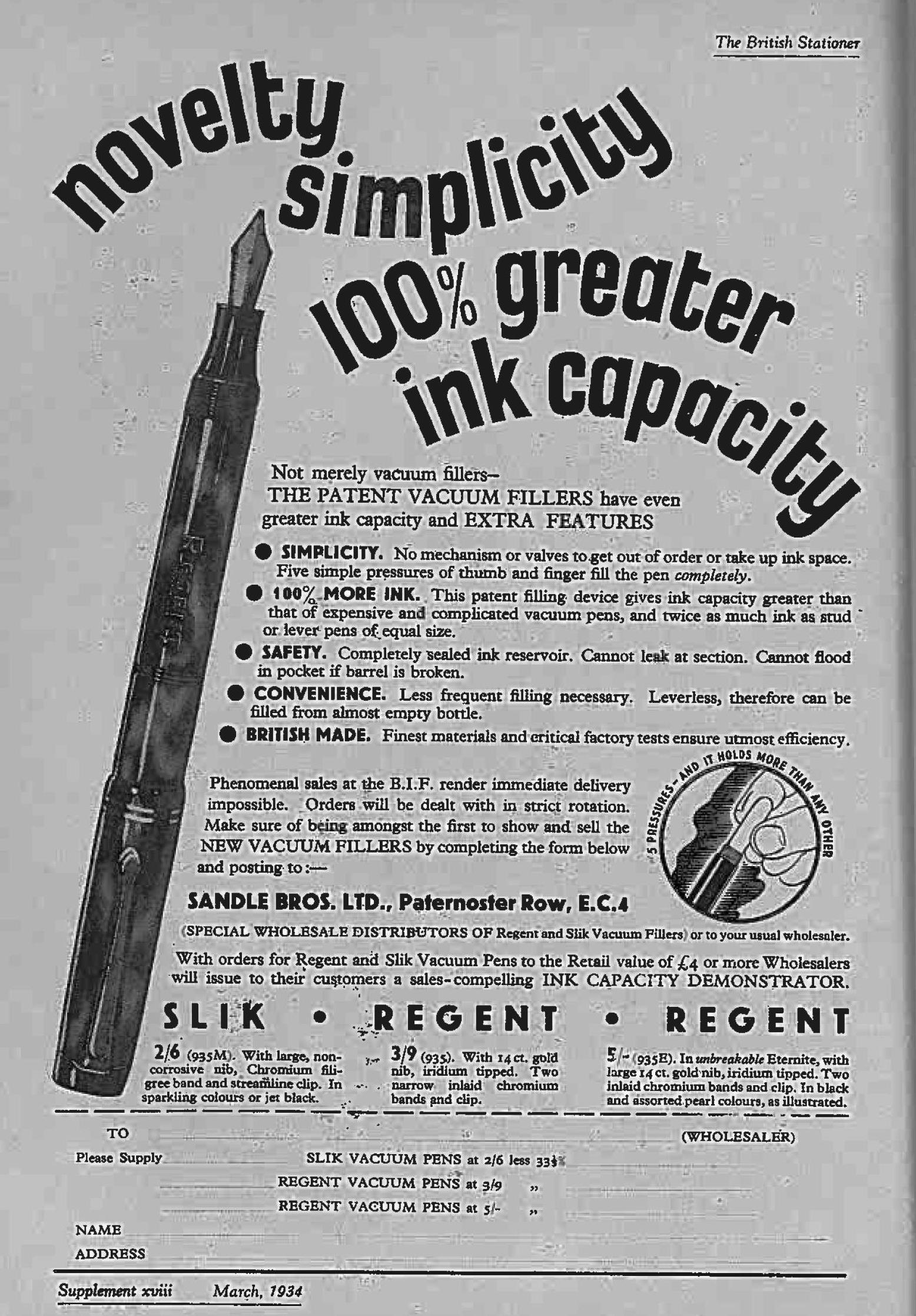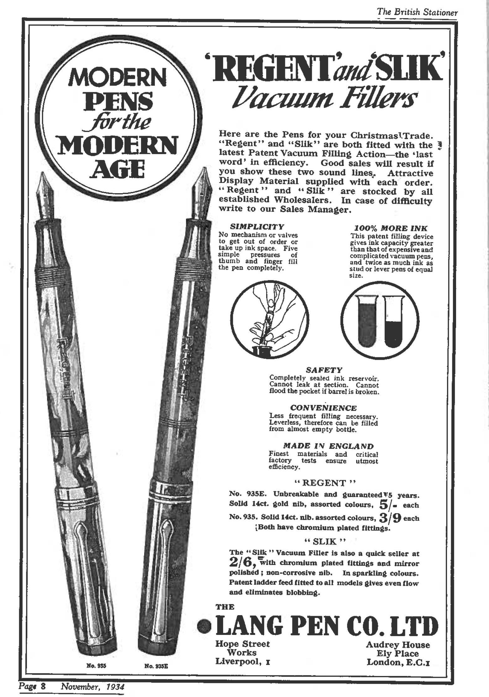 L’annuncio del Novembre 1934 appartiene alla campagna per il Natale di quell’anno ed è particolarmente interessante, perché identifica con i relativi codici (935 e 935E) i modelli Regent pubblicizzati, equipaggiati, così come la “Slik”, con un caricamento a pompetta, del quale viene sottolineato il vantaggio in termini di capacità d’inchiostro.