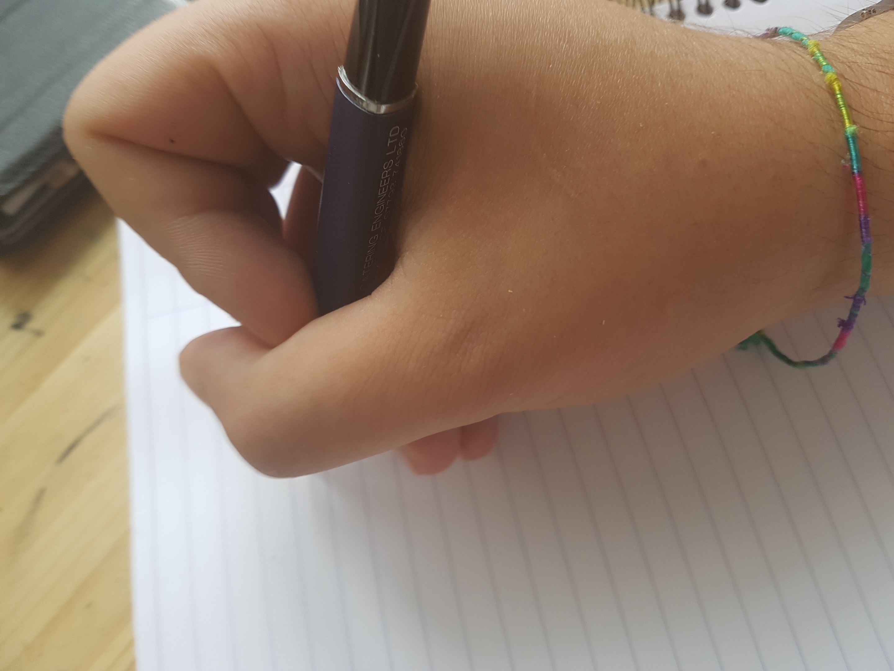 Se la mia mano fosse molto più piccola l'angolo acuto fra la penna e la carta sarebbe molto minore, il che porterebbe la corona che c'è intorno alla sfera, e che la mantiene in posizione, a toccare la carta.