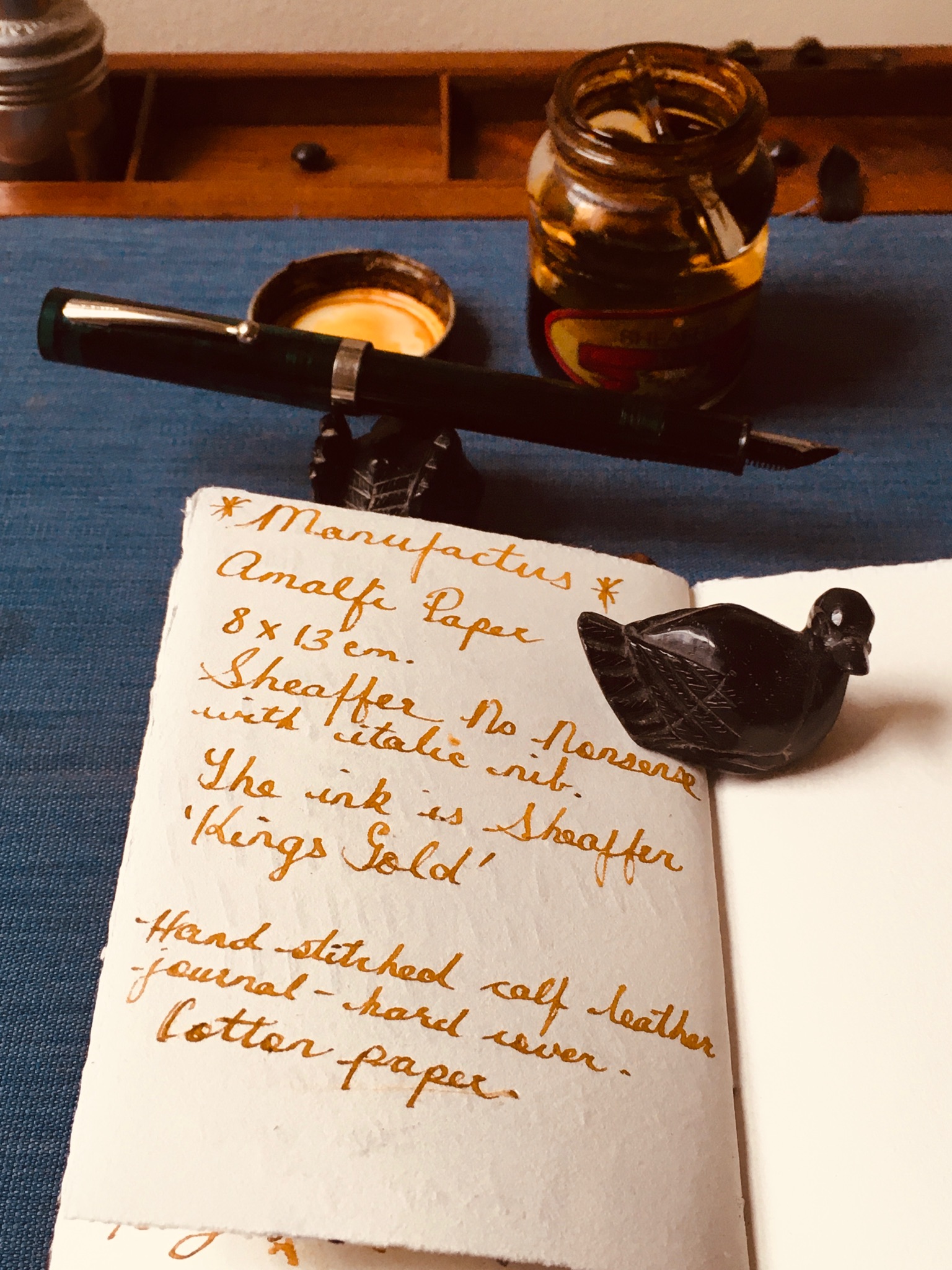 Grazie a tutti per le belle parole sui miei post precedenti. Andrea, hai ragione, è un piccolo taccuino ed è prodotto in Italia da Manufactus. La carta è di Amalfi. La penna che ho usato in questa foto è una Sheaffer No Nonsense e l'inchiostro è Sheaffer King's Gold.