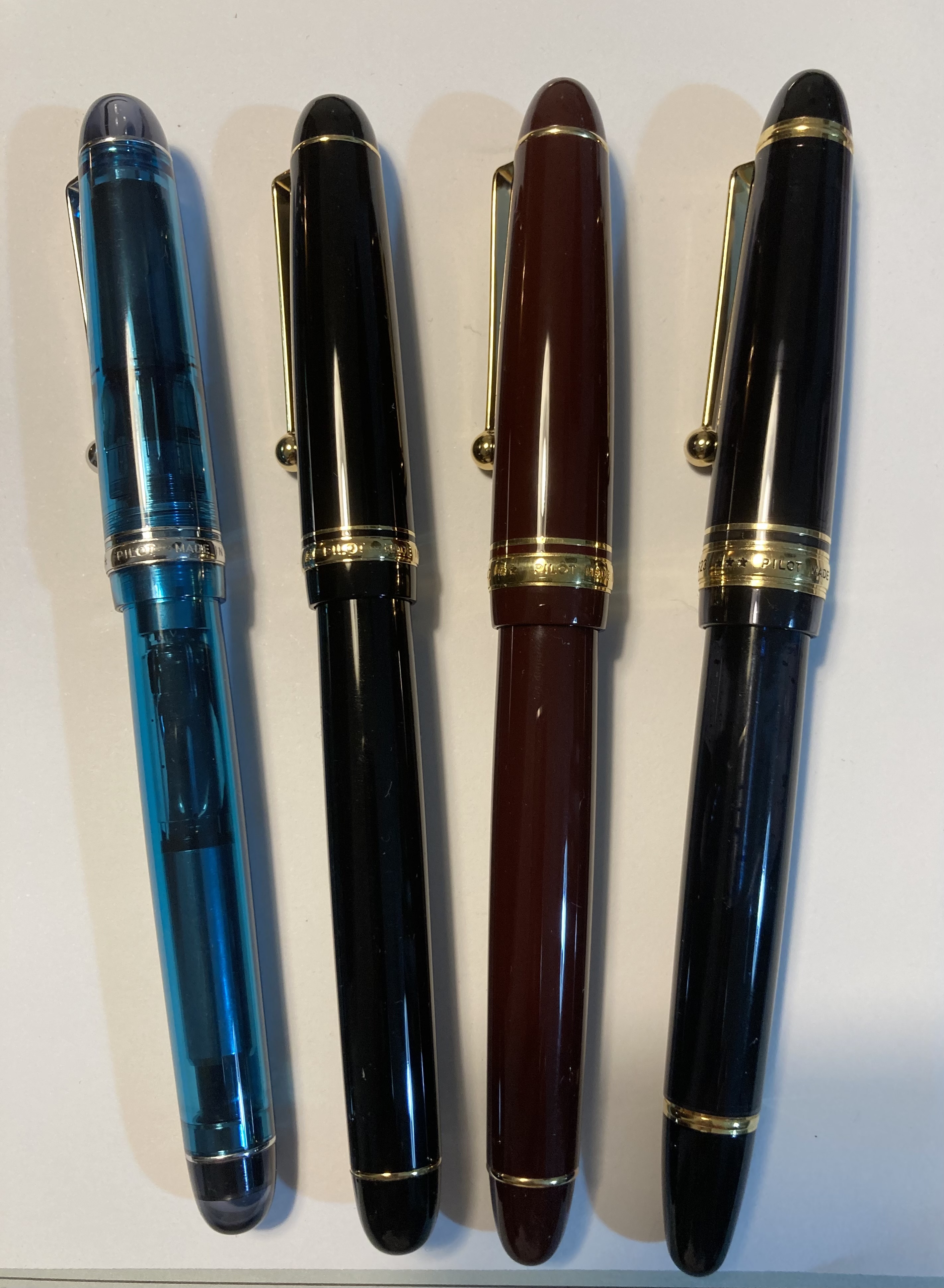 Pelikan M205 Moonstone, M200 Orange delight, M1000 Rennaisance Brown. Tutte con pennino EF effettivamente sottile (la M1000 ovviamente un po’ meno).