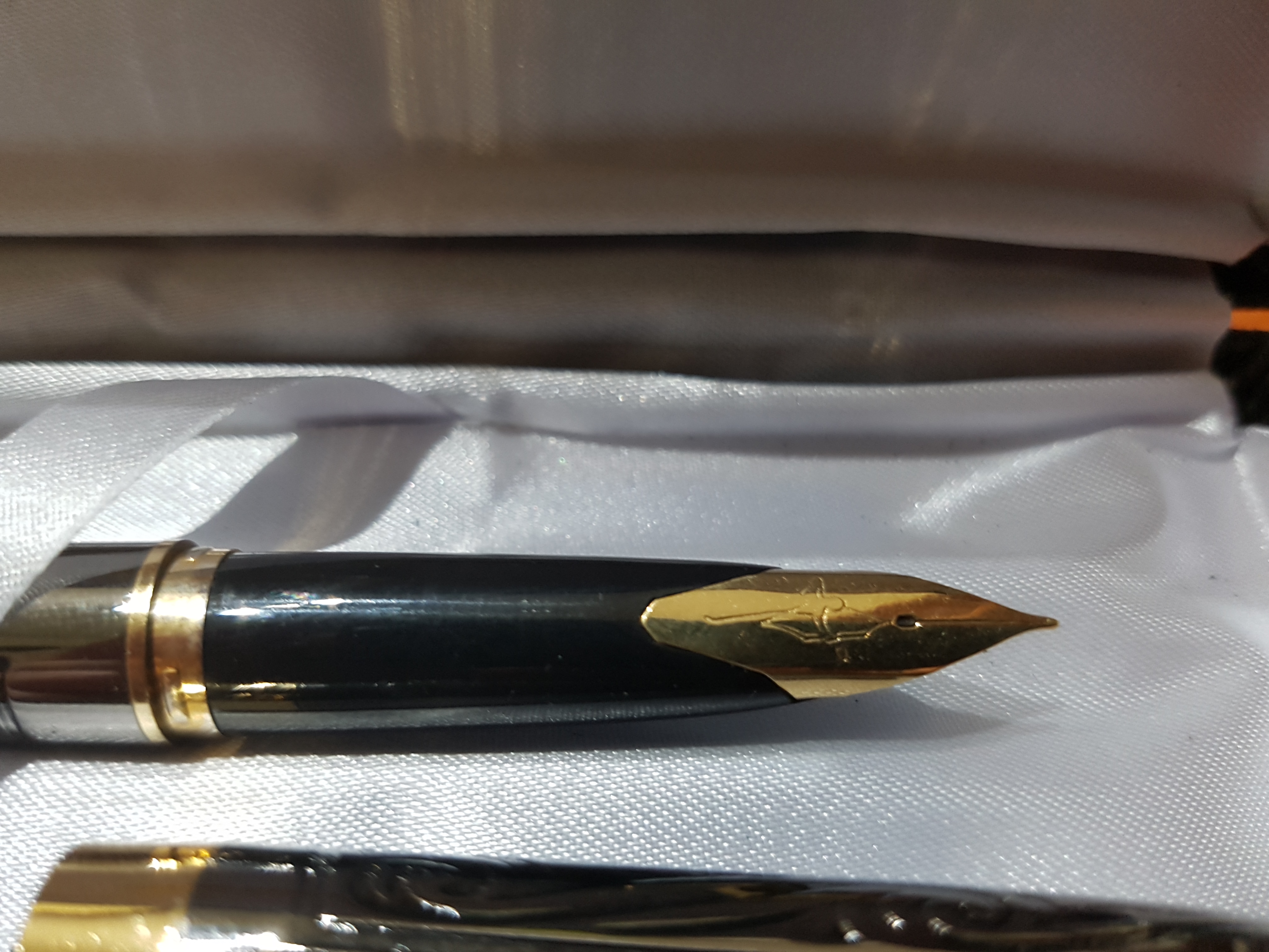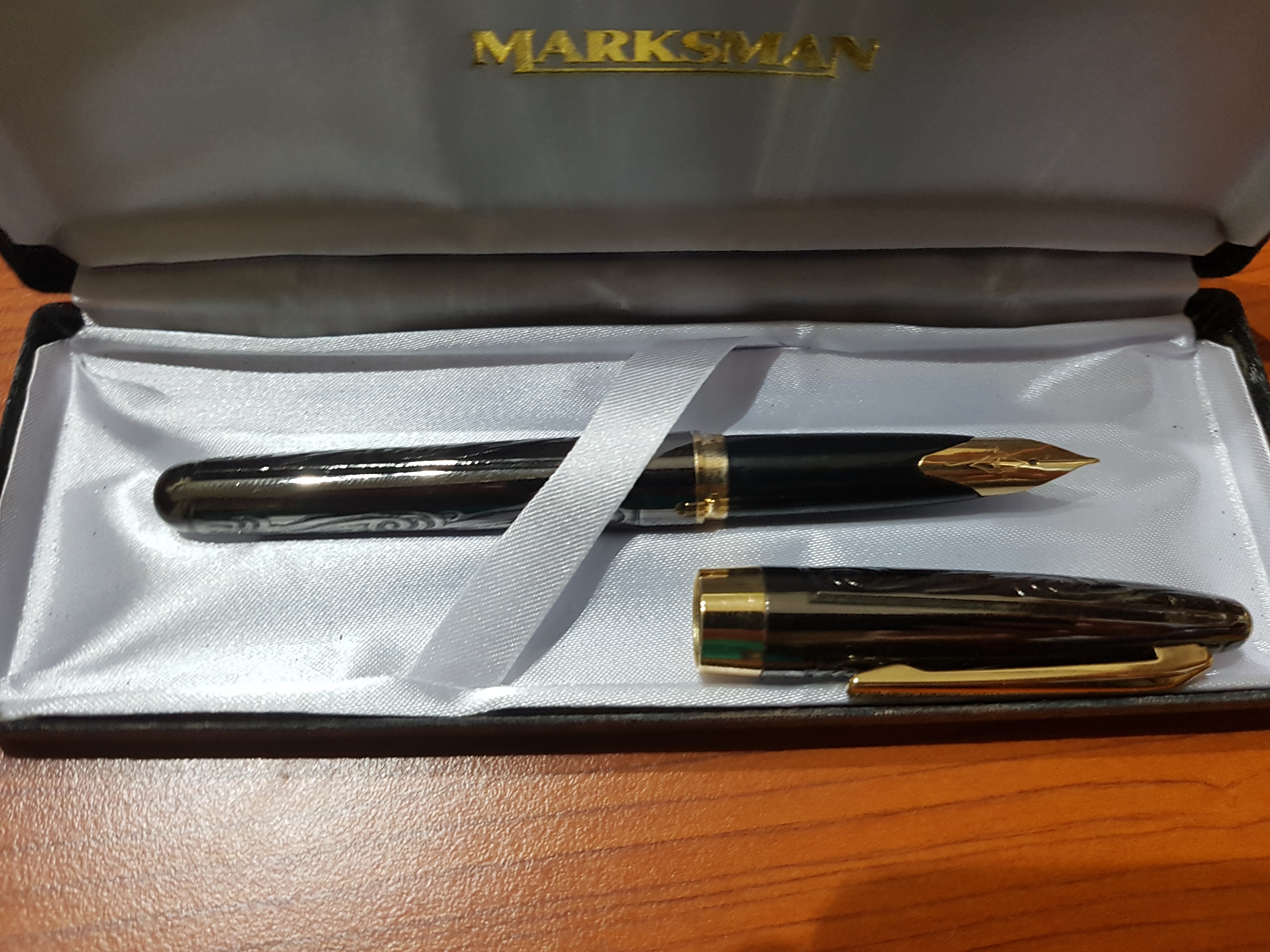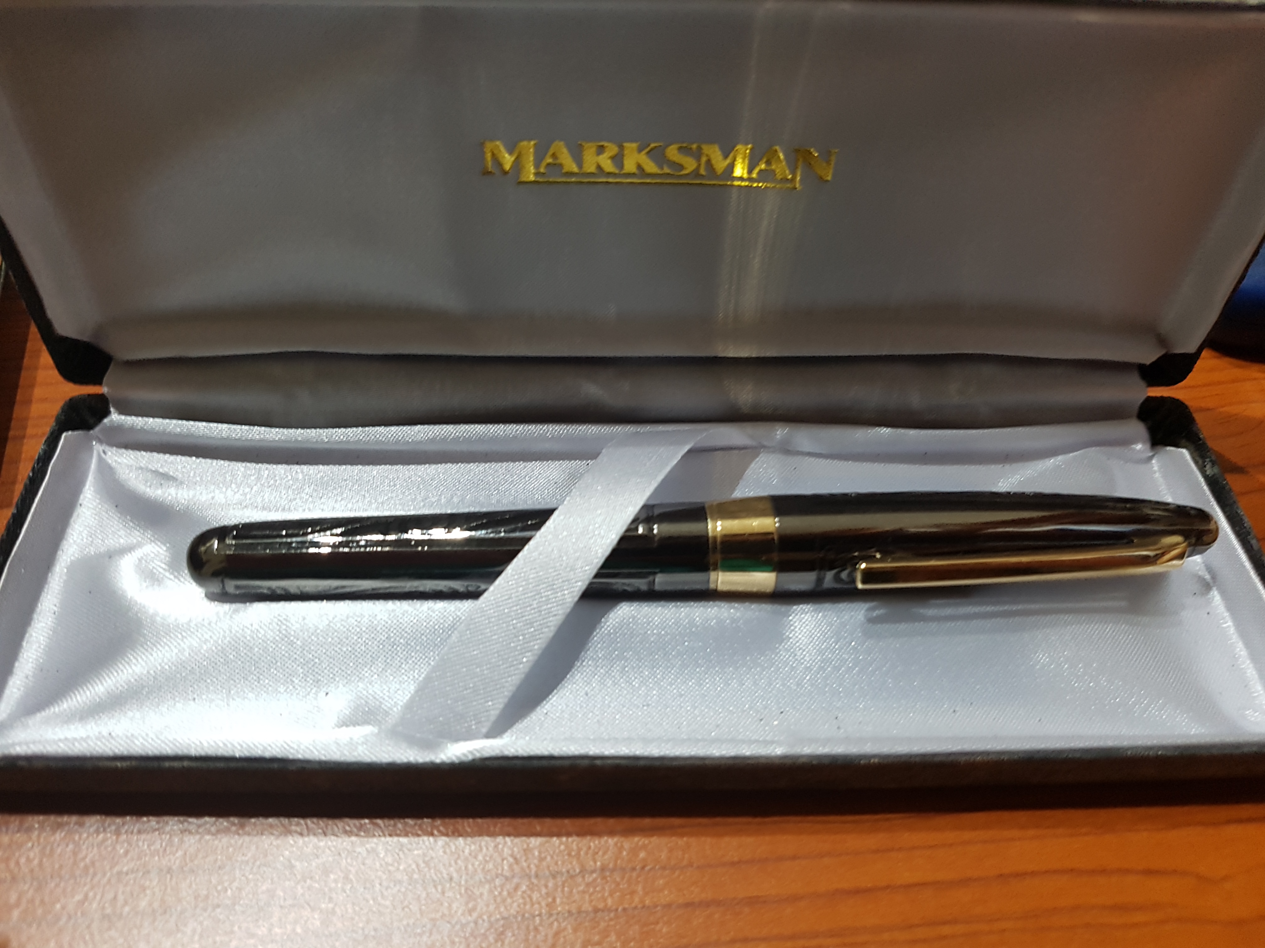 La Marksman non credo produca nulla, si limita a rimarchiare prodotti di altre aziende, nel caso di queste penna è probabile che il marchio originario sia la Pilot (il pennino comunque è di acciaio ed è stato anch'esso rimarchiato).