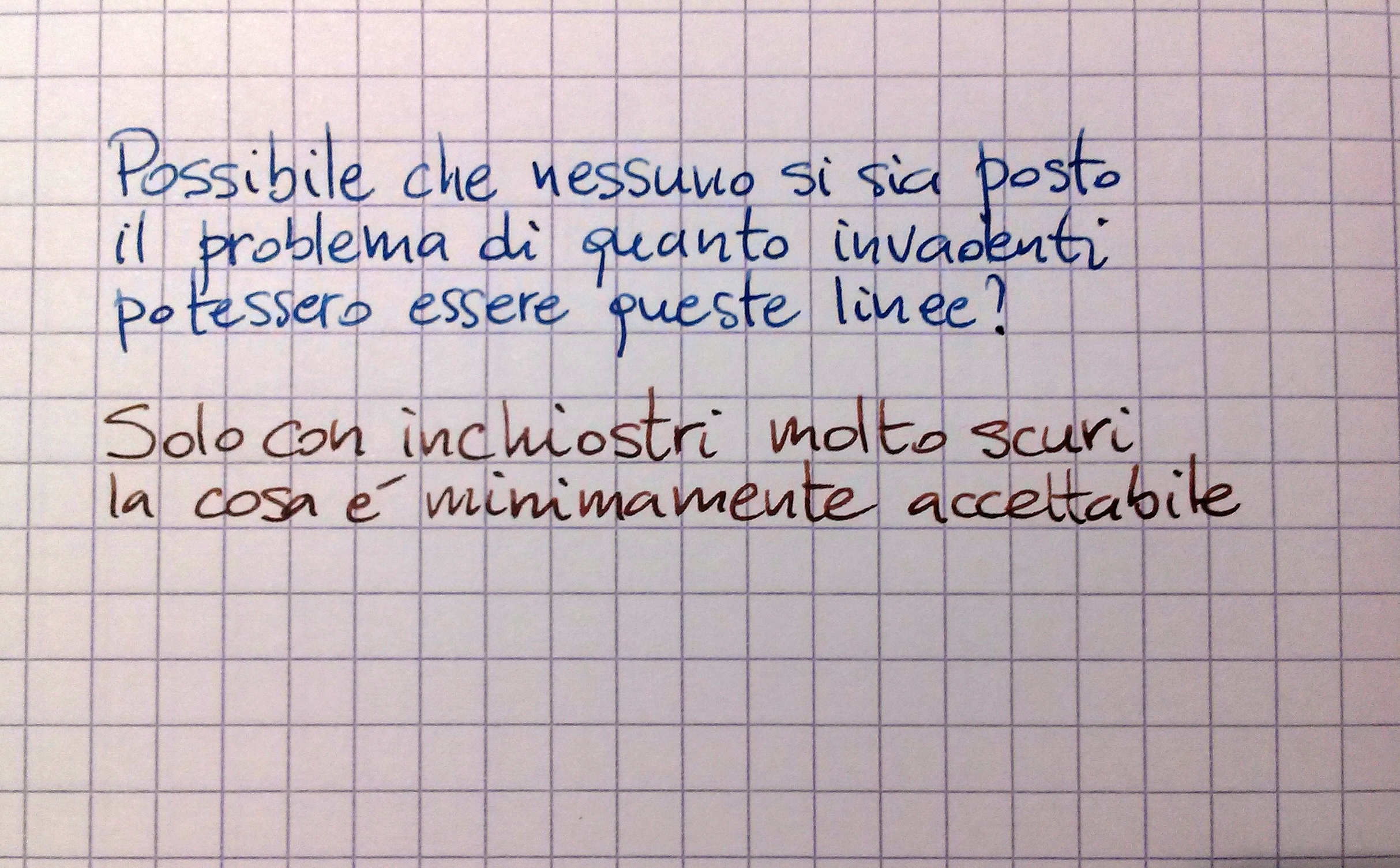 Appena arrivati ed aperti, la delusione è stata totale! La "quadrettatura" è tracciata con delle linee violacee estremamente marcate, al punto che con gli inchiostri più "light", scrivendo con interlinea 1, l'effetto è estremamente confusionario..