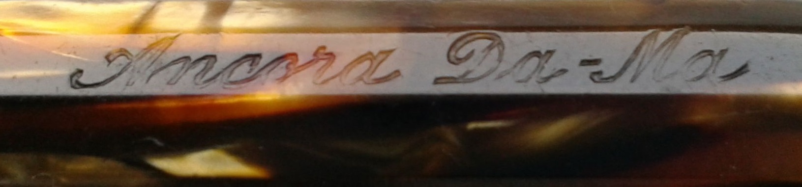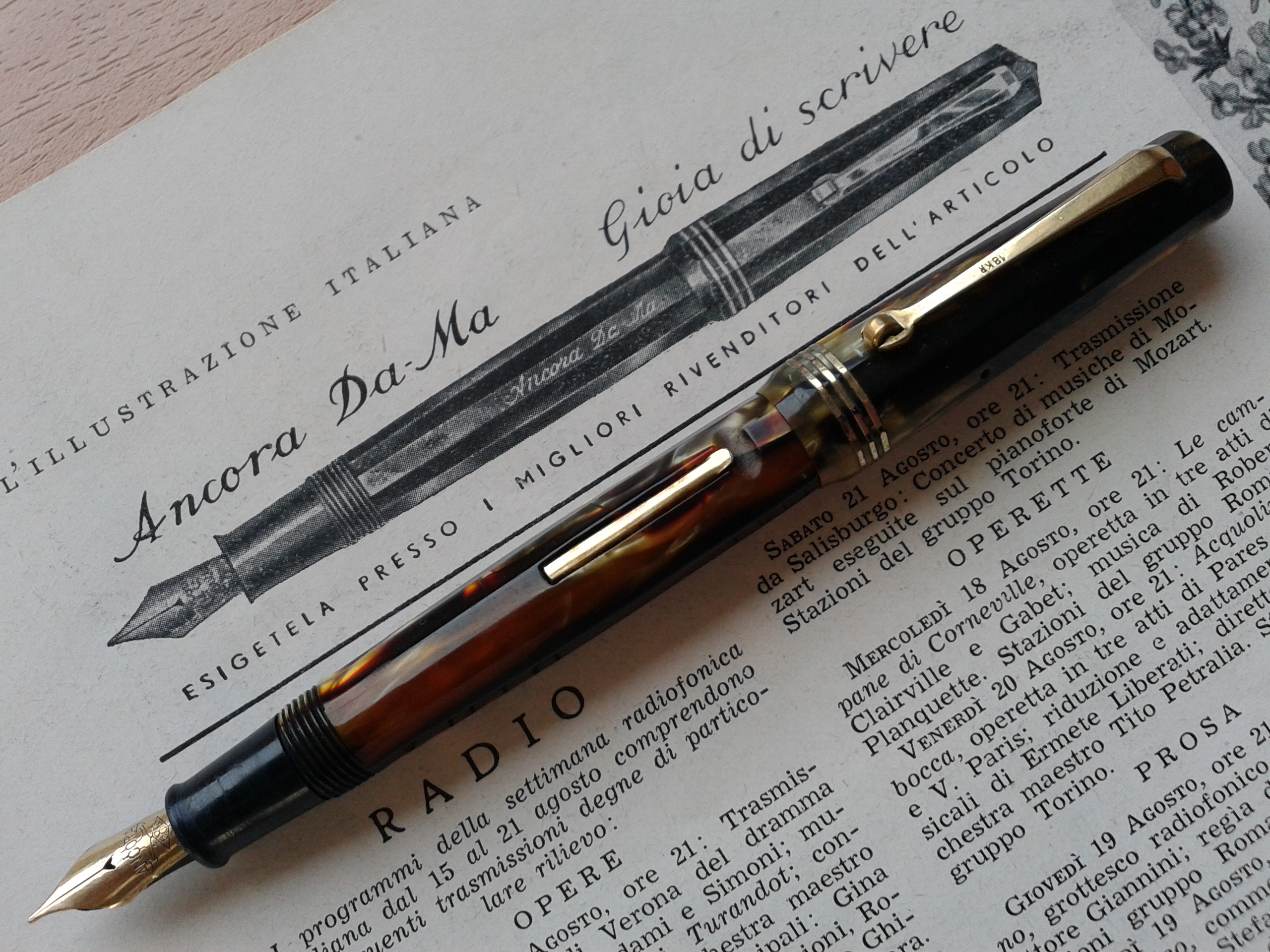 ANCORA Da-Ma misura piccola (lady's size) in celluloide striata ambra* tornita da barra piena, pennino Ancora in oro 585, parti metalliche a vista laminate in oro 18 KR, caricamento a levetta, prodotta in Italia nell'anno 1937.