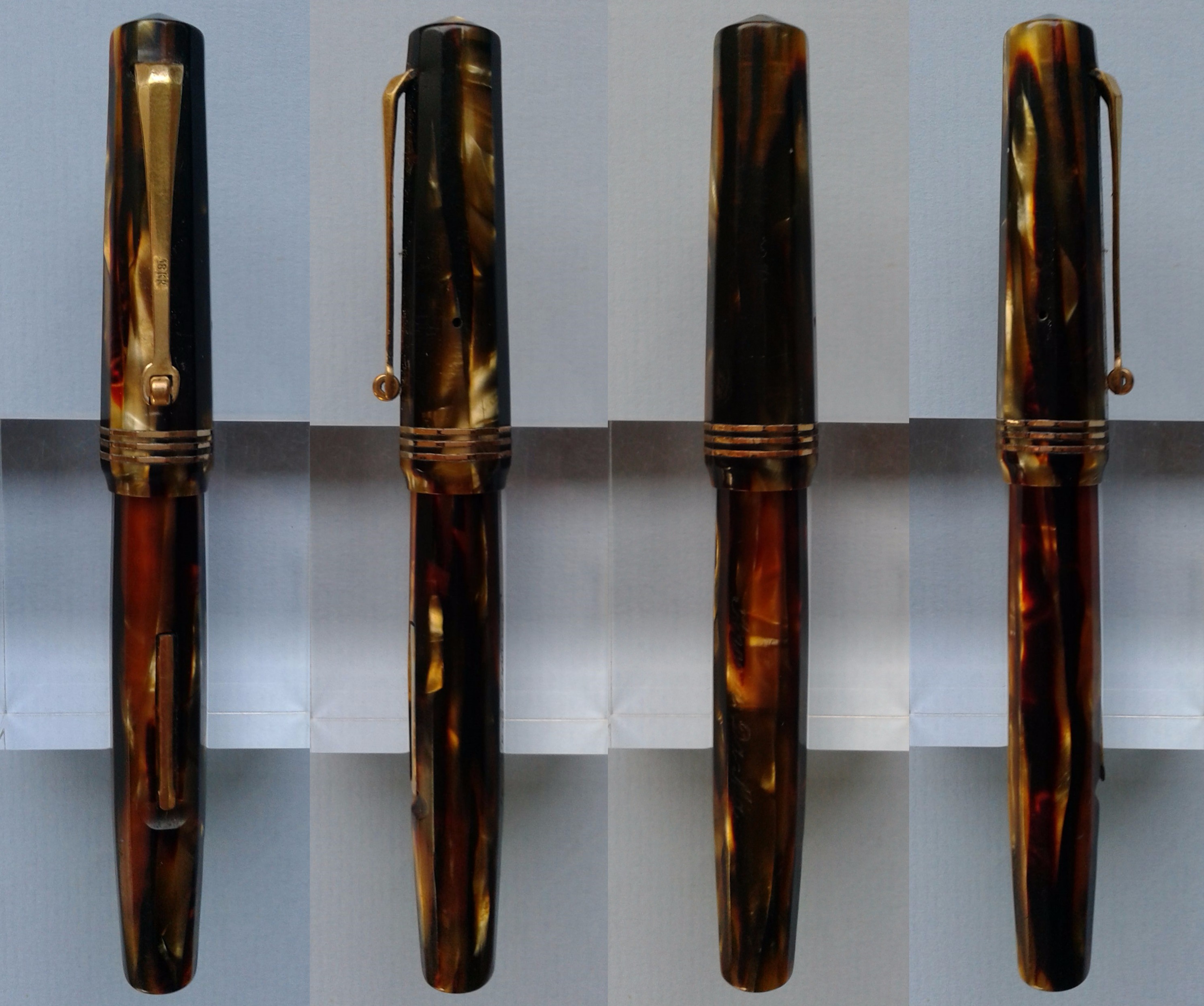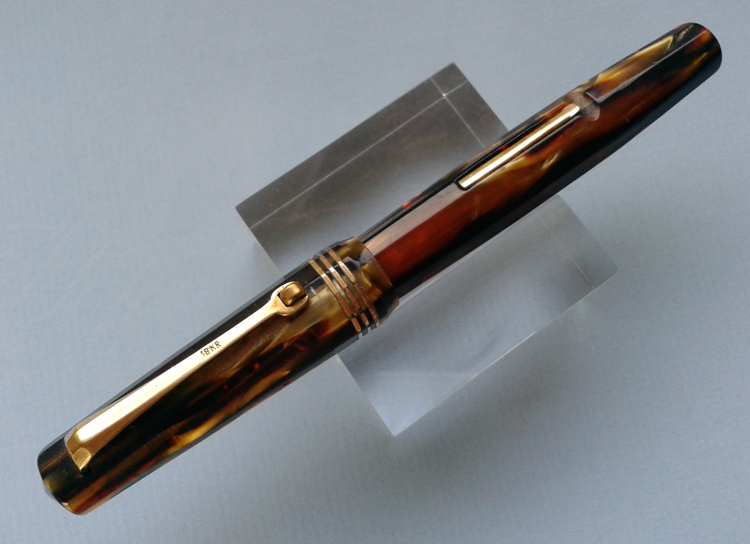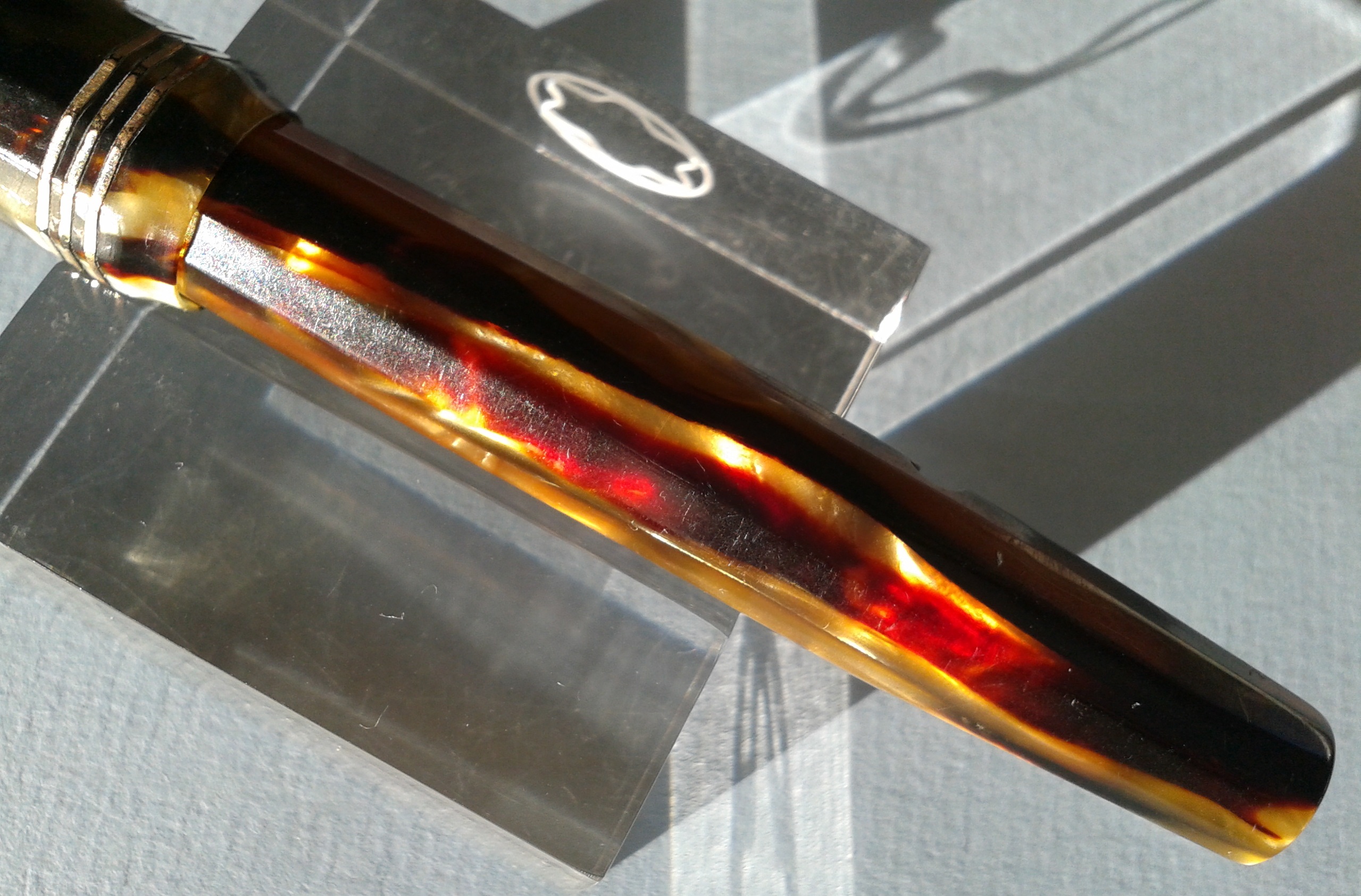 - se uno volesse assaggiare/mangiare la penna, cosa che, lo confesso, per poco quasi non mi accadeva, allora suggerisco di definire la celluloide di color "toffee-miele-ribes(rossi)-cioccolato-tartaruga(brodo)" 8-) ;