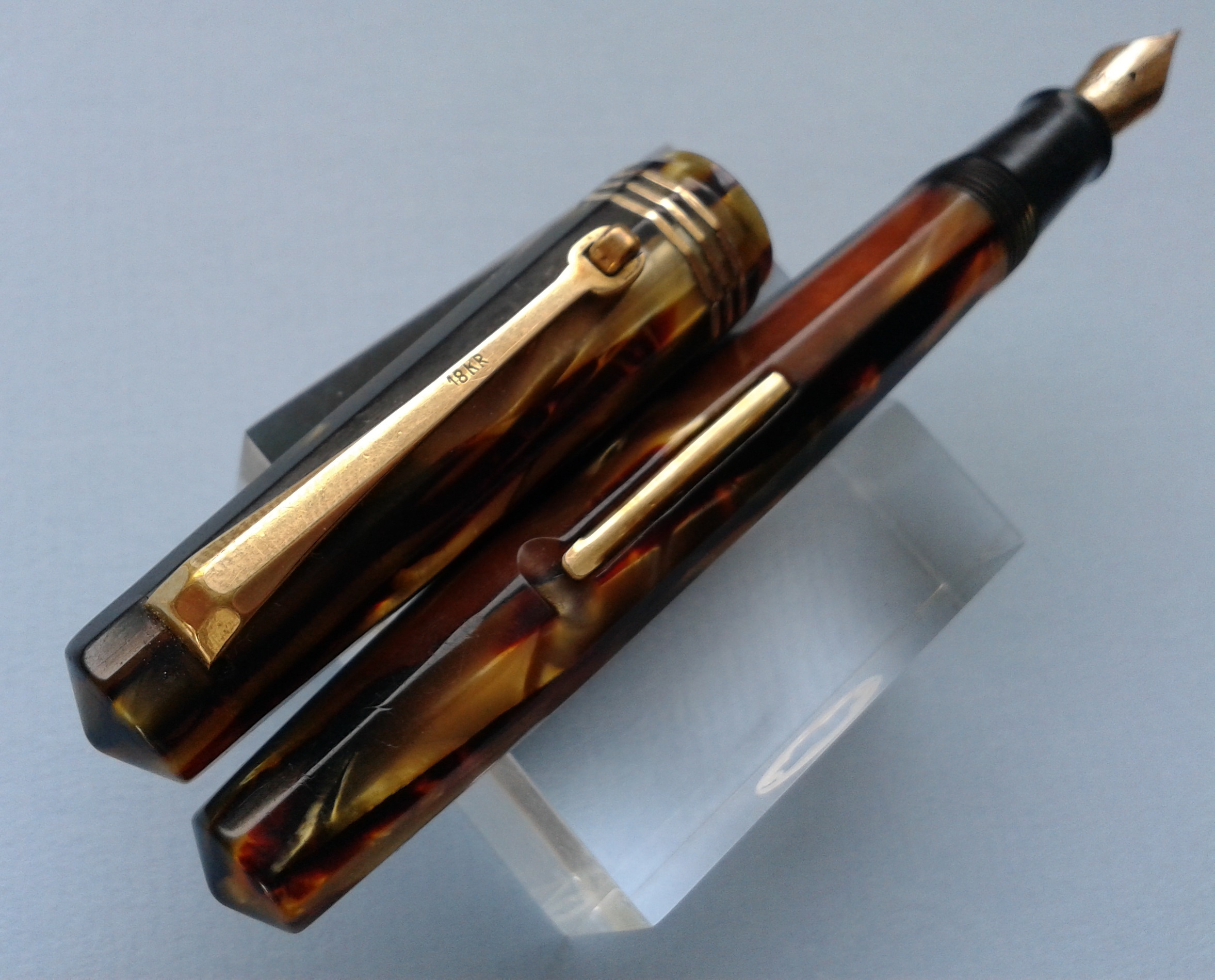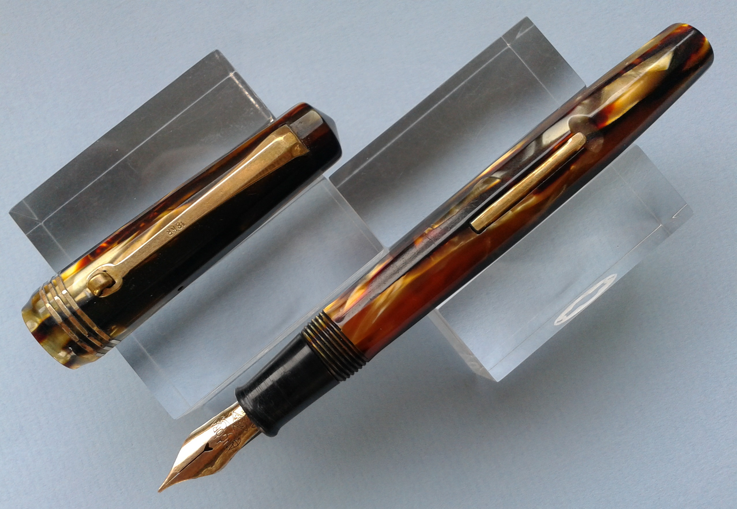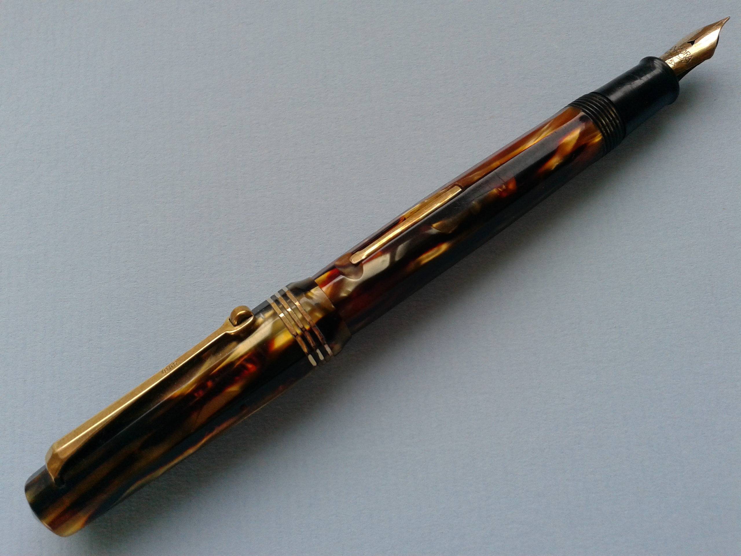 - se uno volesse assaggiare/mangiare la penna, cosa che, lo confesso, per poco quasi non mi accadeva, allora suggerisco di definire la celluloide di color "toffee-miele-ribes(rossi)-cioccolato-tartaruga(brodo)" 8-) ;