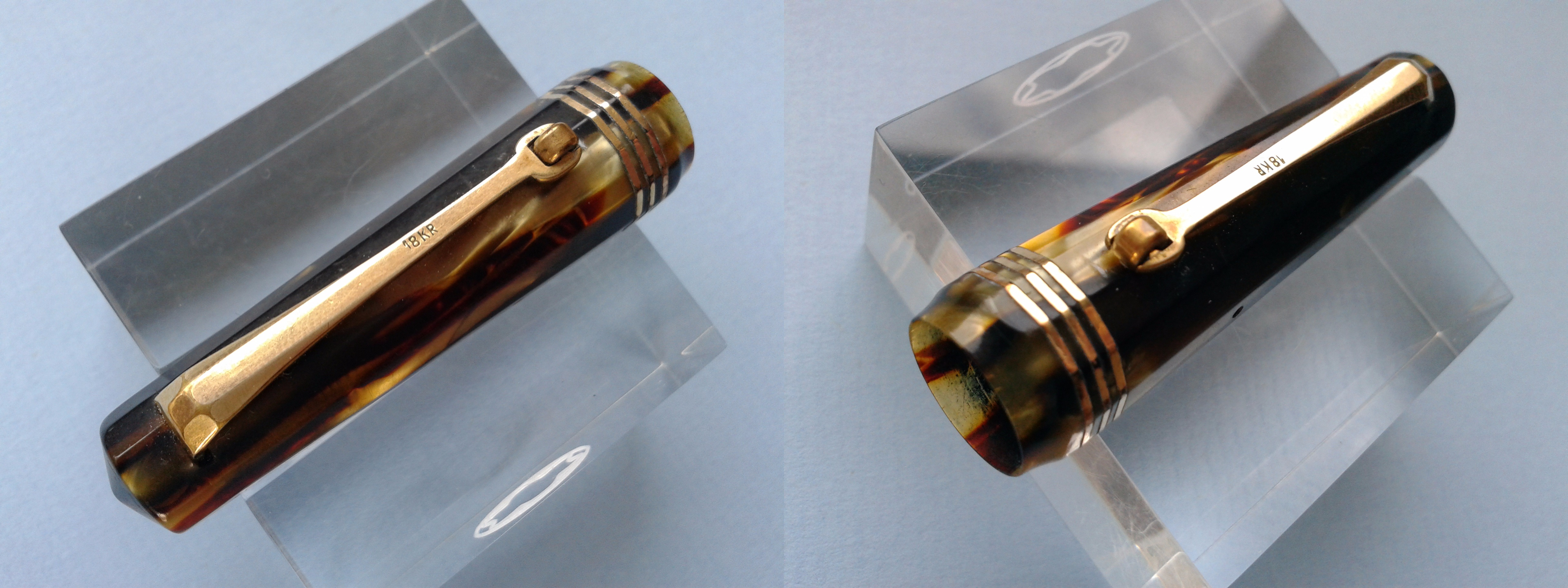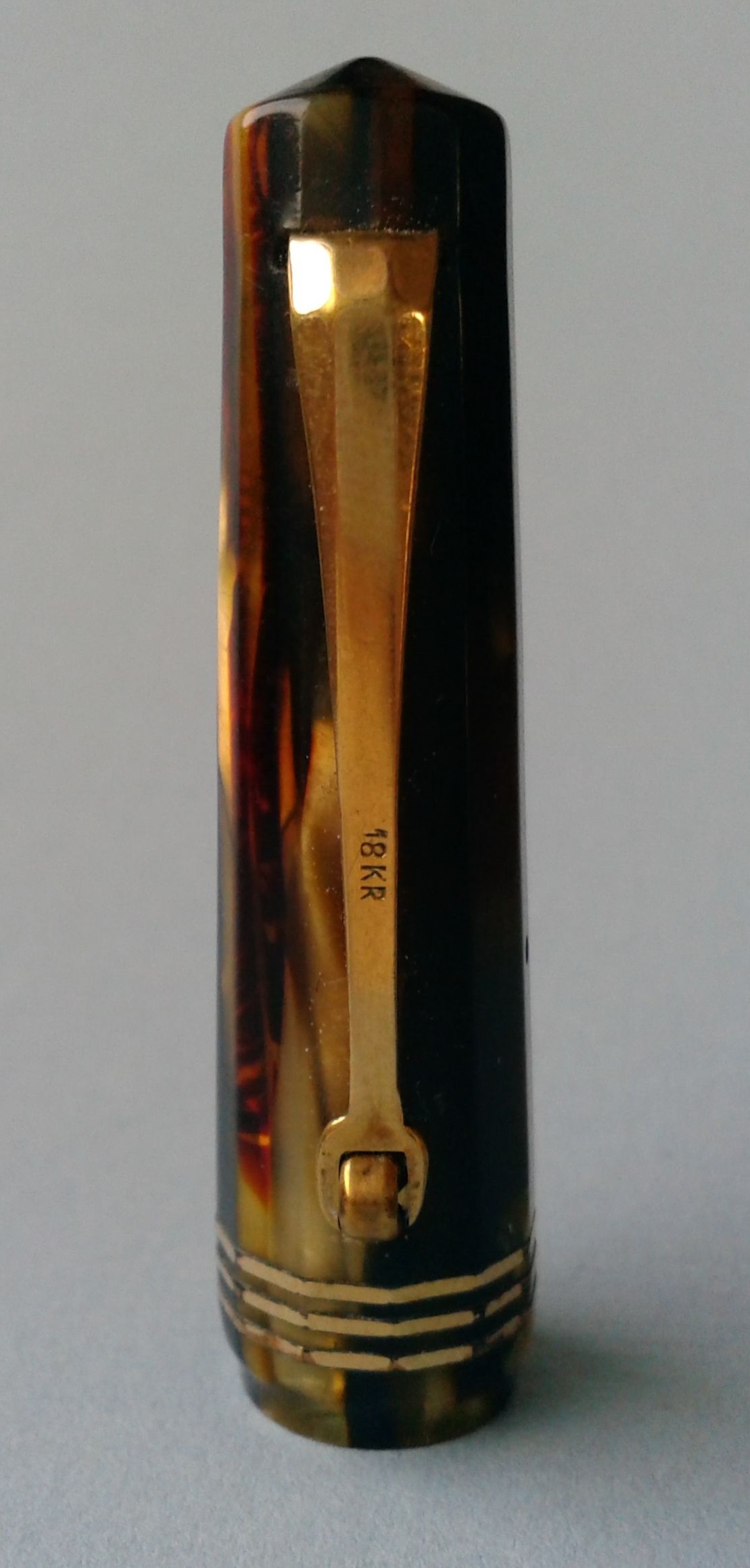 La clip, con l'inconfondibile punzonatura "18KR", su questa lady risulta davvero imponente. Si noti, a questo proposito, la differenza di lunghezza della clip rispetto al cappuccio fra il disegno e la penna nella prima fotografia della recensione: poichè le clip erano uguali per tutte le misure, il modello pubblicizzato è evidentemente di taglia grande.