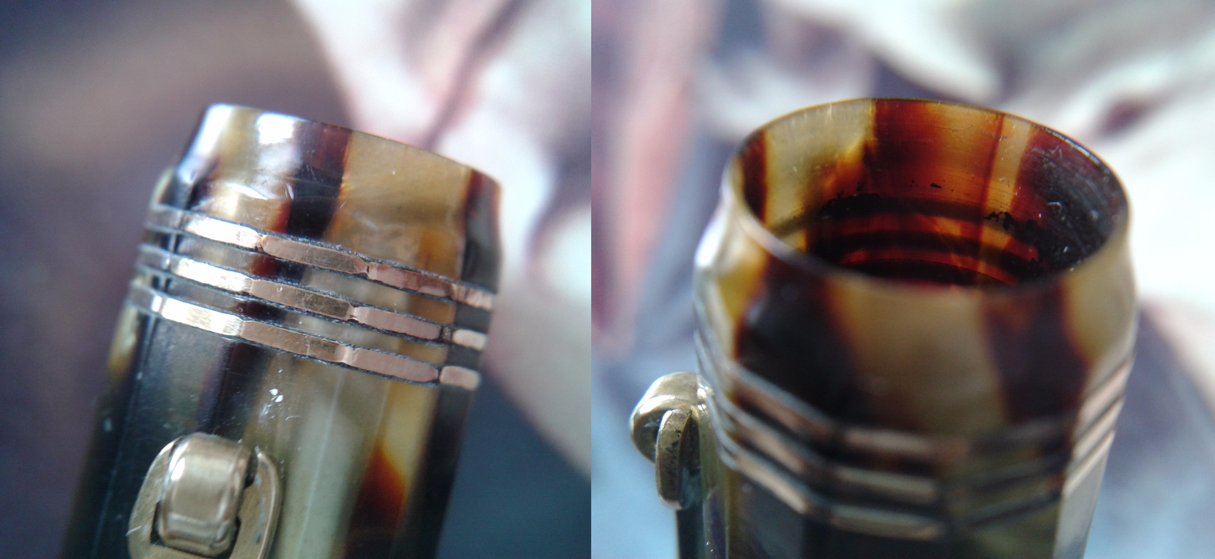 Il labbro del cappuccio è particolarmente pronunciato e mostra anche in trasparenza le striature della celluloide.