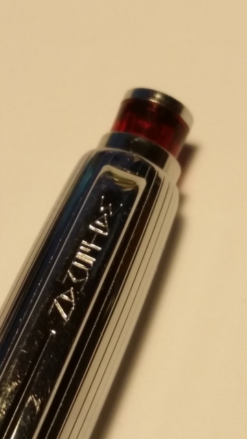 Scrivo oggi a voi per mostrarvi uno strano oggetto che mi è capitato per le mani. In uno dei miei soliti mercatini di paese ho notato in una delle tante bancarelle una sfera semplice, carina, per tutti i giorni. Marchiata Waterman, mi ha incuriosito un piccolo cilindretto rosso trasparente che è apparso sul pulsante di scatto. Purtroppo il meccanismo era inceppato, perciò dopo averla portata a casa, ho provato ad aggiustarlo, senza però alcun risultato. Dopo averla portata in un negozio specializzato per farla controllare (mi hanno detto che il meccanismo non si poteva riparare), l'ho riportata a casa e lasciata in disparte. Pochi giorni fa mi è caduta di mano e si è aperto il meccanismo e ho potuto capire il problema. L'ho sistemata e adesso funziona. Vorrei chiedere a voi esperti qualche informazione, dato che non ho trovato alcuna notizia, su questa strana penna. La sua particolarità consiste nell'apparizione di un piccolo pulsante rosso quando la punta è pronta per scrivere. Come una normale penna a scatto, solo che quando si preme il bottone appare o sparisce questo piccolo settore rosso, in base che il refill sia in posizione di scrittura o meno. Eccovi alcune foto: