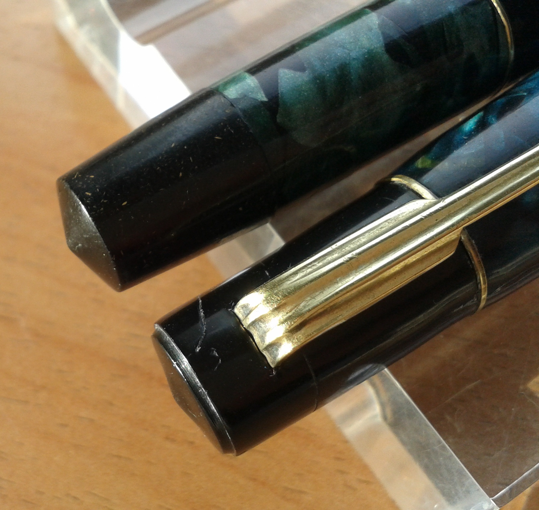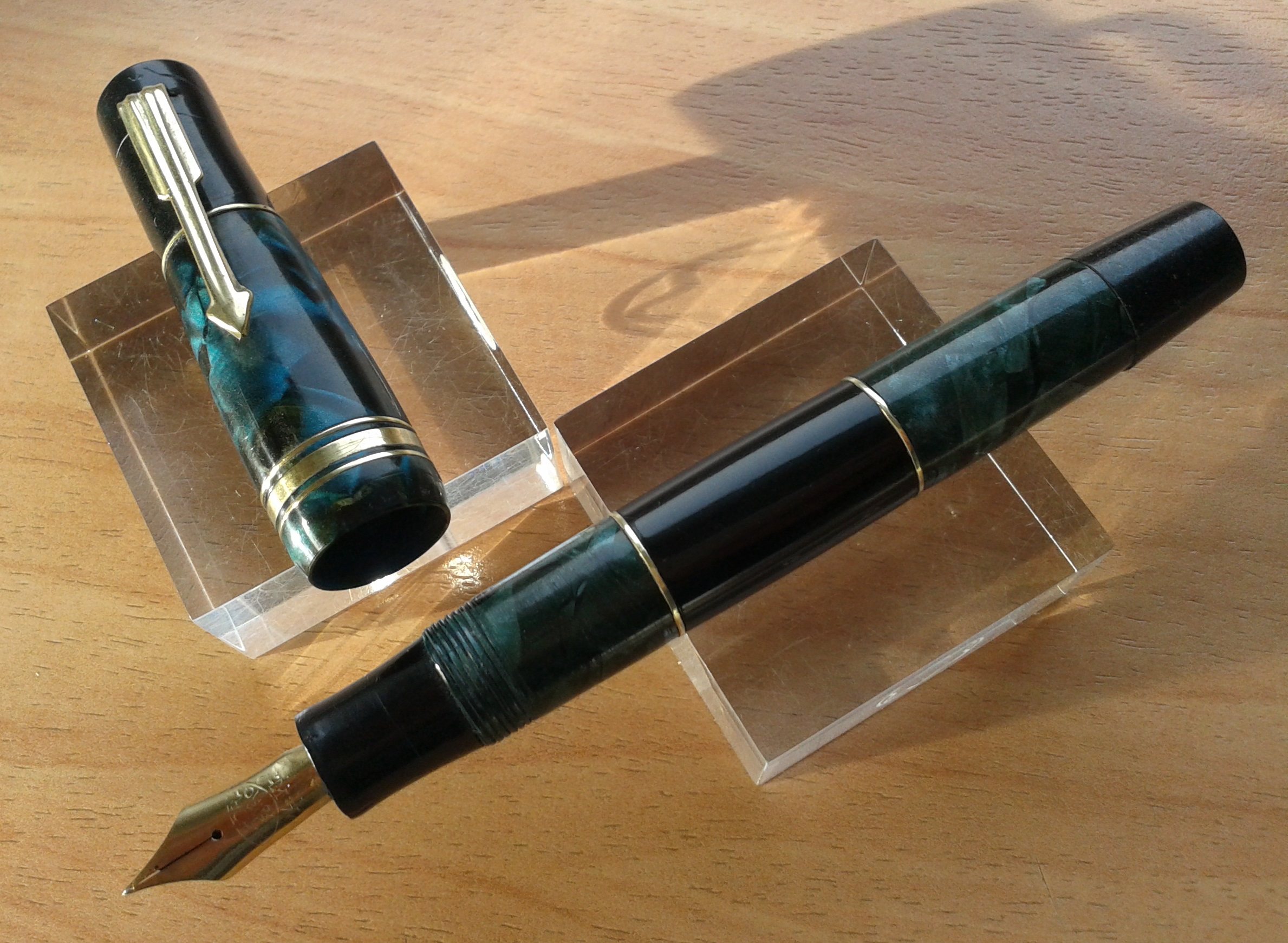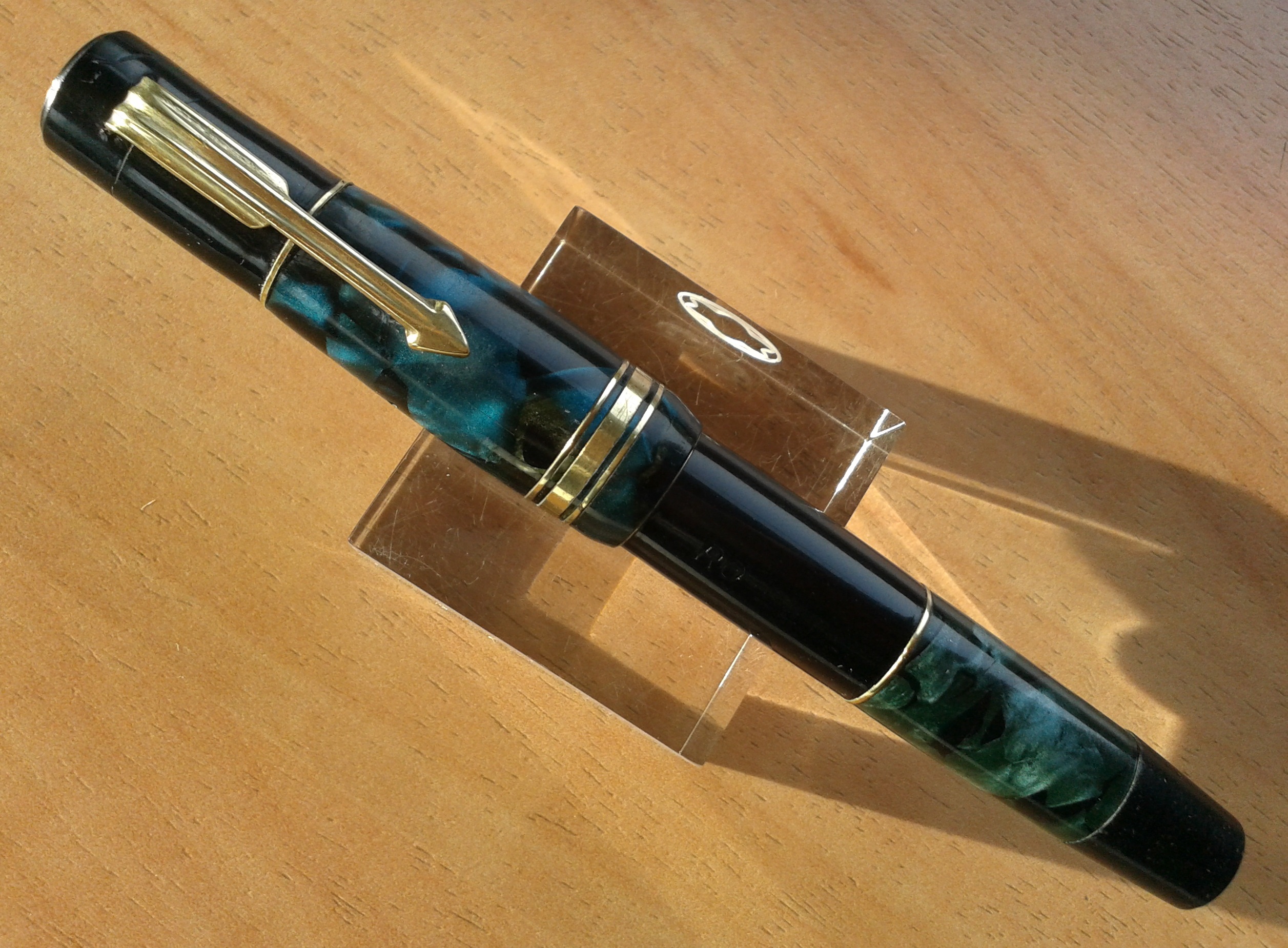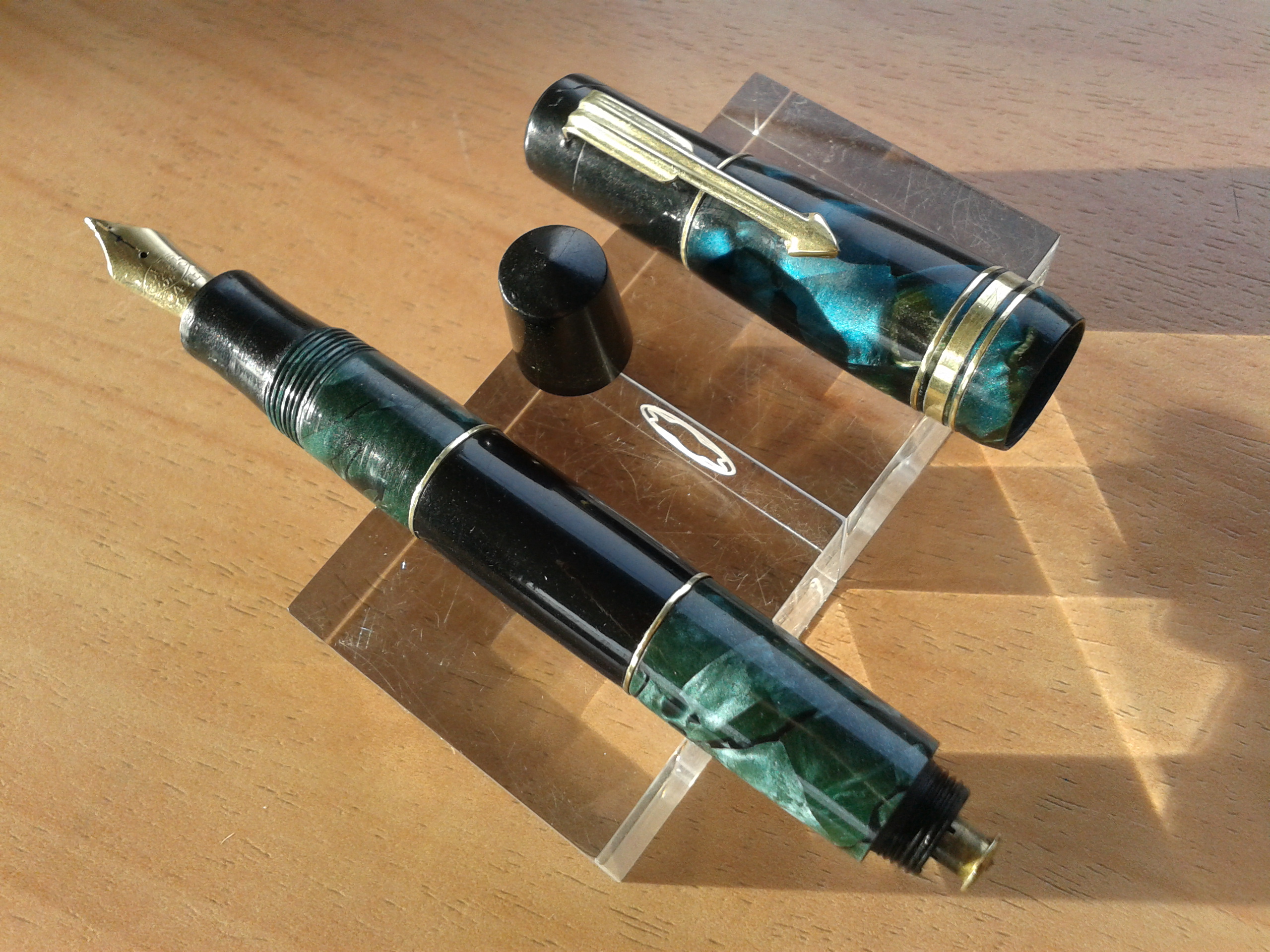 RO-SET modello con celluloidi di due colori, nero e blu marmorizzato, parti metalliche a vista in ottone, pennino in oro 14 Kt. non originale, caricamento a pulsante di fondo, prodotta in Italia dalla ditta ROCCATI, anni 1940.