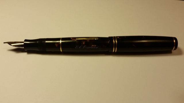 Poche ore fa, mentre tornavo a casa, mi sono imbattuto in un negozietto dell'antiquariato, dove ho scovato, tra le cianfrusaglie, questa meravigliosa pennetta. Lunga chiusa 10 cm, questa piccina è marchiata E.E.Ercolessi, il più storico e famoso negozio di articoli da scrittura di Milano. Fondato nel 1921 (da Edgardo e Elvira Ercolessi), questo negozio è stato per moltissimo tempo il negozio di riferimento per tutti i milanesi. Ancora oggi, seppur di meno, è molto conosciuto, anche se ha perso un po' quel suo vecchio bagliore che lo ha reso così famoso. La penna ha un caricamento a levetta, il corpo e il cappuccio sono in celluloide marrone con dei riflessi meravigliosi (dalle foto che allegherò non si riesce bene a distinguerle). Il pennino originale, molto spesso, è in oro 14 carati. L'anellino sulla sommità del cappuccio, che credo servisse per farci passare un nastrino o una catenina, è purtroppo assente. Mi hanno particolarmente incuriosito le molte verette (ben 5) sia sul corpo che sul cappuccio. Ho ravvivato le incisioni con l'Uni Posca bianco. Purtroppo in rete non ci sono informazioni sulla produzione di stilografiche da parte dell'Ercolessi (sul wiki ho trovato preziosi informazioni) e quindi non riesco ad identificarne il modello. Vi allego in aggiunta qualche foto: