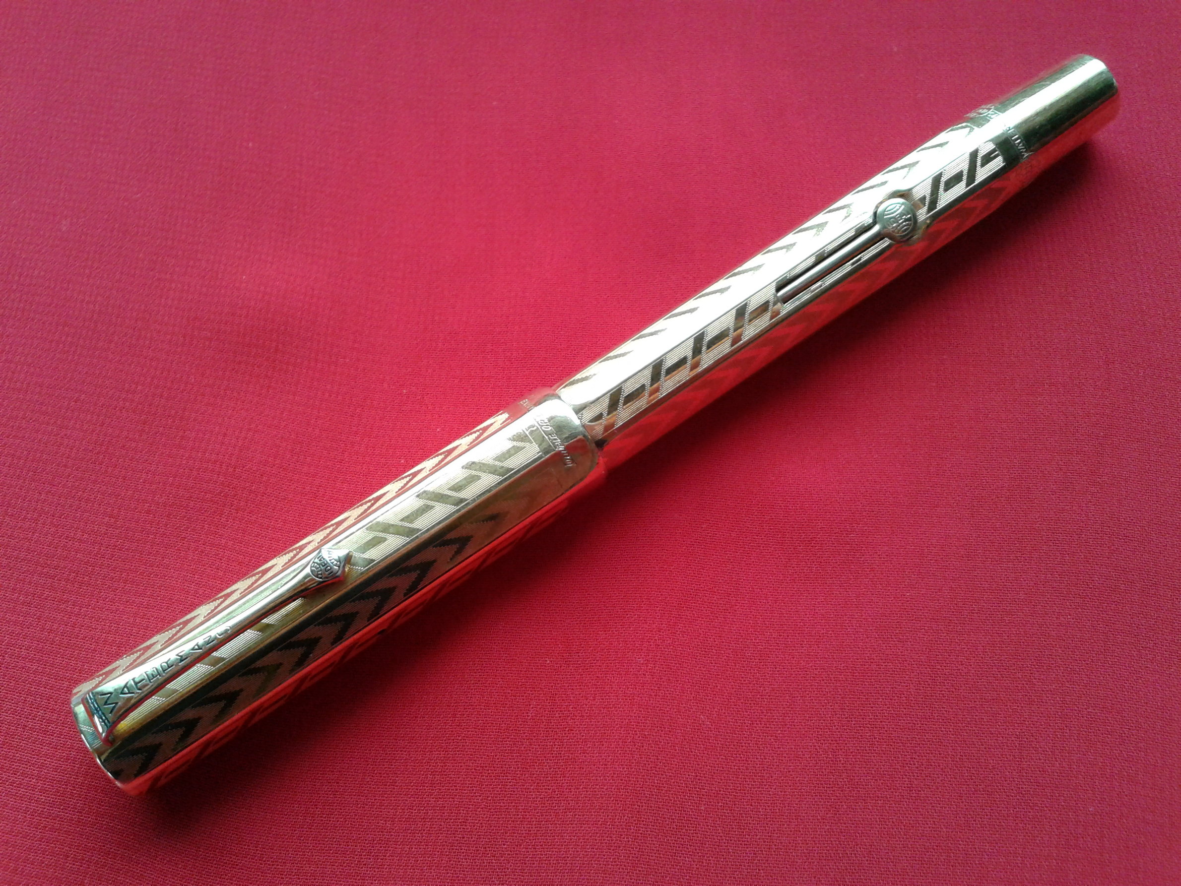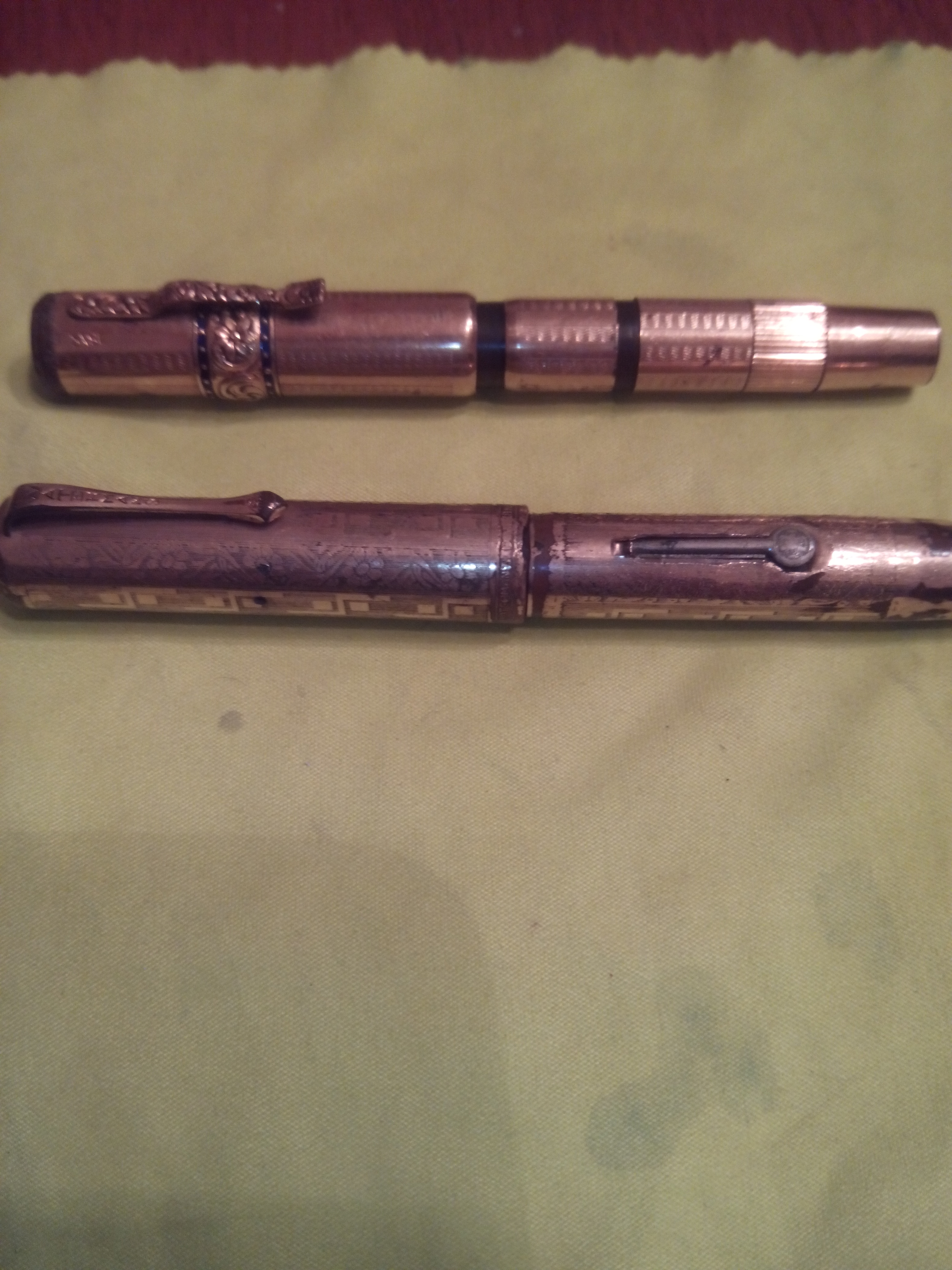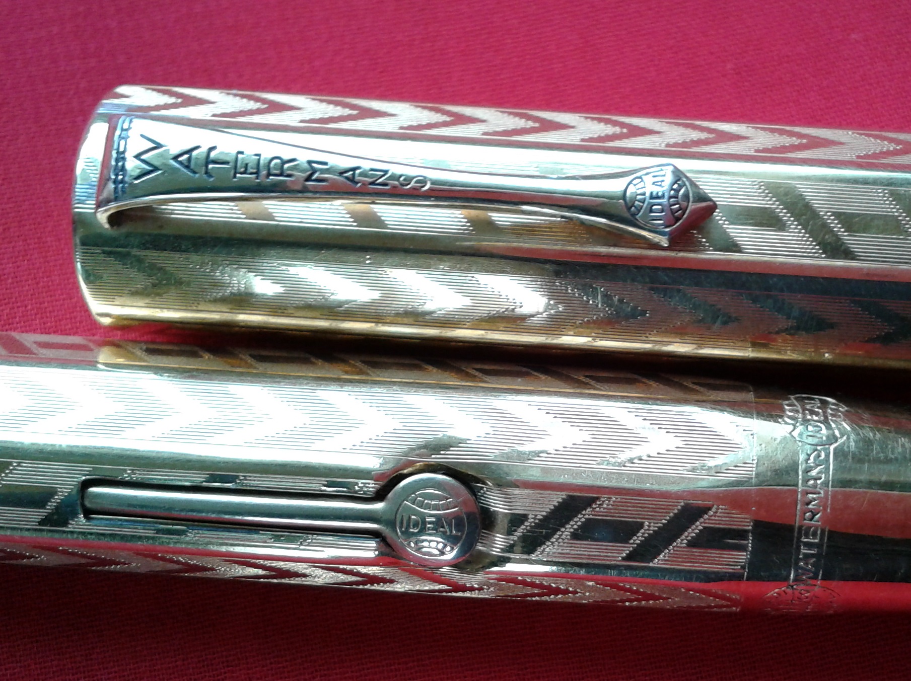 La penna marchiata Waterman potrebbe essere una Waterman 52 (anche se le proporzioni non sembrerebbero rispettate nelle foto, e quindi potrebbe essere una 52 1/2 V) con rivestimento della Fratelli Cavaliere di Milano, che ha fatto questa mia: