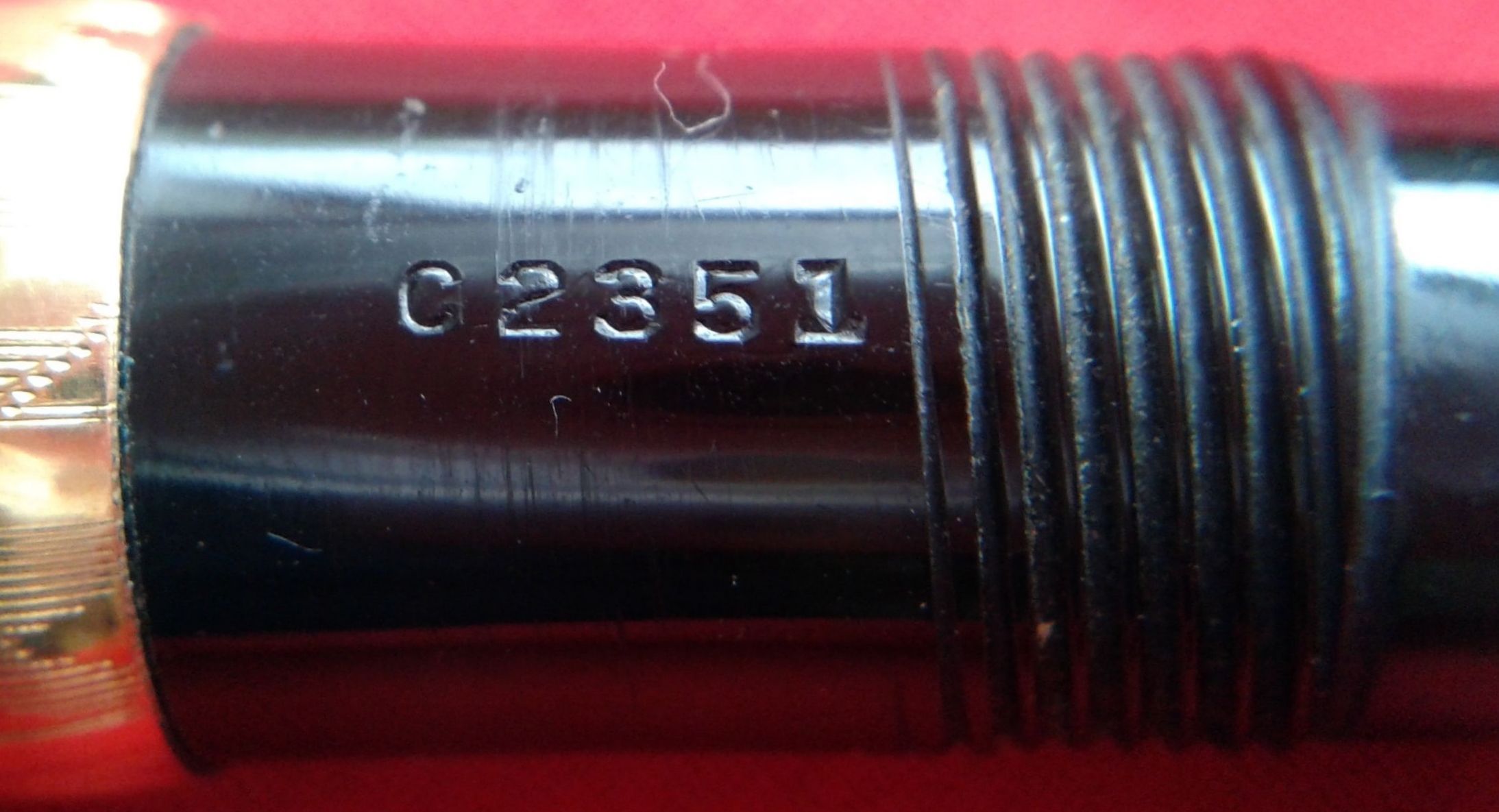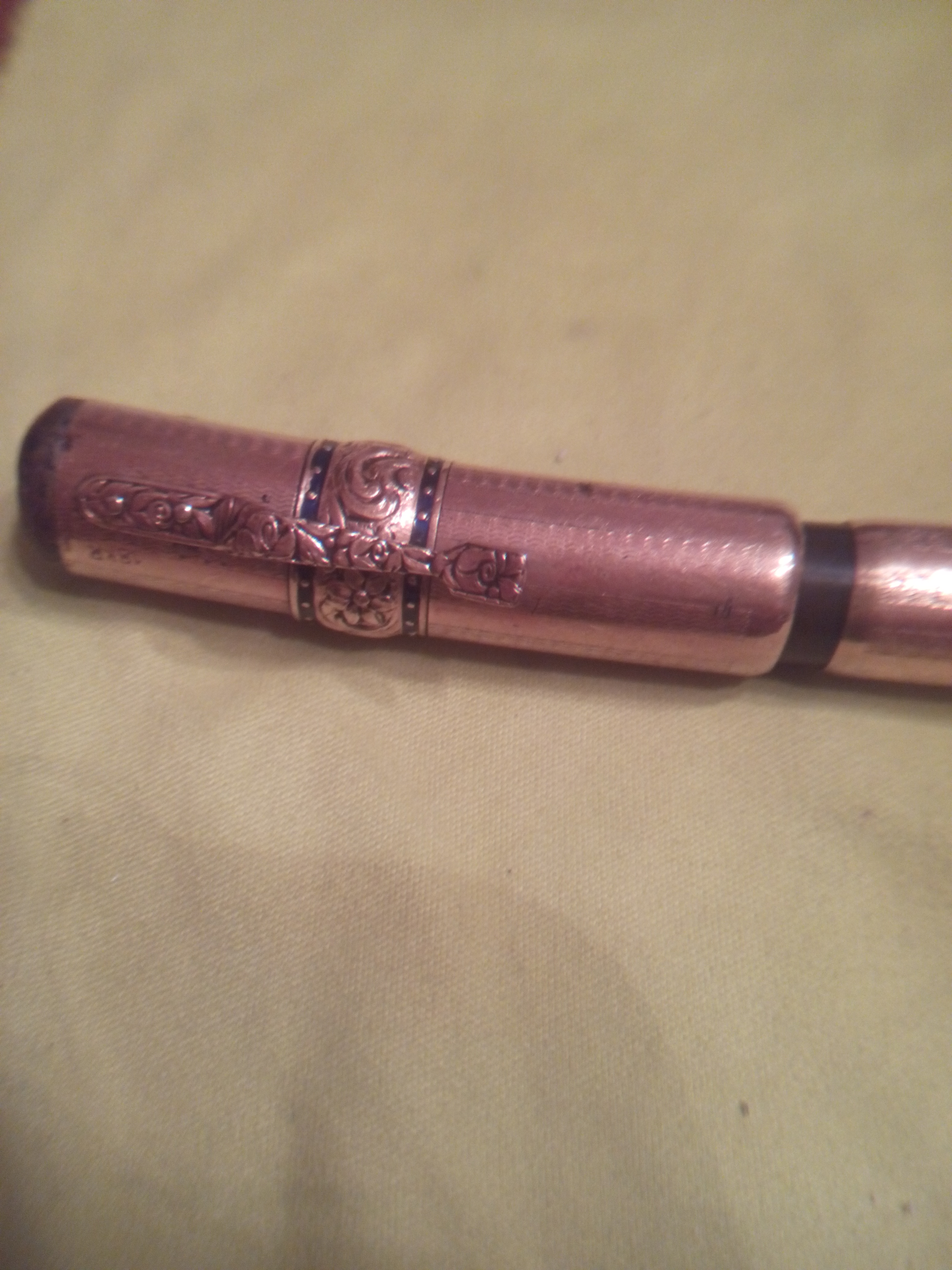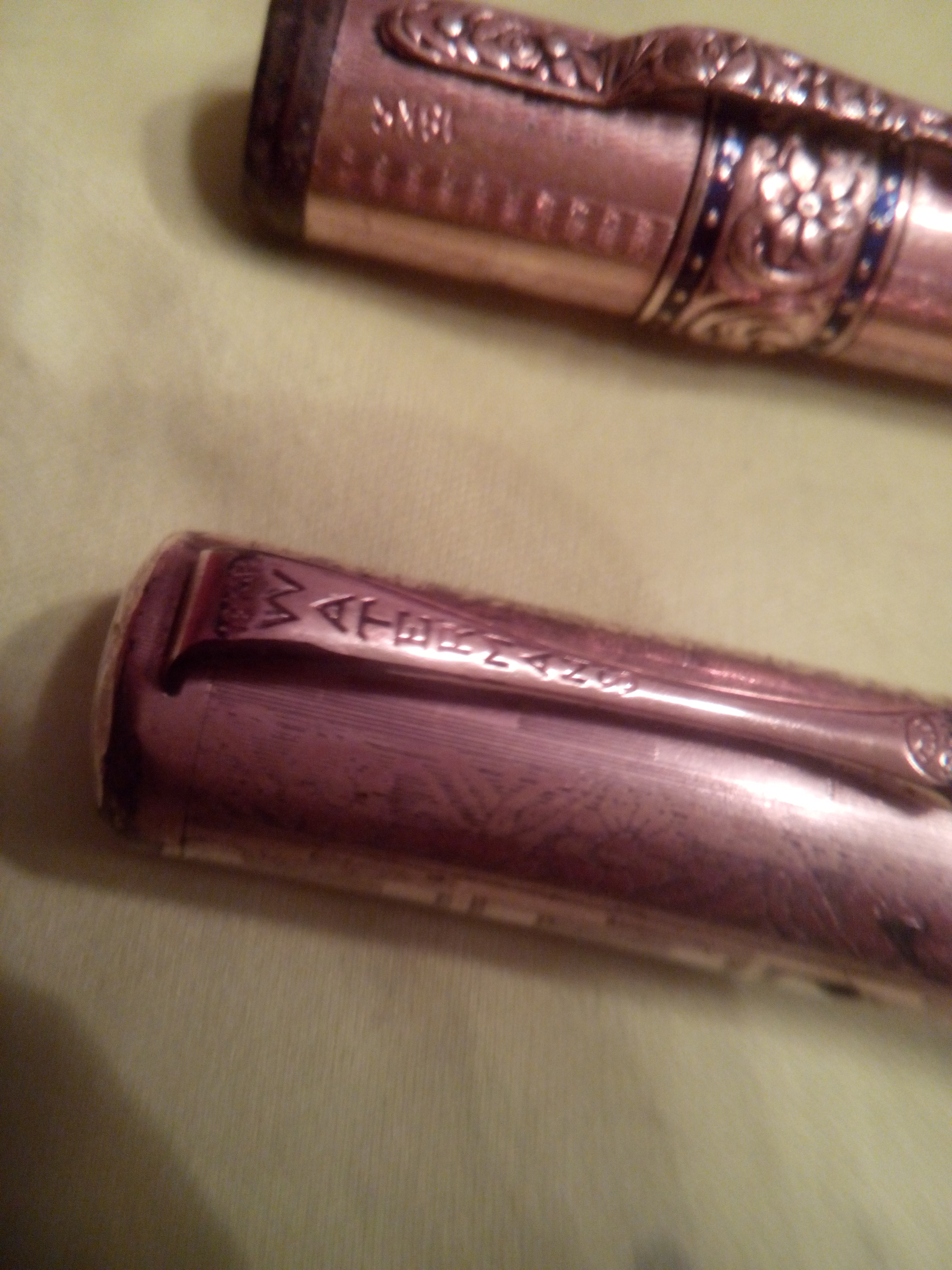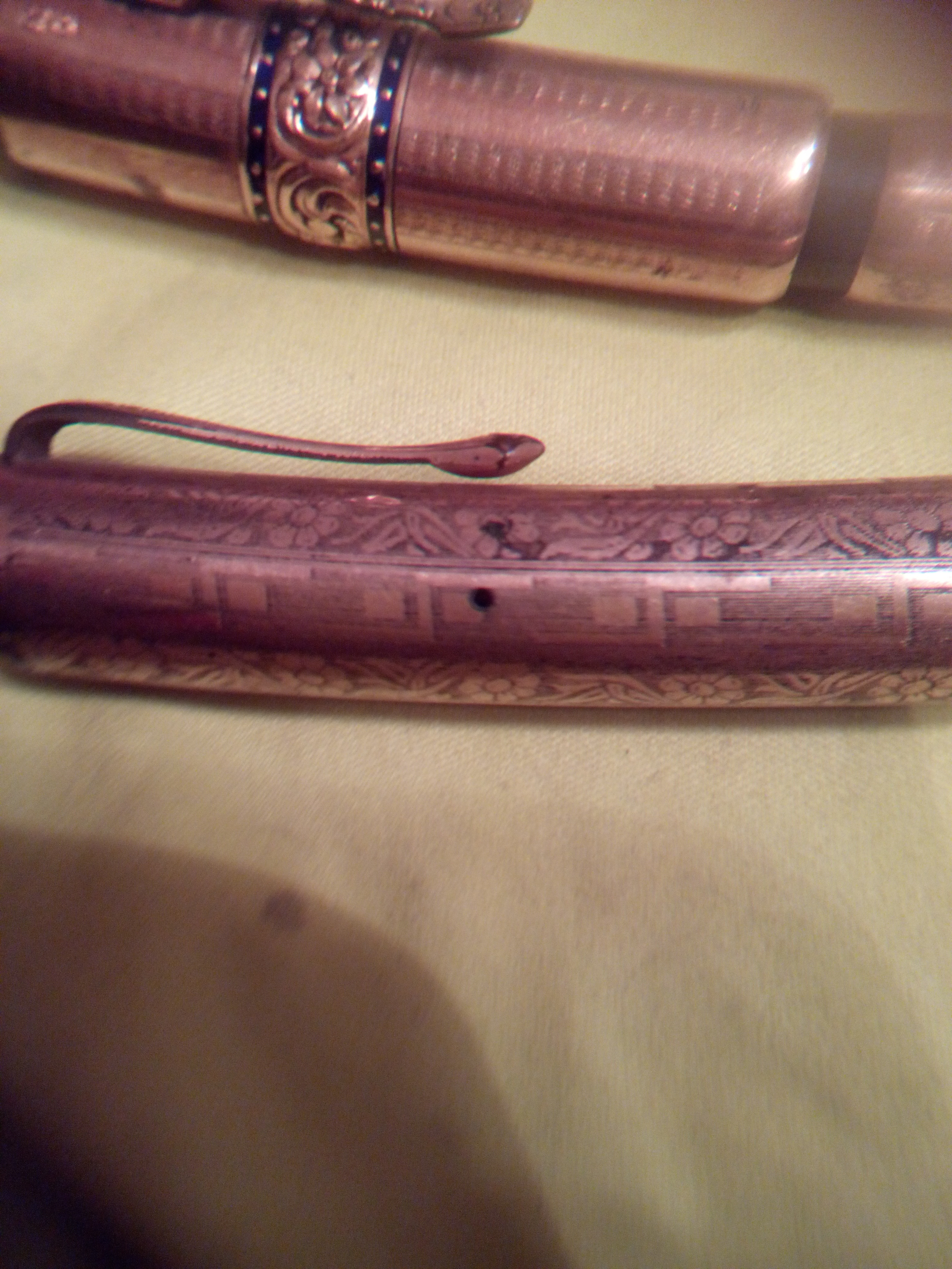 La penna marchiata Waterman potrebbe essere una Waterman 52 (anche se le proporzioni non sembrerebbero rispettate nelle foto, e quindi potrebbe essere una 52 1/2 V) con rivestimento della Fratelli Cavaliere di Milano, che ha fatto questa mia: